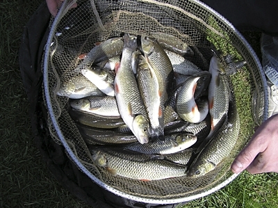 Na úvod hádžem do vody 7 gulí krmiva plných červov, piniek a varených kostniakov, ktoré som si ráno pripravil doma. Postup je asi taký, že do nádoby s červami nalejeme dostatočné množstvo vriacej vody a počkáme, kým sa červy kvázi neuvaria. Spoznáme to podľa toho, že úplne zbelejú. Potom ich preložíme do studenej vody, a tak ich aj transportujeme, pretože inak by sčerneli.