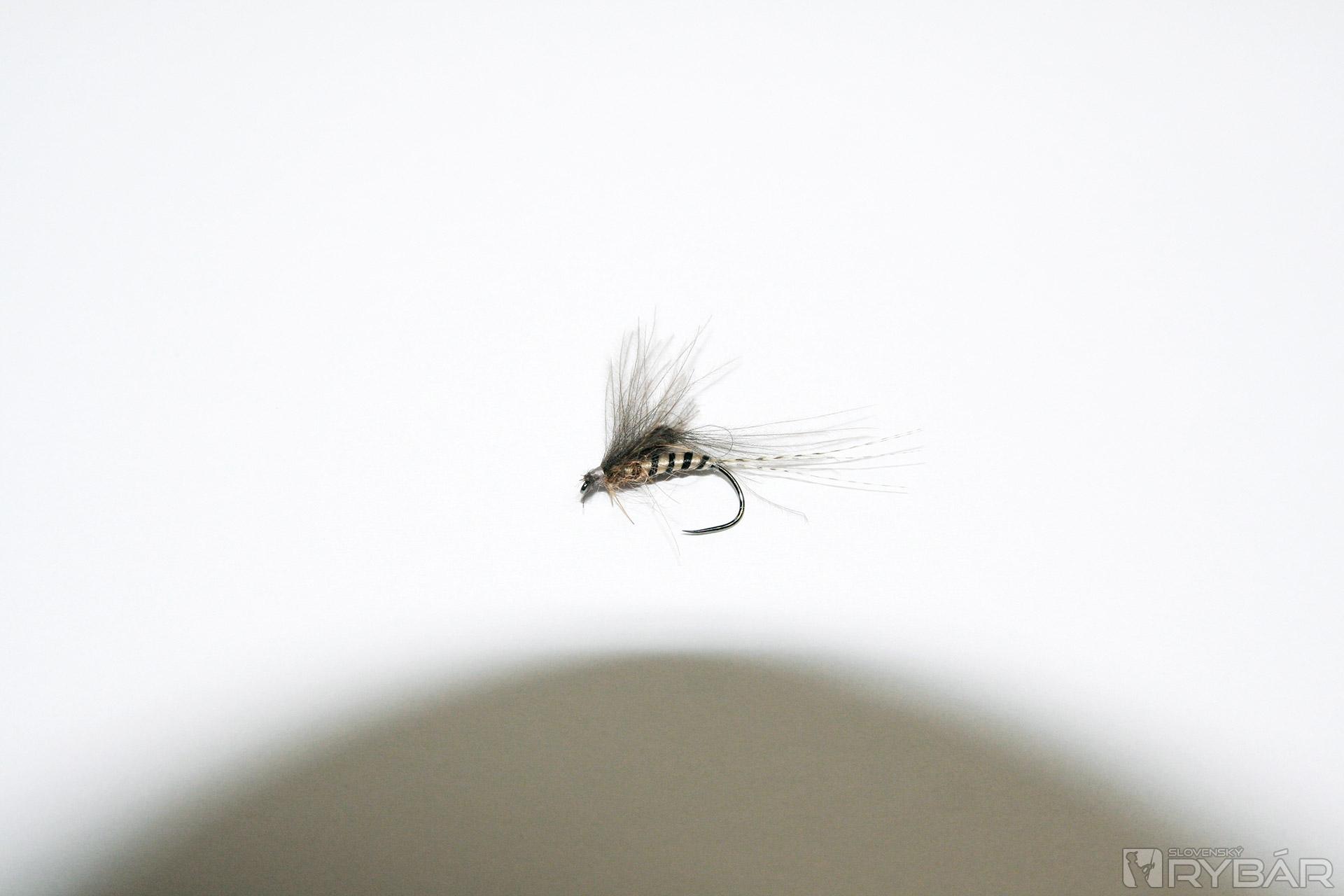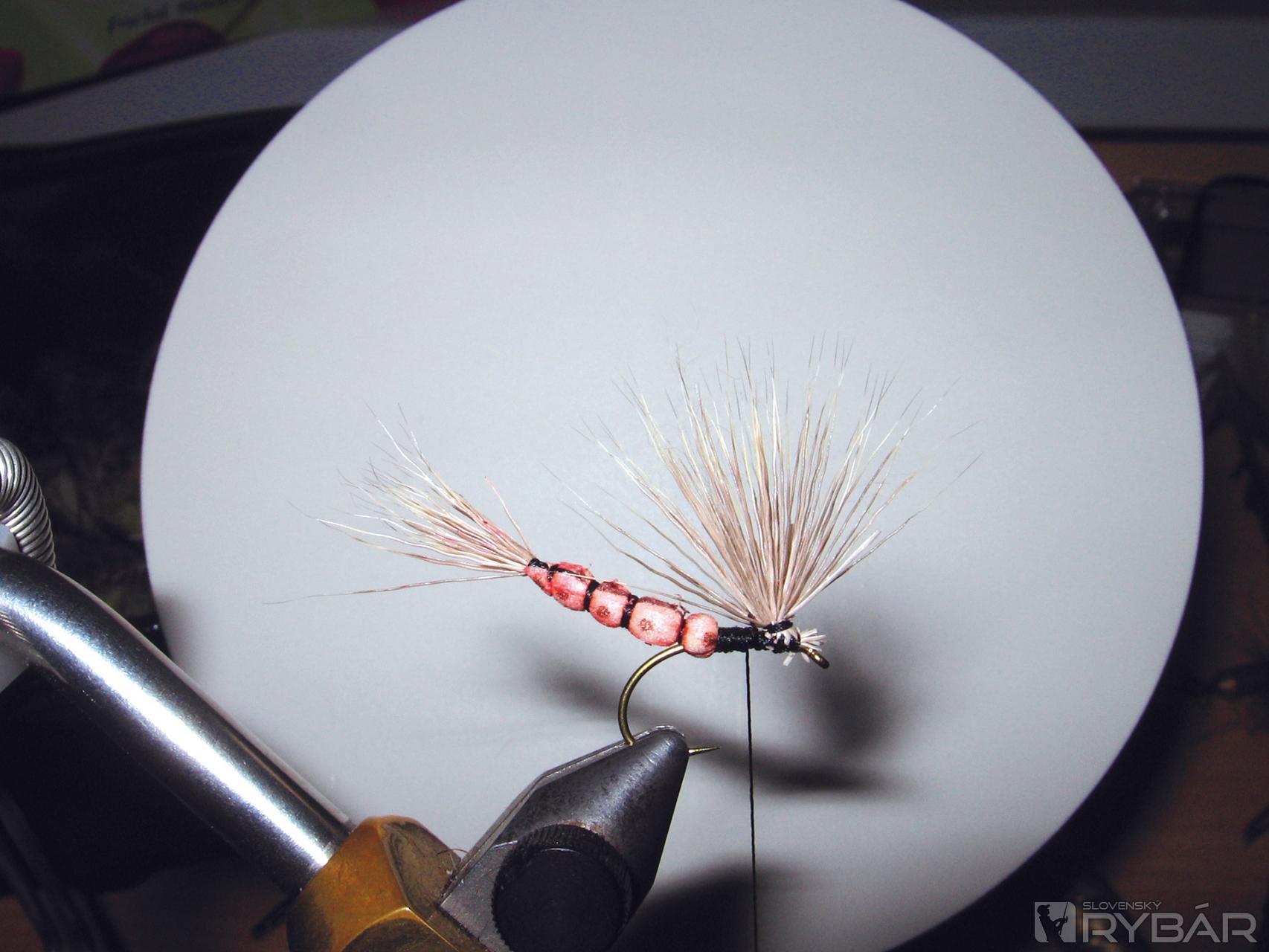 Parašutovým spôsobom navinieme okolo srsti kosierik. Muška je hotová.