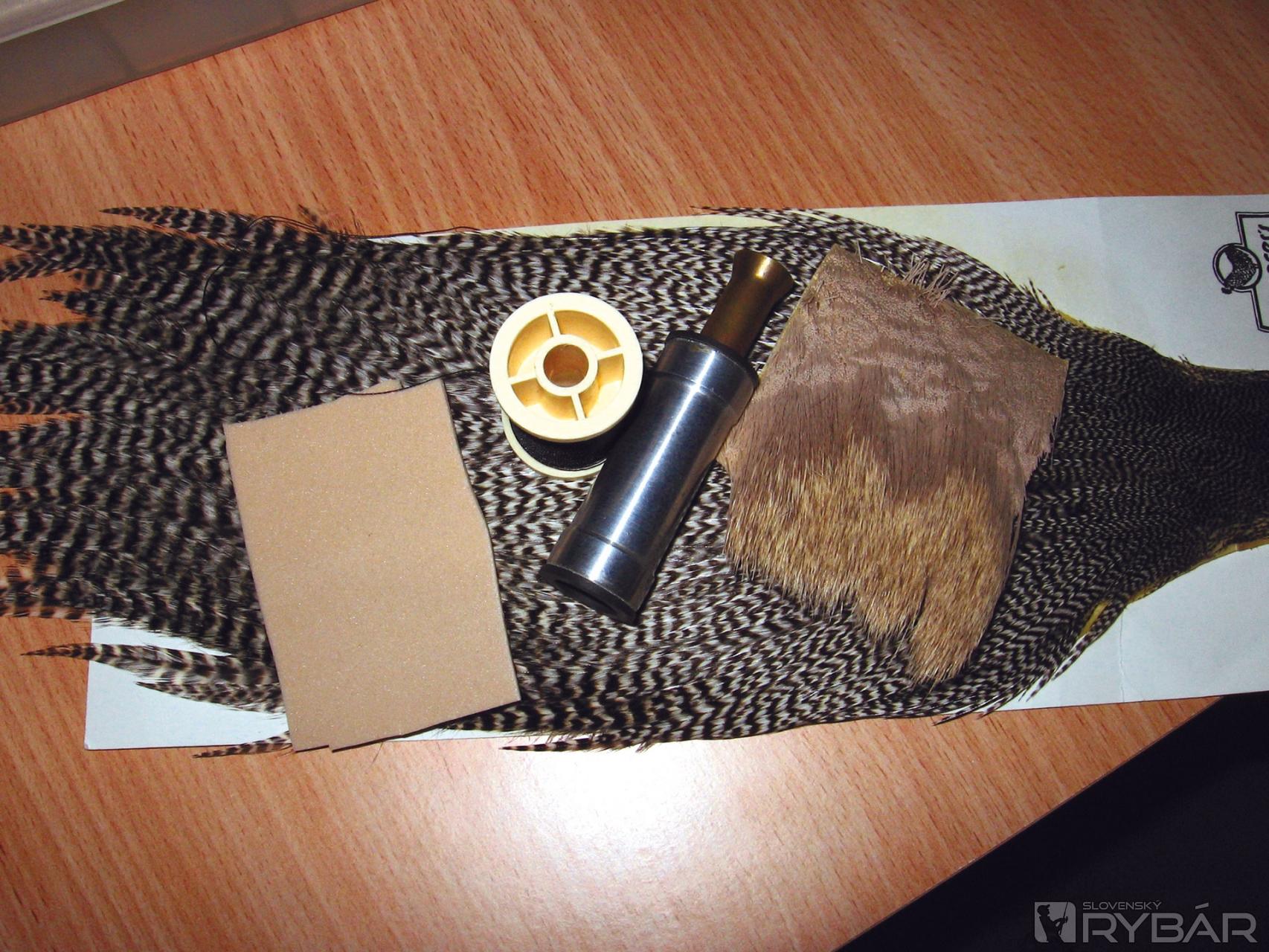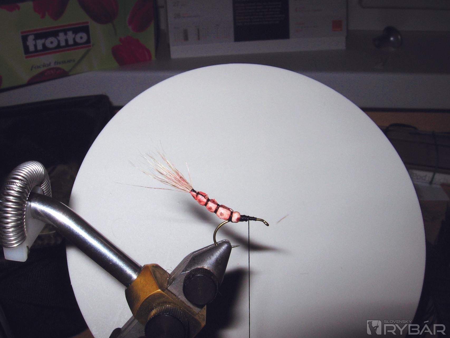 Malým množstvom dubbingu nadubbujeme telíčko a zafixujeme kosierik z kohúta.