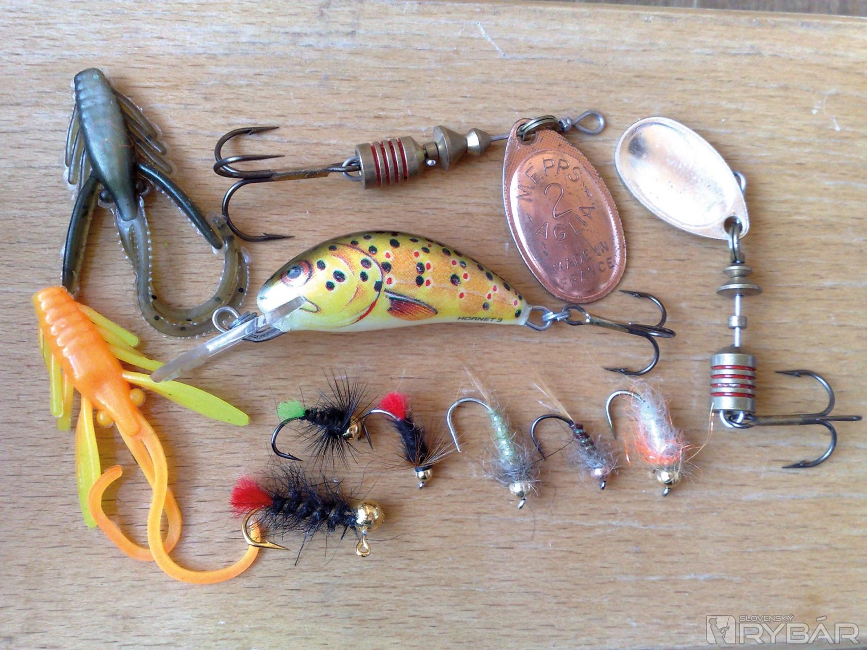 Keby som mal vymenovať zopár nástrah, ktoré používam najčastejšie a v podstate pri love na všetkých typoch vôd, boli by to: 3 cm vobler – plávajúci potočák, strieborný a medený rotačný blyskáč, jednoduchá mokrá muška – gold cop – so zlatou hlavičkou vo všetkých možných variáciách, najmä však tých najjednoduchších a v súčasnosti veľmi obľúbené „voňavé“ nymfy – olivové a oranžové nevyhnutné gumičky. Tieto nástrahy sú moje srdcovky. Po viacerých rokoch ich intenzívneho používania na pstruhovej rybačke som si istý, že sú moje NAJ NAJ.