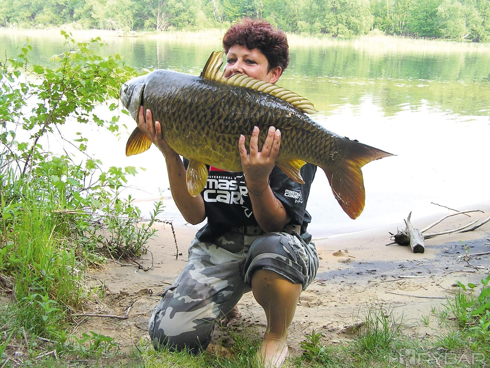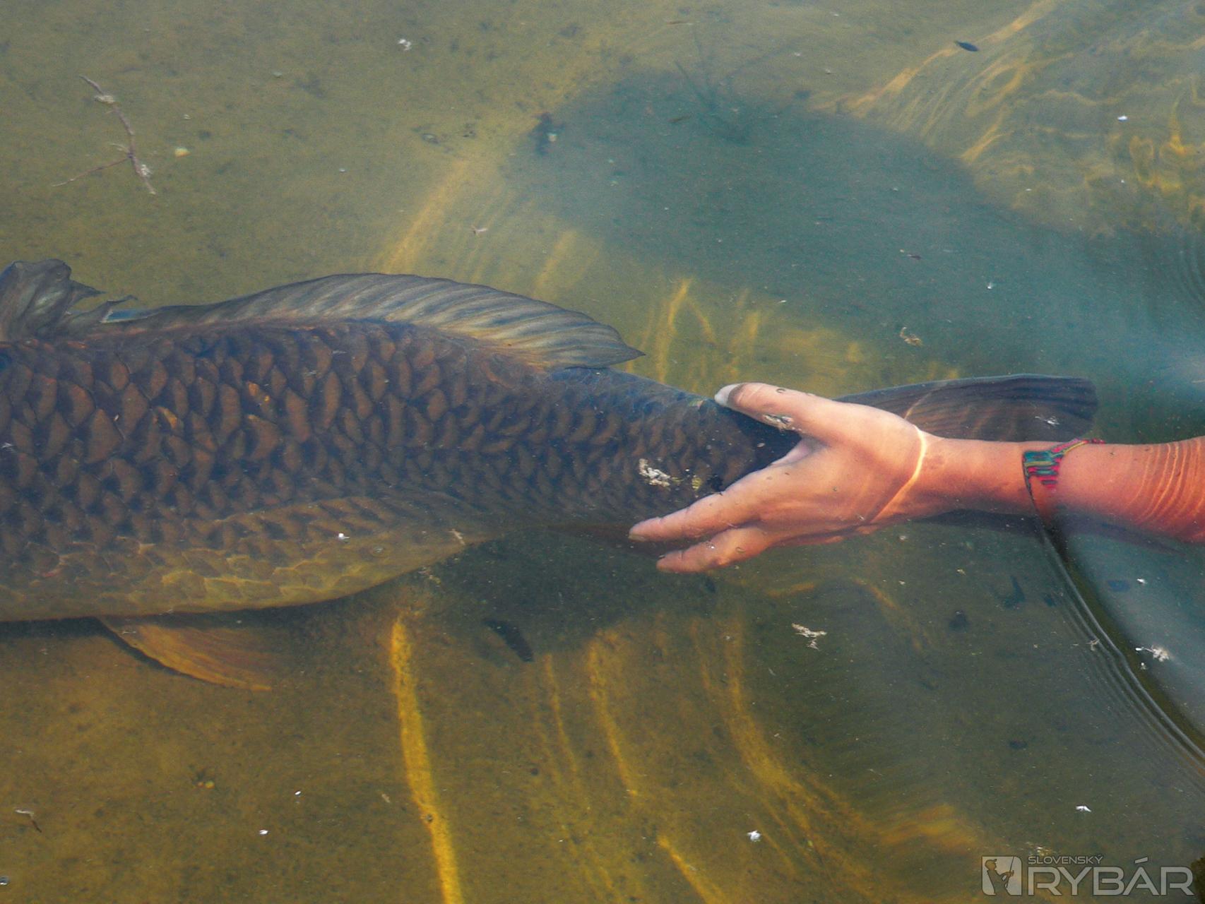 Naviedla som si ho do neďalekej plytčiny pri brehu. Všetko potrebné, ako podberák alebo sak, bolo asi 50 m na brehu. Odniesla som krásneho zdravého kapra v náručí, doslova ako bábätko, aby som ho odvážila a zavolala cez vysielačku niektorú z manželiek súťažiacich, aby mi urobili pár fotiek s mojím prvým, zatiaľ podľa vzhľadu najväčším kaprom.
