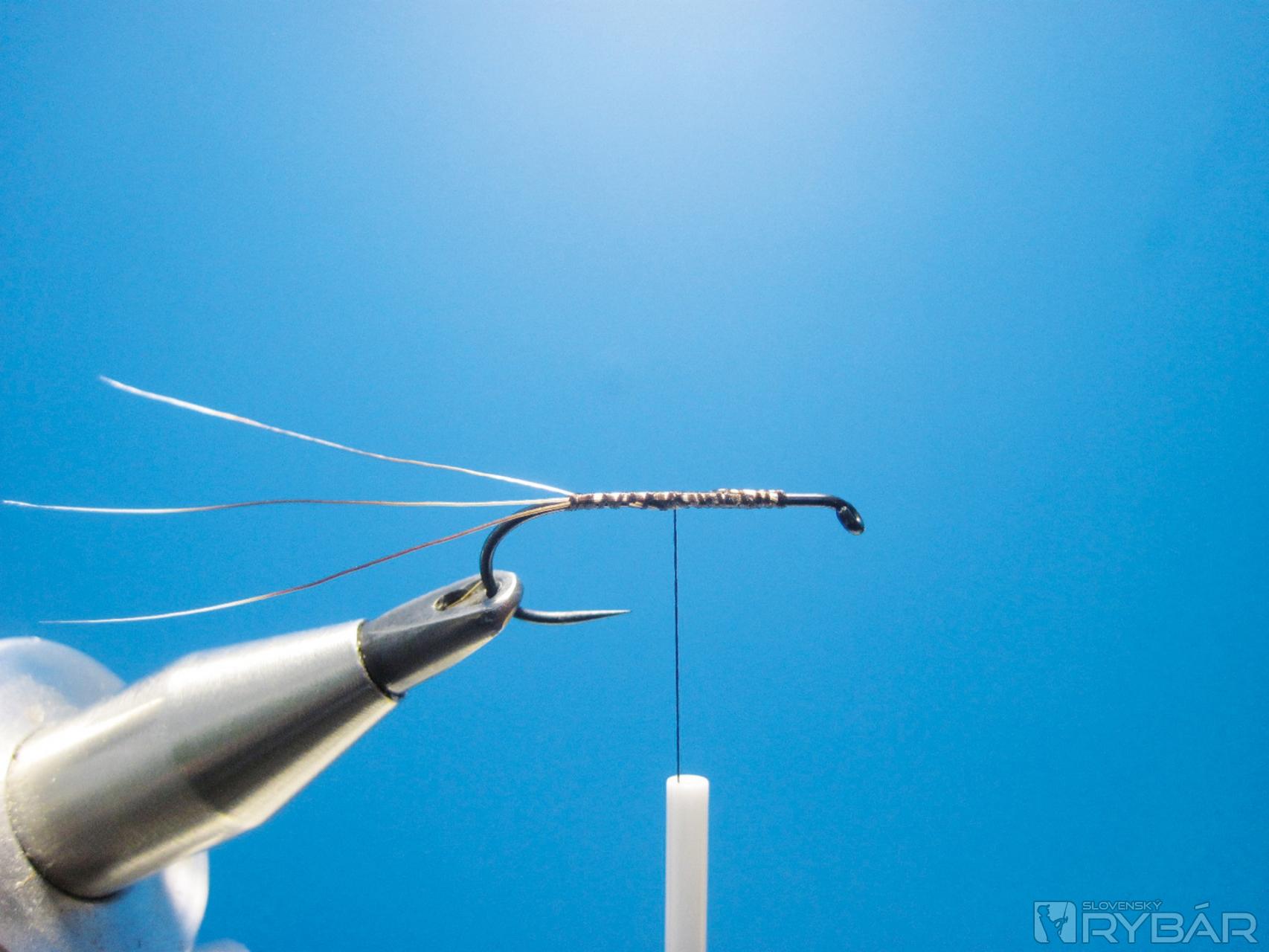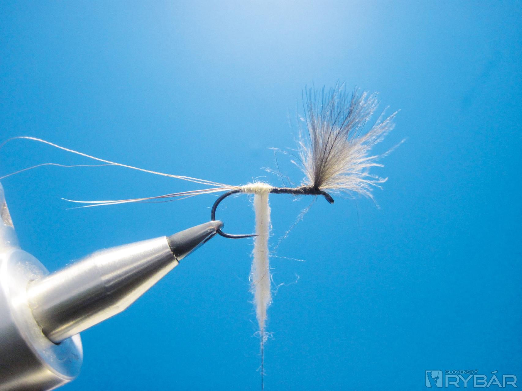 Odstrihneme zvyšok polycelónu, ukončíme strateným uzlom a muška je hotová!