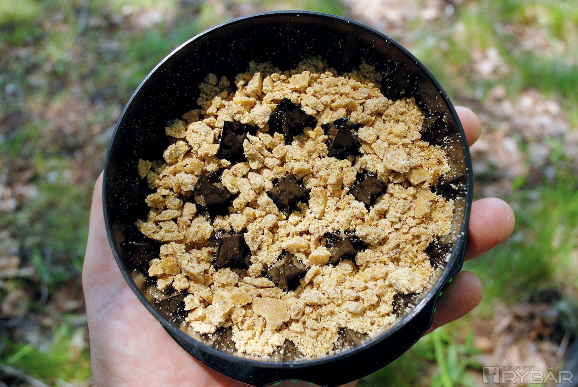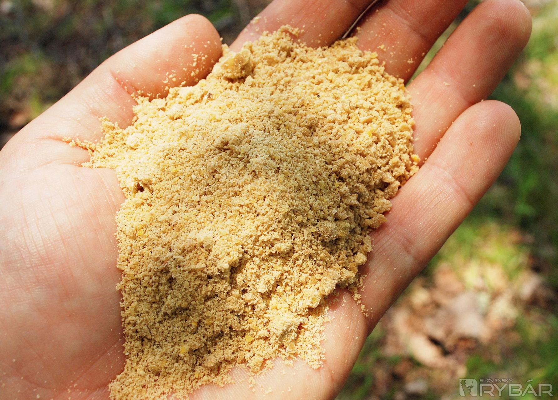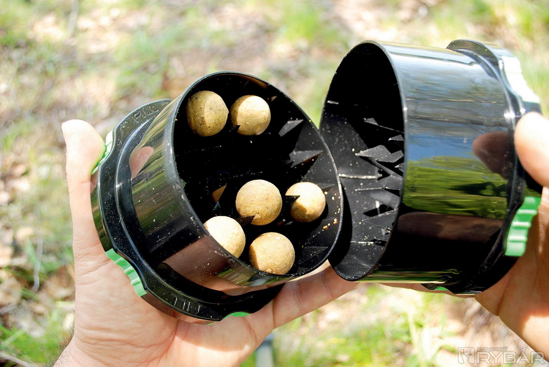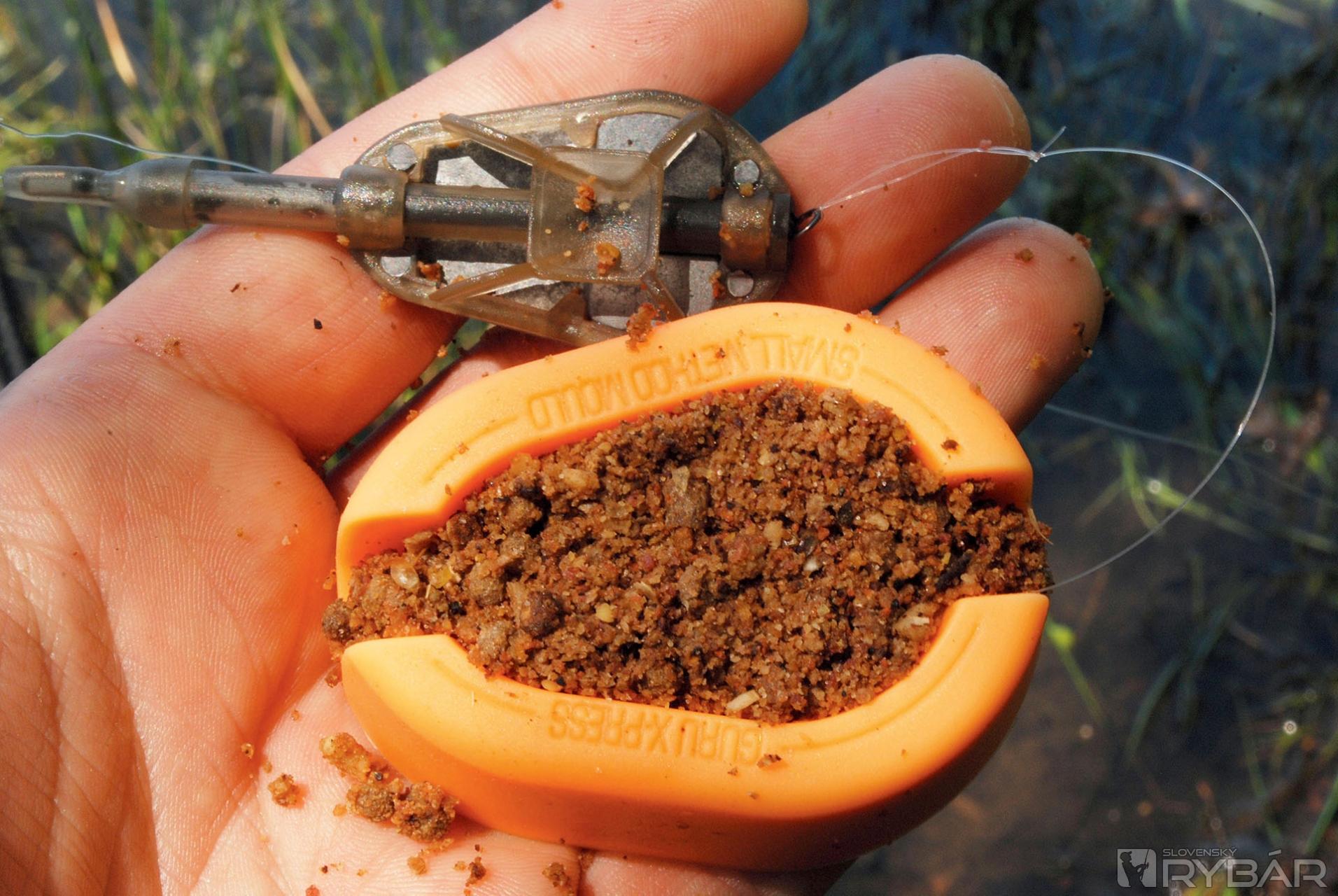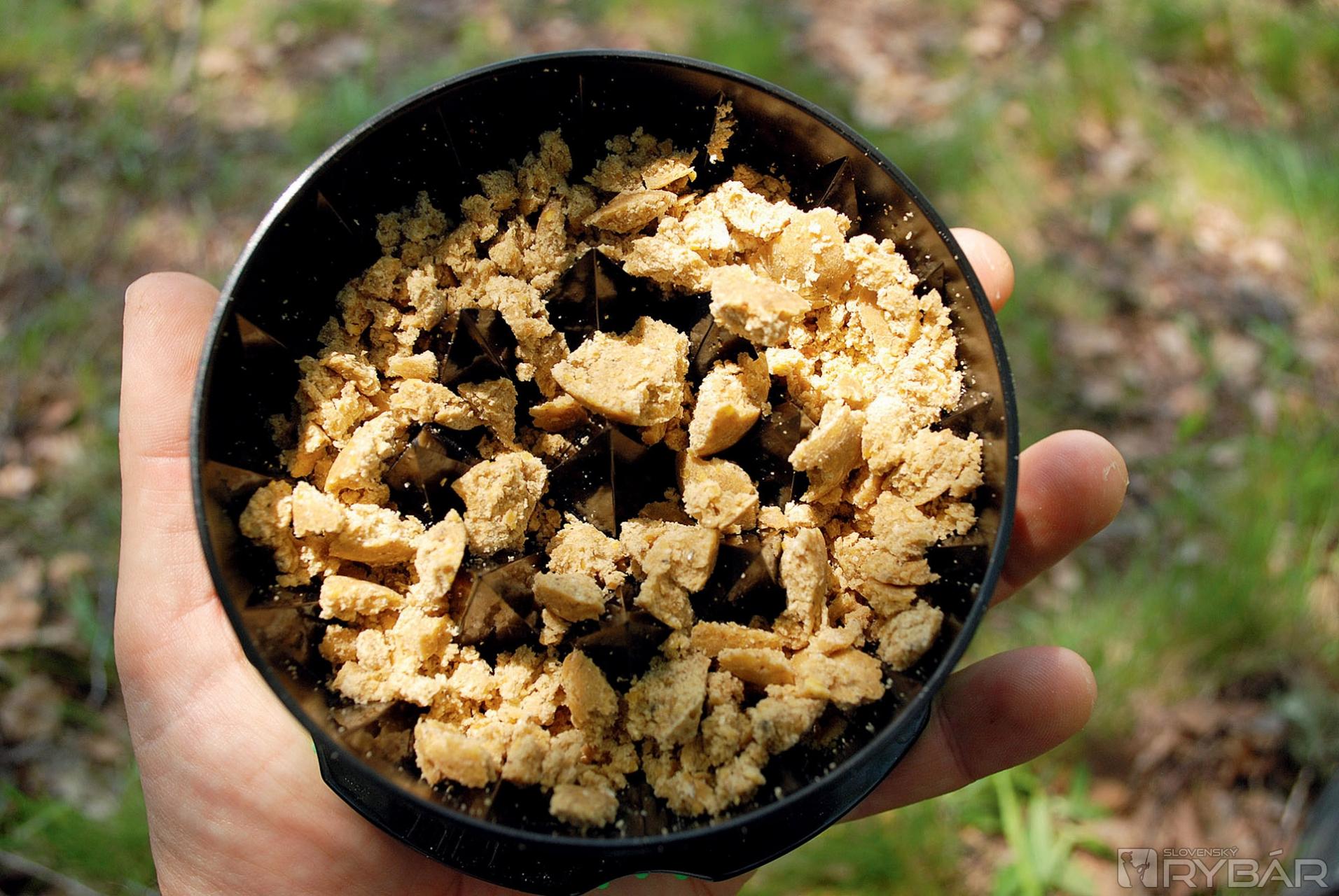 Často začínam s veľkým priebežným kŕmidlom, aby som si miesto dobre rozkŕmil. Nepotrebujem predsa rozkrmovať kŕmnymi guľami, keď sa mi na miesto stiahnu ryby. Moja 40 cm montáž pozostávala z háčika MWG veľ. 16 a za nástrahu som si zvolil 3 kostné červy. Krmivo obsahovalo tri zložky programu Nutrabaits: krmivo „Trigga Carp feed“, method mix „SCF method mix“ a guľôčky „Trigga boilies“, ktoré som rozdrvil v Krusha. Túto pomôcku používam pomerne často, drvím boilies, semená, pelety atď.
