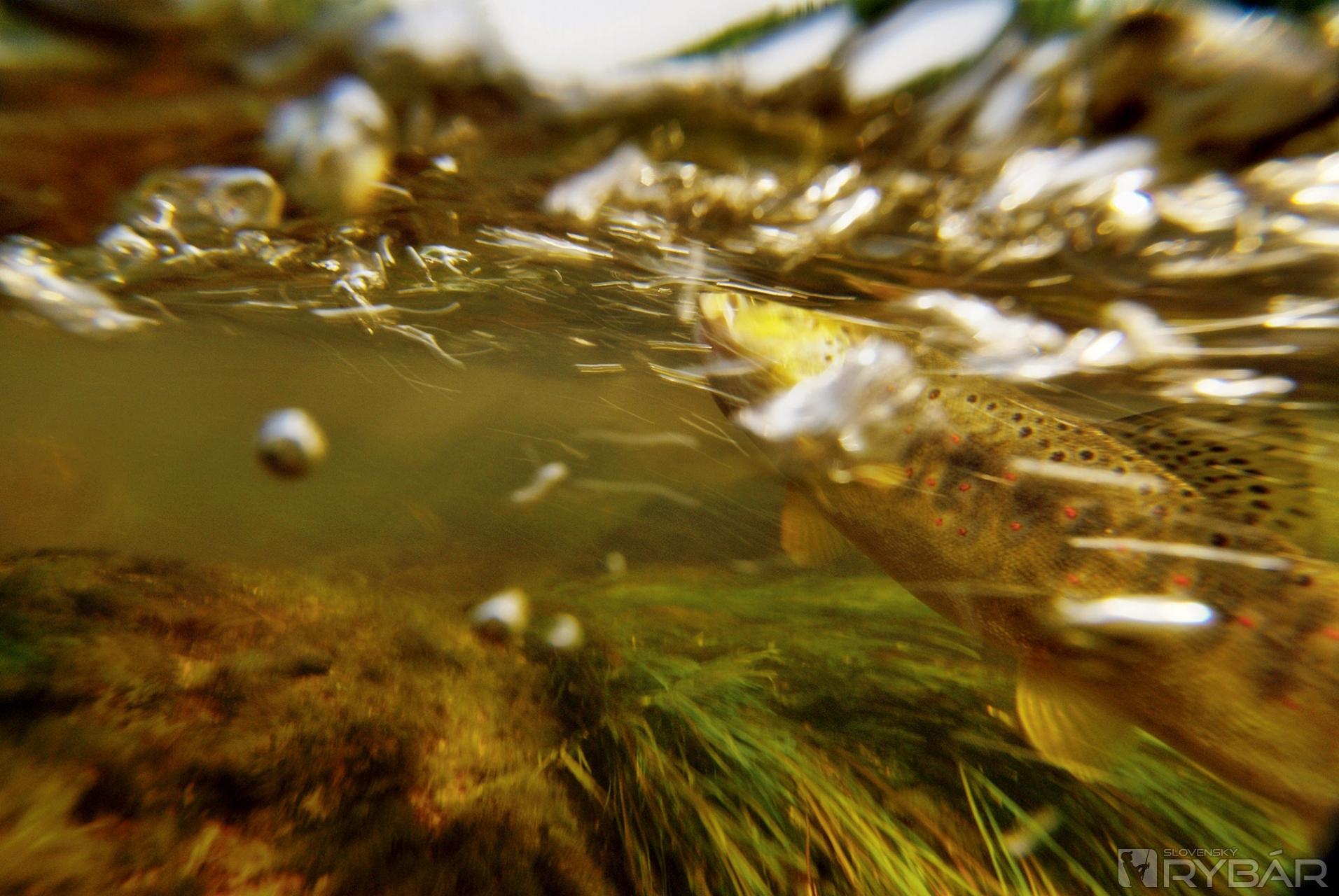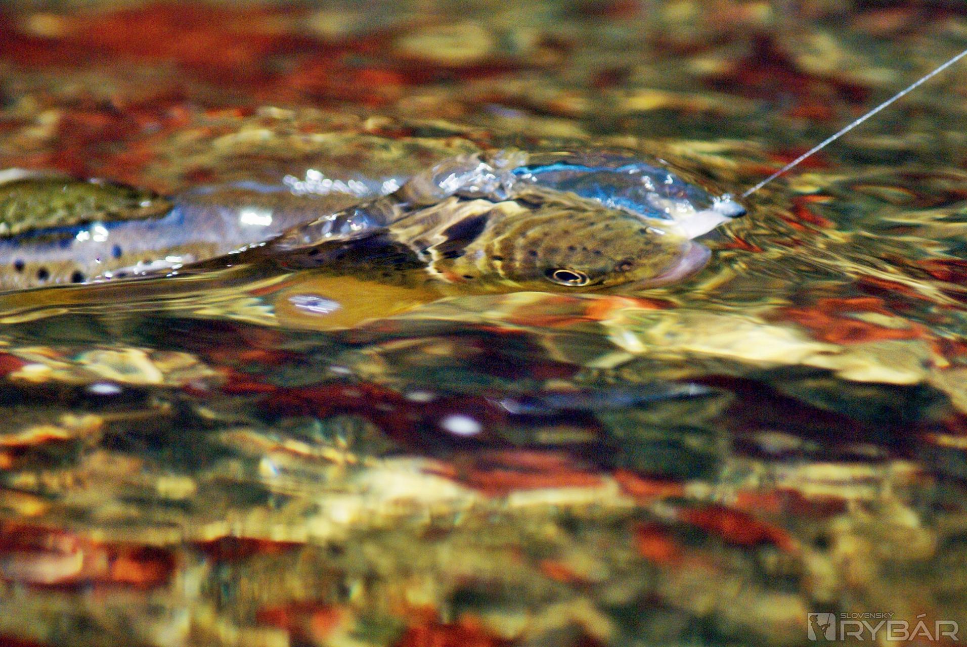 Tesne po dopade nástrahy do vody, v tom istom okamihu cítim prudký náraz pstruha do gumenej rybky. Bez mojej pomoci sa sám napichol na háčik. Silný prúd ho vynáša ku hladine z bezpečia jeho úkrytu.