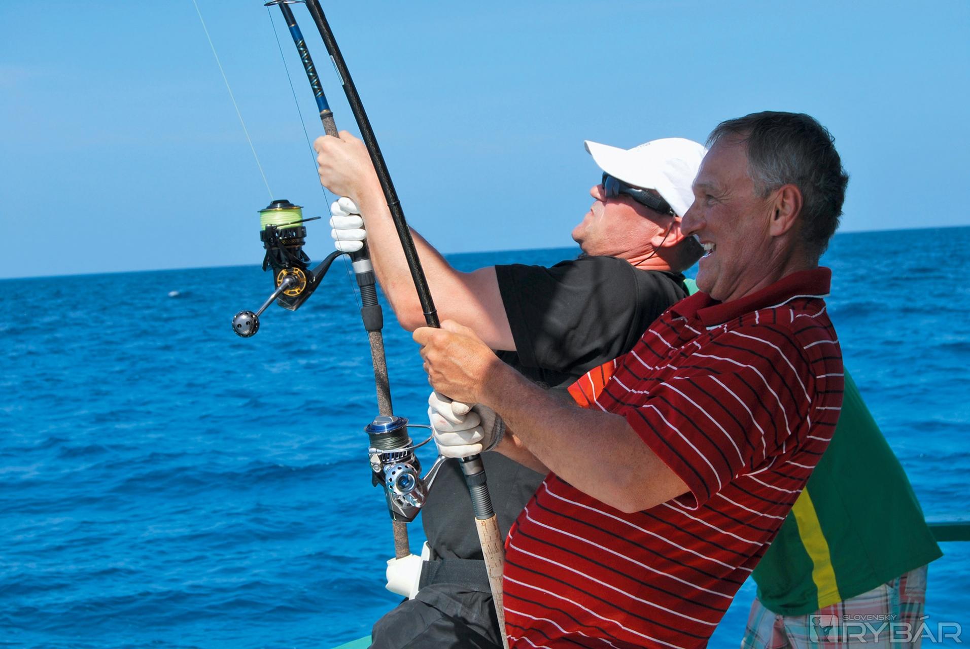 Nepredvídateľne poskakujúci popper po rozvlnenej hladine nie je ľahkou korisťou ani pre tých najrýchlejších útočníkov. Prvý záber naň patril do kategórie neprehliadnuteľných. Kranas prudko chňapol po nástrahe, ale zásek šiel do prázdna. Pripravil som sa na ďalší hod, ale moja udica zostala nehybne visieť vo vzduchu. Na Peťov popper, ktorý chytal neohrozene zo špice lode, zaútočila veľká tmavá ponorka a podľa nasledujúceho úniku to bol určite tuniak žltoplutvý. Do záseku sa Peter oprel celou silou a jeho udica explodovala. Groteska sa začala. V rukách mu zostala iba rukoväť prúta s navijakom a zlomená časť udice sa kĺzala po napnutej šnúre za rybou do vĺn. To už dvaja členovia posádky poskákali do člna a rýchlosťou chlapcov „z bejvoču“ leteli zachraňovať udicu, ktorá sa stále vznášala nad hladinou a špičkou vytyčovala smer unikajúceho tuniaka.