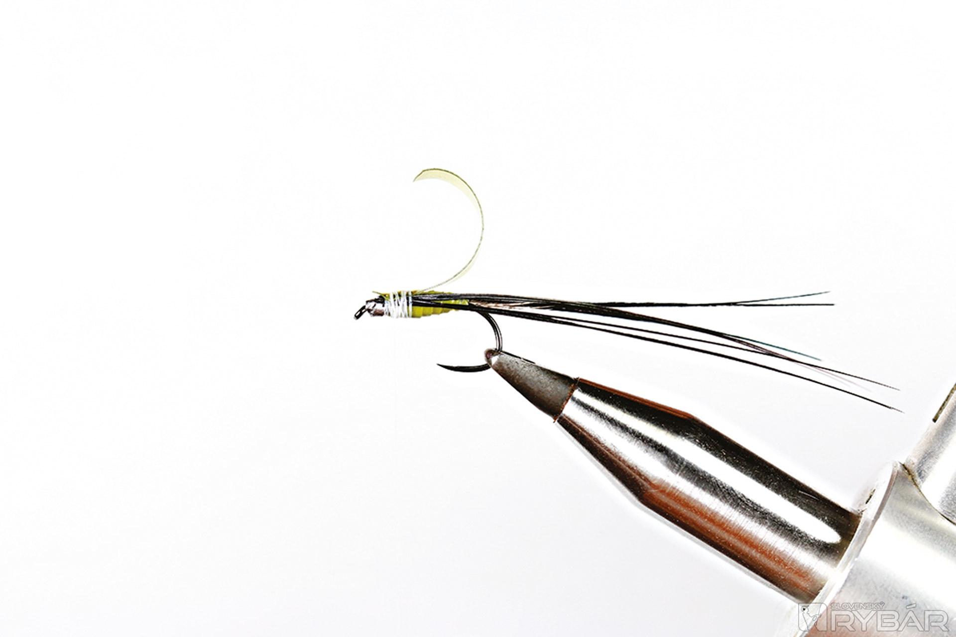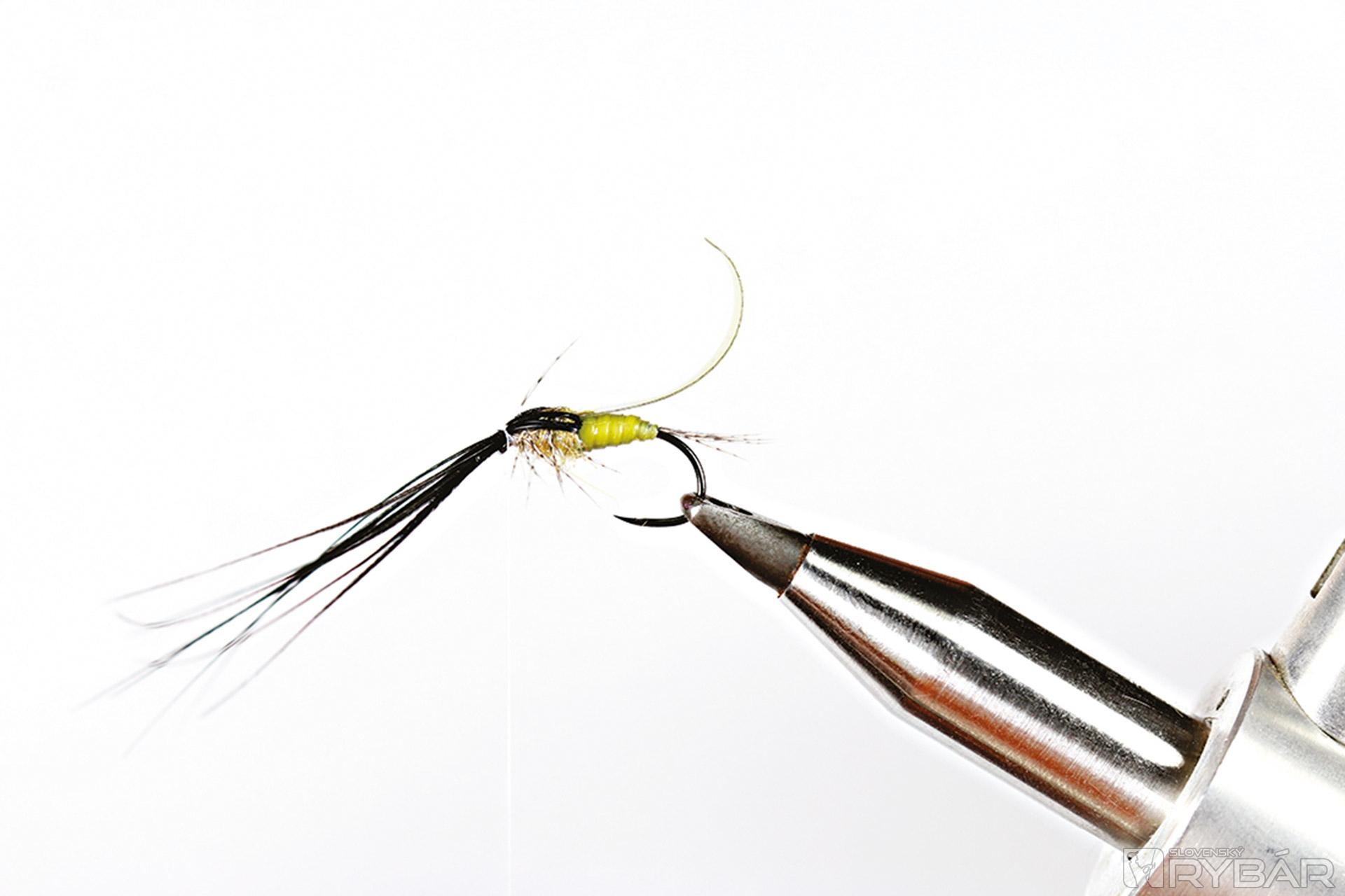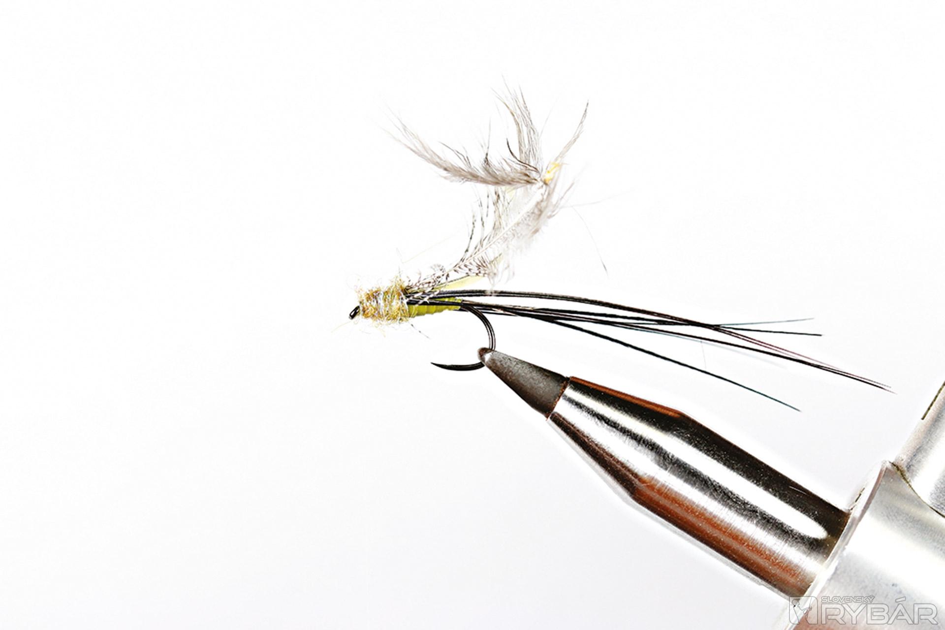 tenšia svetlá niť, mokrý, alebo suchý háčik, olovený pásik, olivové flexibody, pierko z jarabice, svetlý zelený dabing, výrezy z čierneho pera bažanta, alebo volavky.