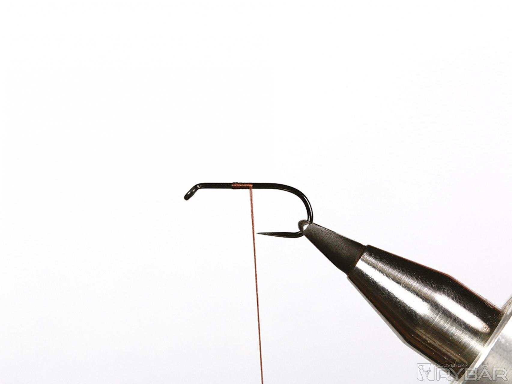 1. Háčik upneme do zveráčika a naviažeme viazaciu niť.