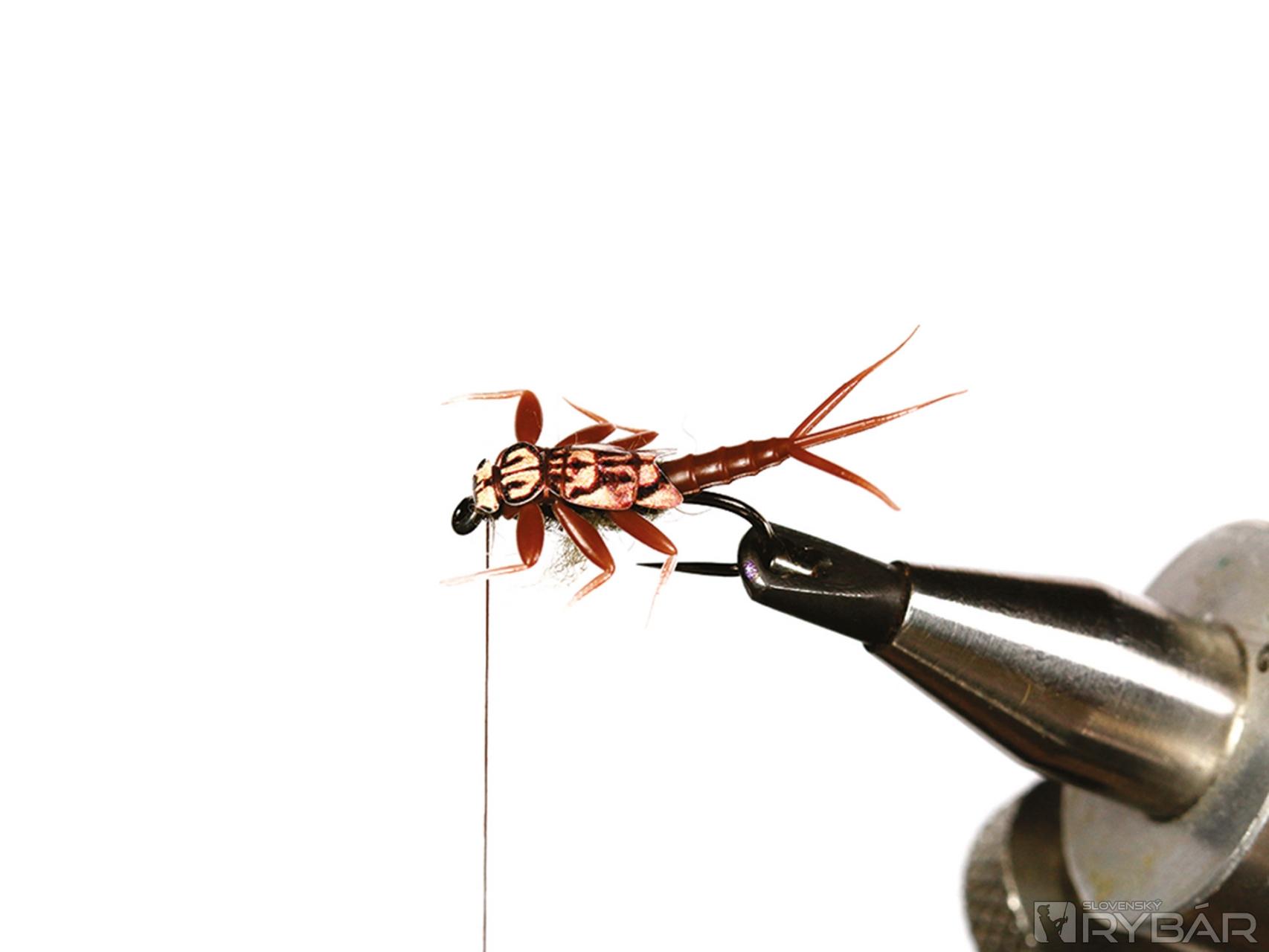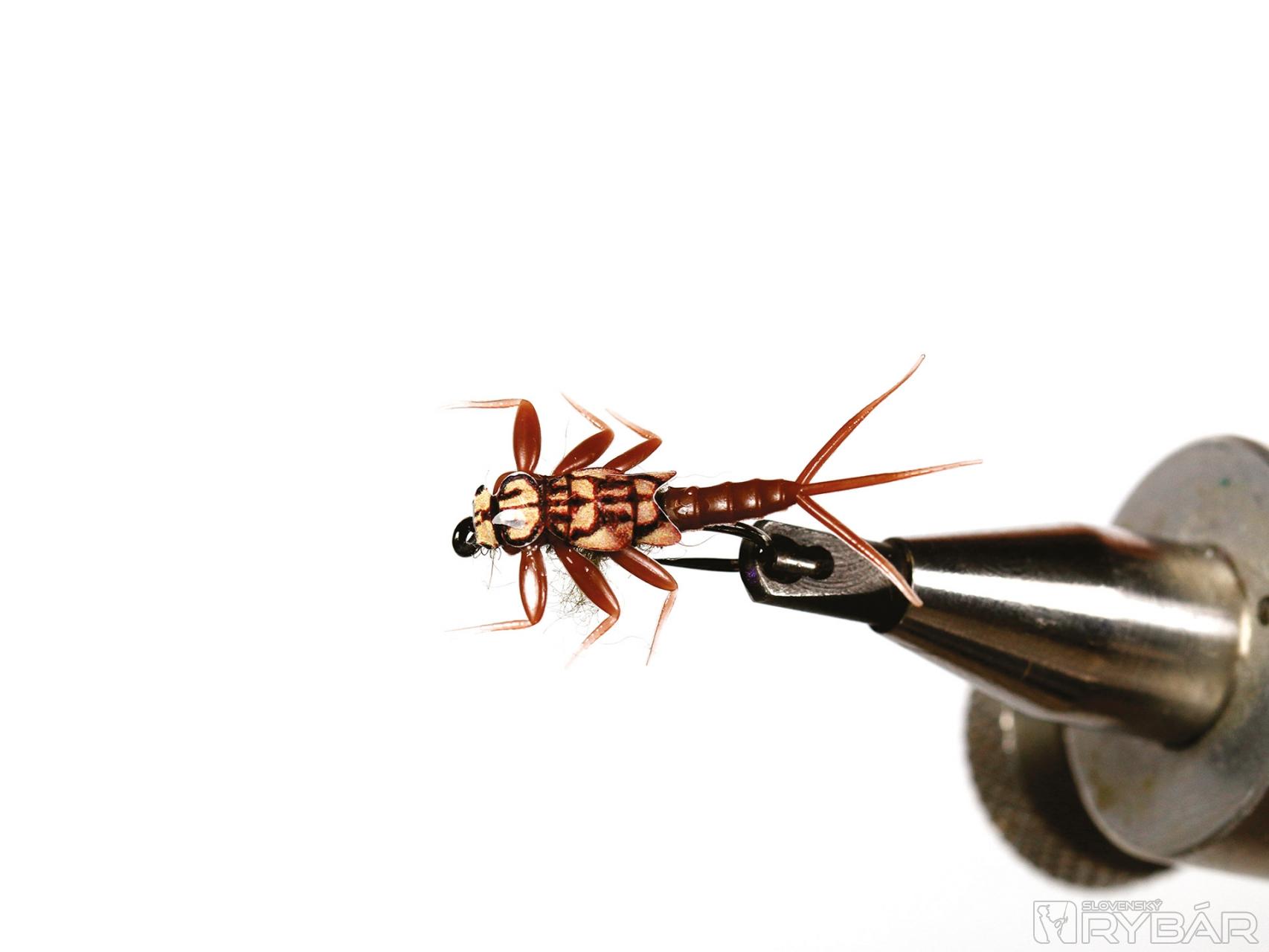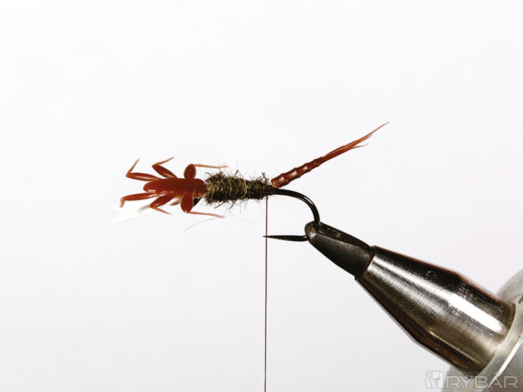 Na túto realistickú mušku som použil materiály z dielne firmy Hemingways, ktorá sa, okrem iného, venuje aj výrobe podobných umelých materiálov. Muška napodobňuje nymfu podenky. Odstránením stredného chvostového lúča môžeme napodobniť aj nymfu pošvatky. Nymfu som nezaťažoval, aby v stĺpci pekne putovala. Preto je dobré loviť napr. v tandeme s nejakou ťažšou muškou, ktorá nám zostavu stiahne ku dnu a táto nymfa bude na prívese plávať dole prúdom. Berú ju dobre pstruhy, ale aj lipne, príp. iná ryba.