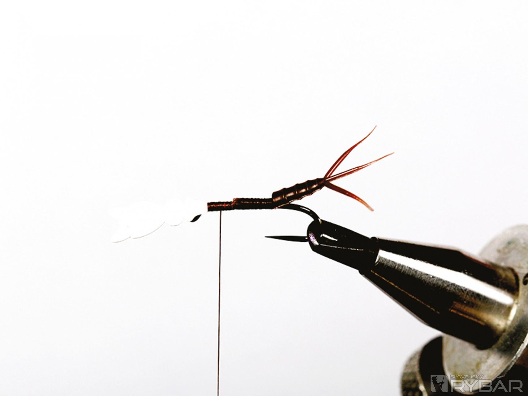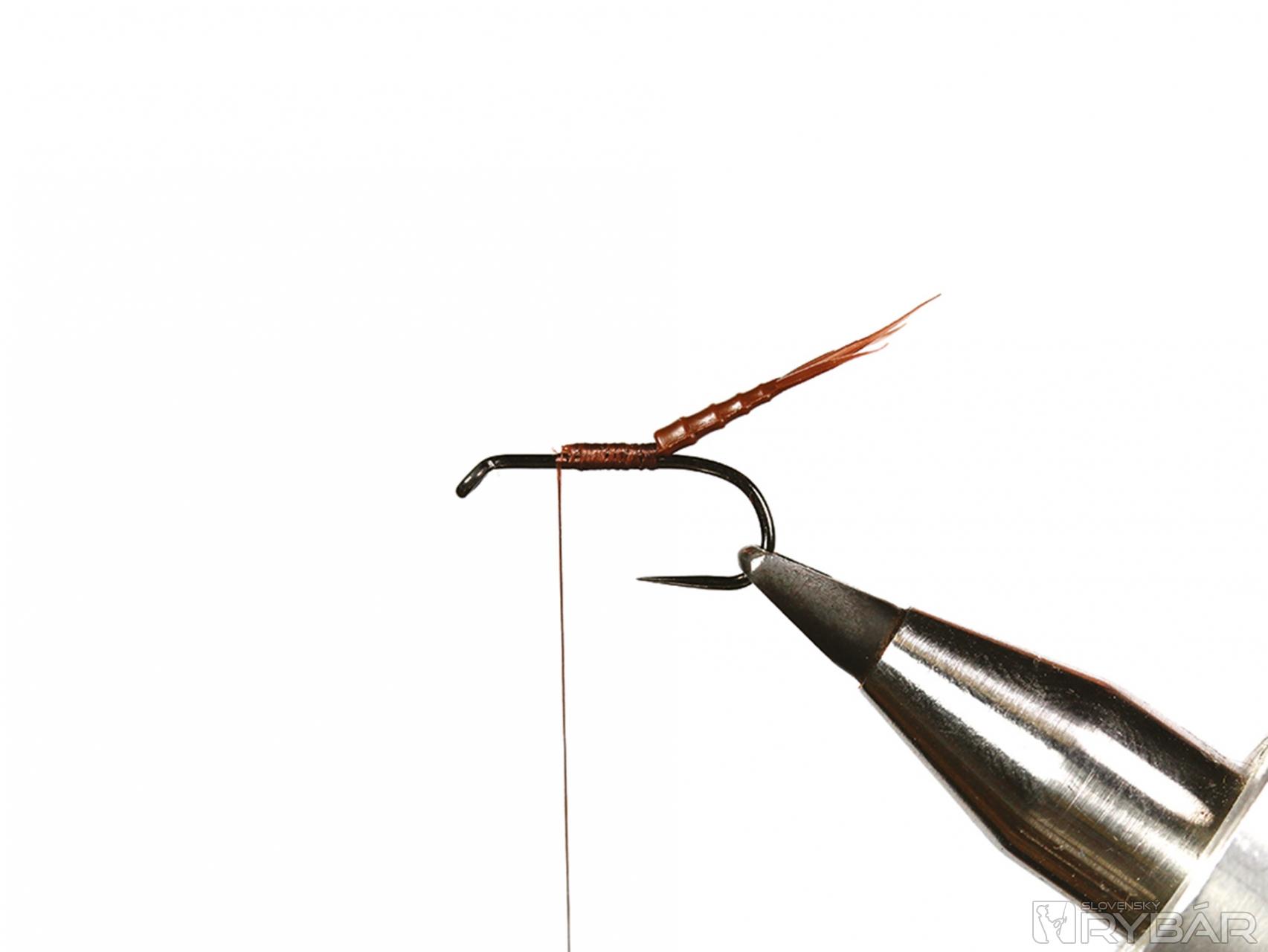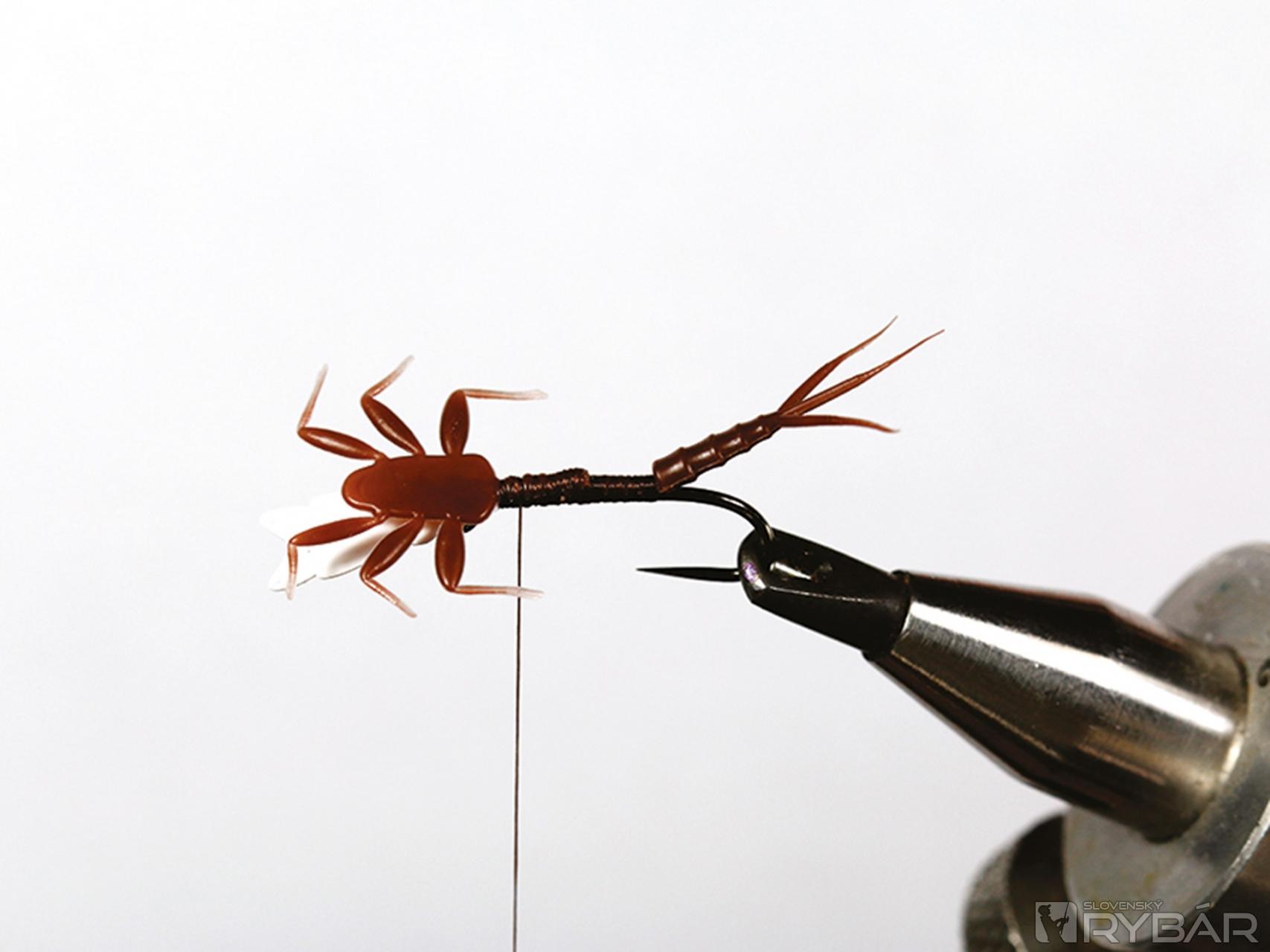 Na túto realistickú mušku som použil materiály z dielne firmy Hemingways, ktorá sa, okrem iného, venuje aj výrobe podobných umelých materiálov. Muška napodobňuje nymfu podenky. Odstránením stredného chvostového lúča môžeme napodobniť aj nymfu pošvatky. Nymfu som nezaťažoval, aby v stĺpci pekne putovala. Preto je dobré loviť napr. v tandeme s nejakou ťažšou muškou, ktorá nám zostavu stiahne ku dnu a táto nymfa bude na prívese plávať dole prúdom. Berú ju dobre pstruhy, ale aj lipne, príp. iná ryba.