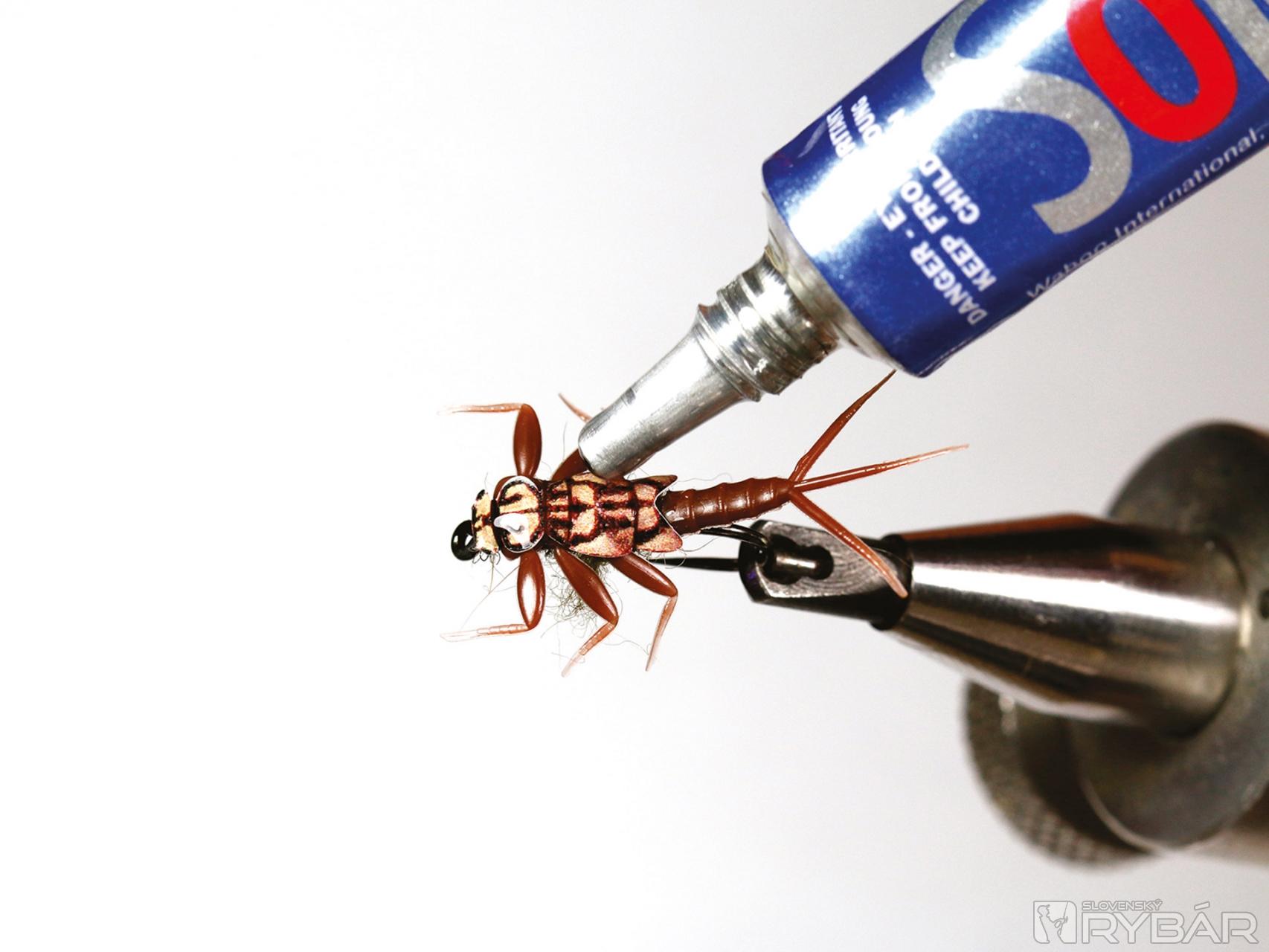 Väčší nymfový háčik, tmavá viazacia niť, tmavý dabing, chvostík, nožičky a hlavohruď od Hemingways, UV lak.
