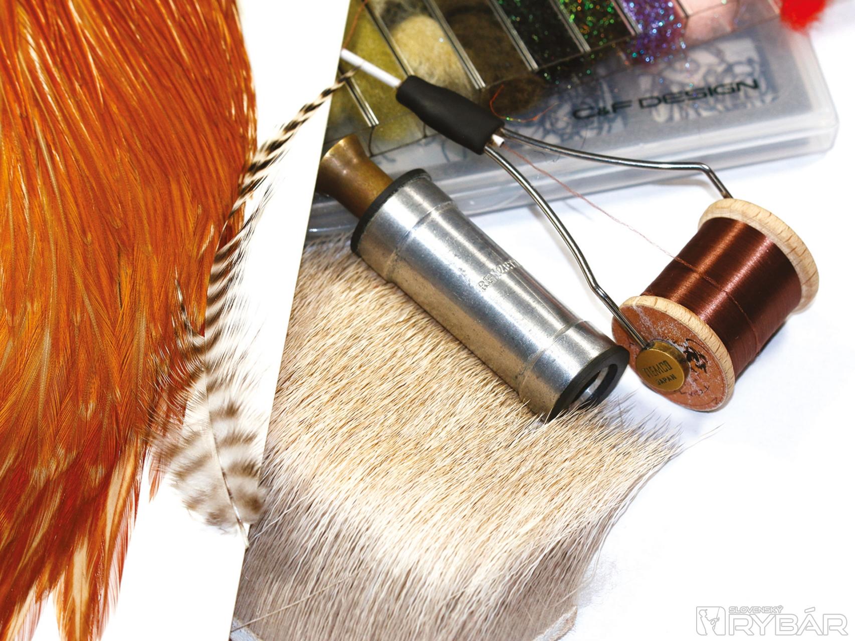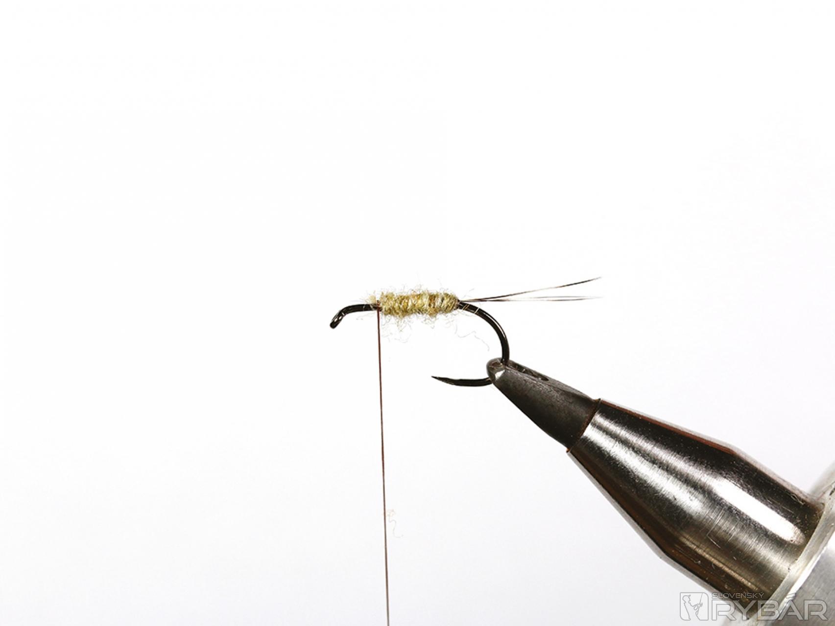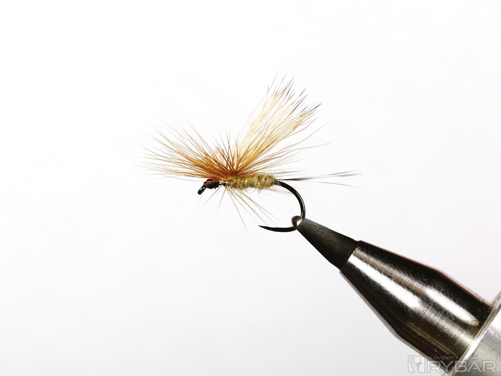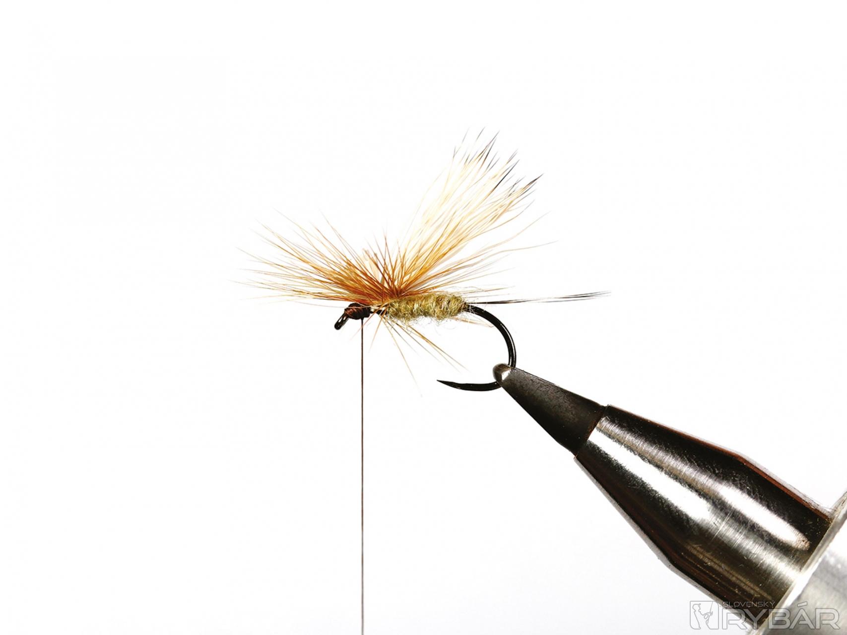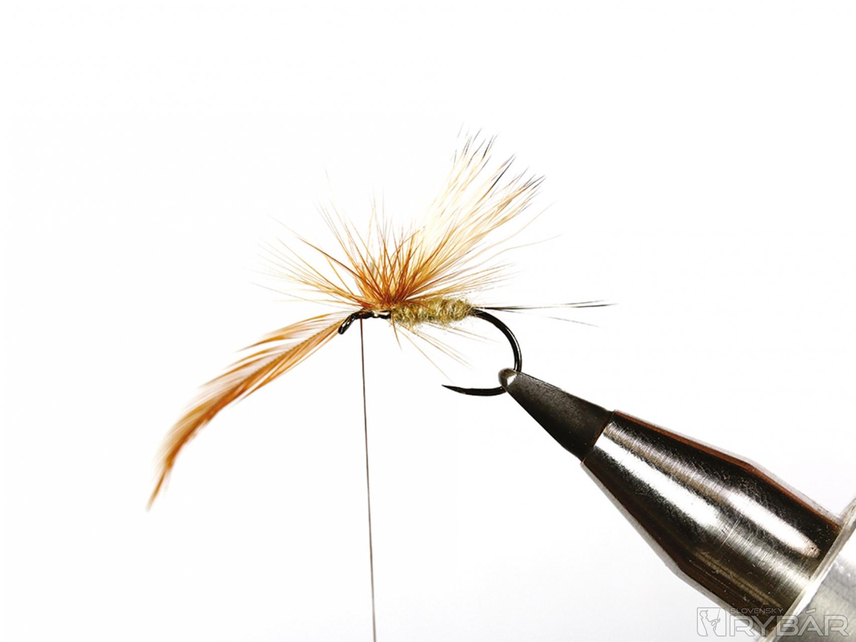 Suchý háčik, tmavšia viazacia niť, umelý zelenkavý dabing, zimná srsť z jeleňa, grizzly perie, hrdzavé perie.