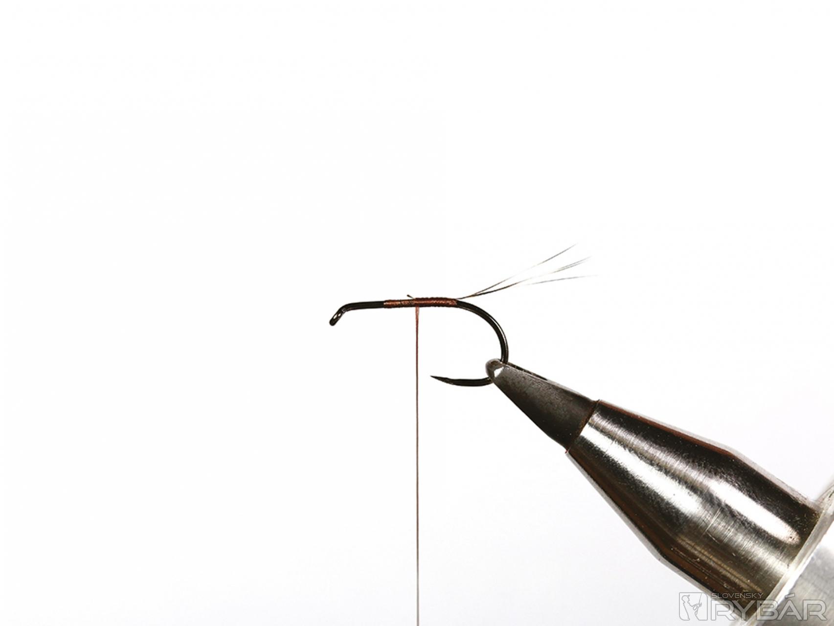 1. Háčik upneme do zveráčika a naviažeme viazaciu niť.