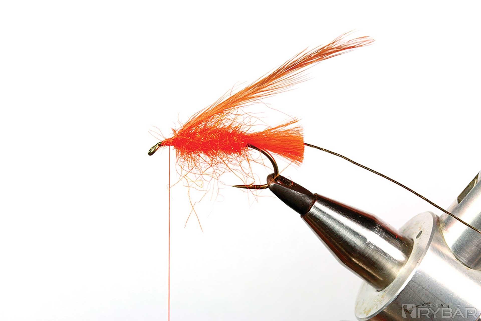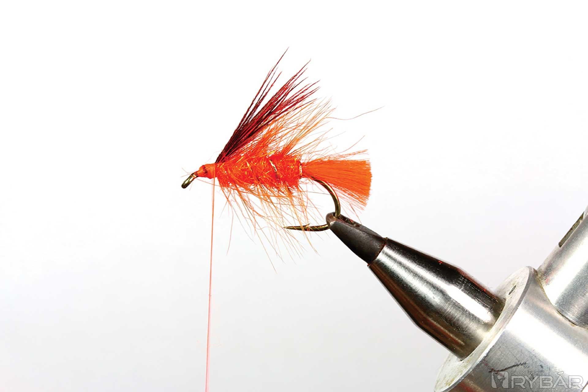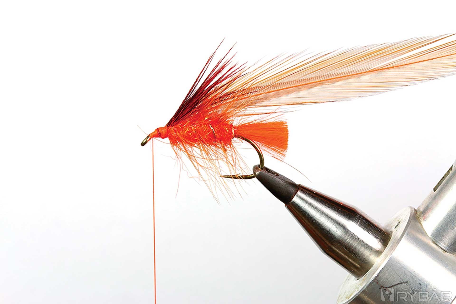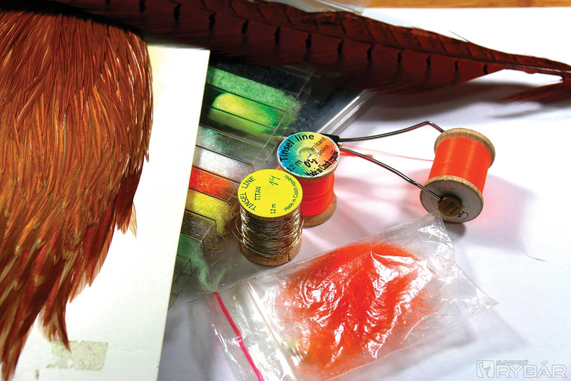 väčší mokrý háčik, oranžová viazacia niť, oranžová niť na zadoček, zlatistá lametka, mix oranžového tuleňa a spectra dabingu, hrdzavé pierko zo sliepky a kohúta.