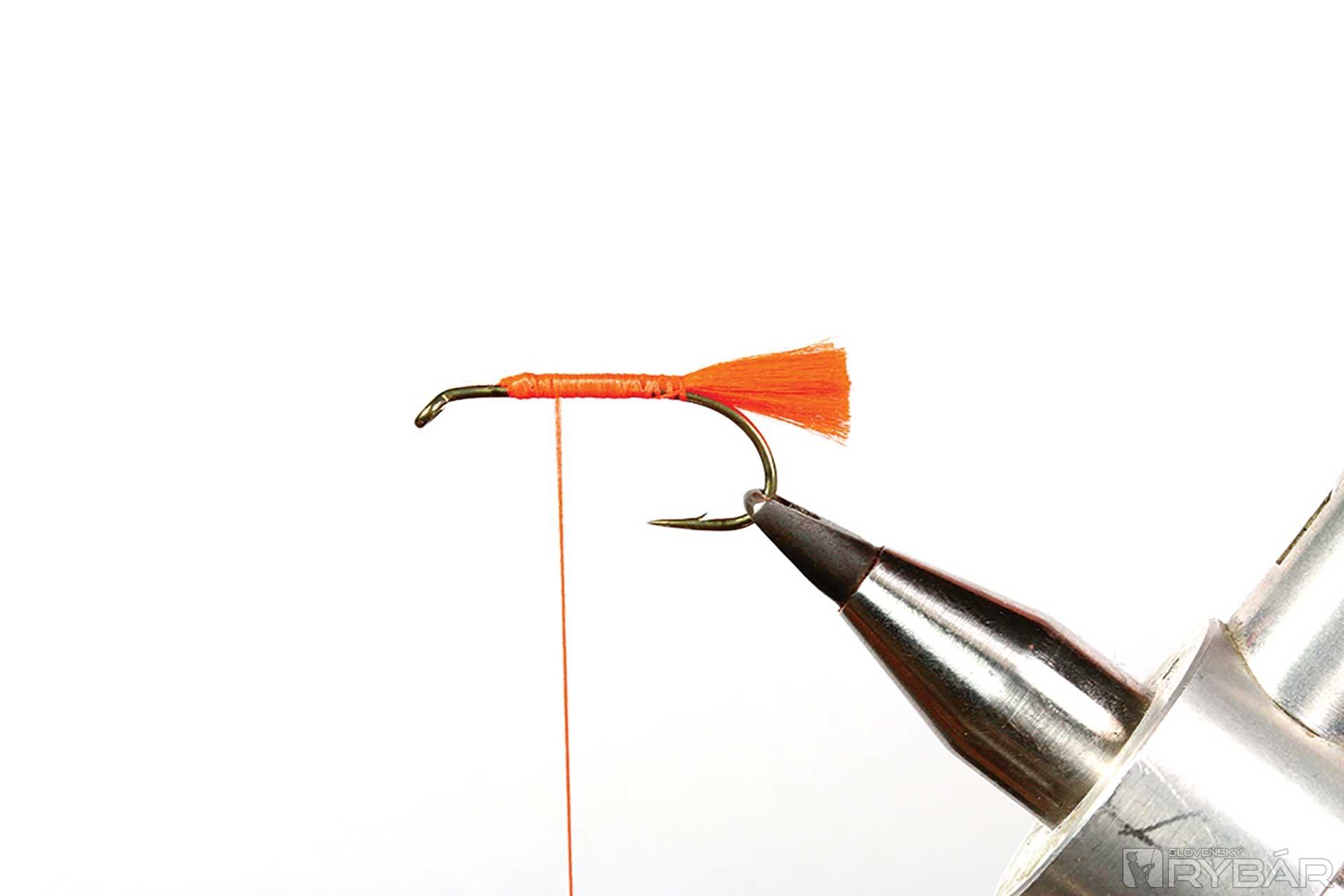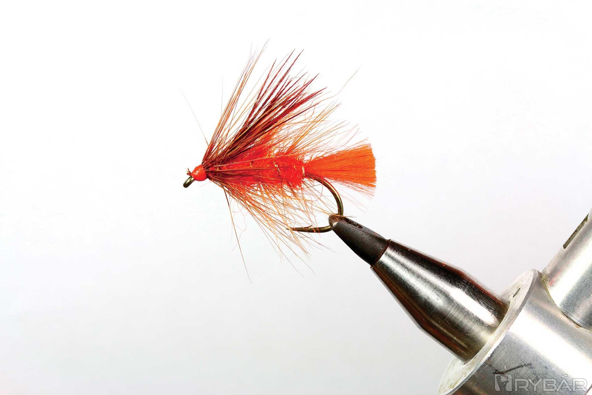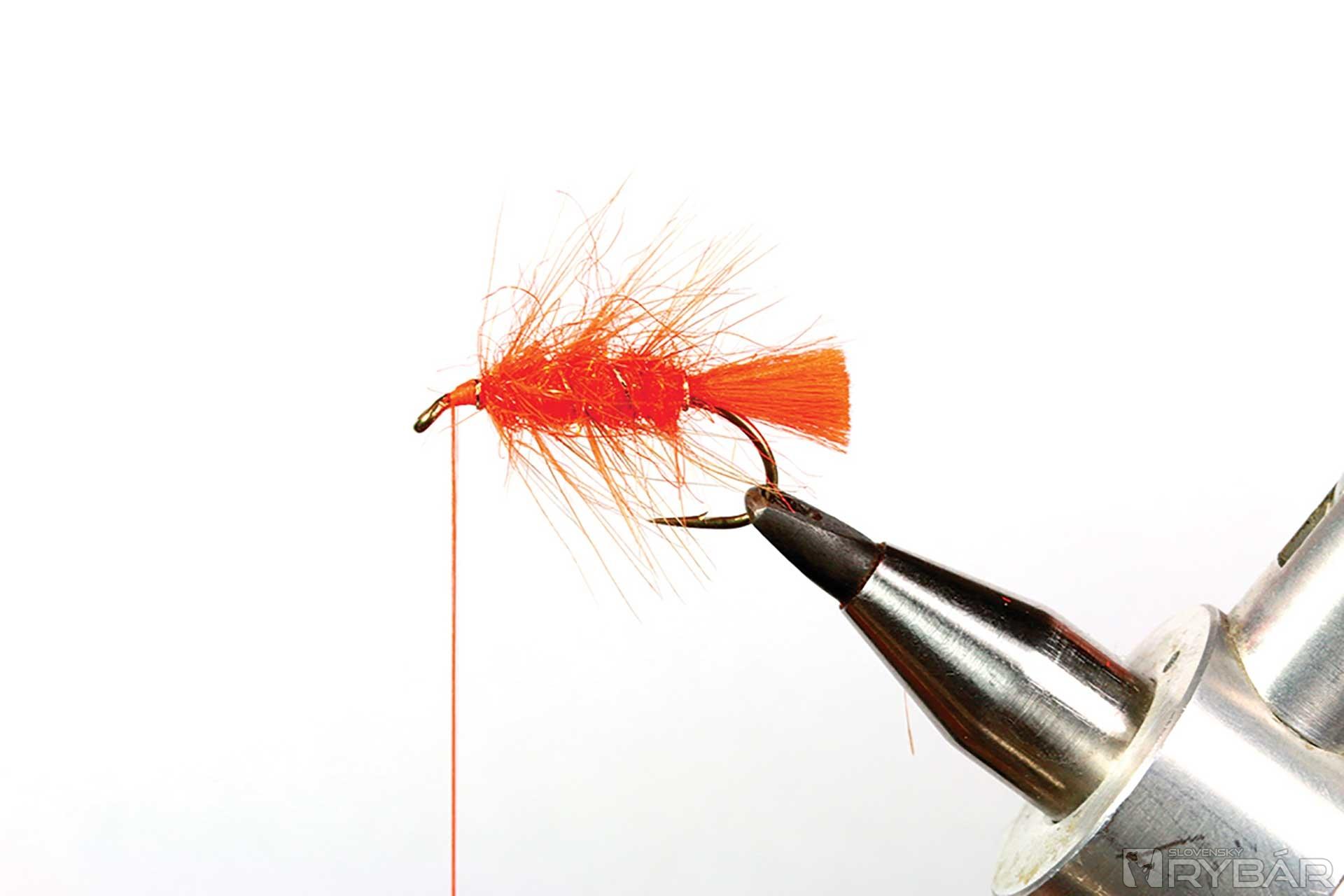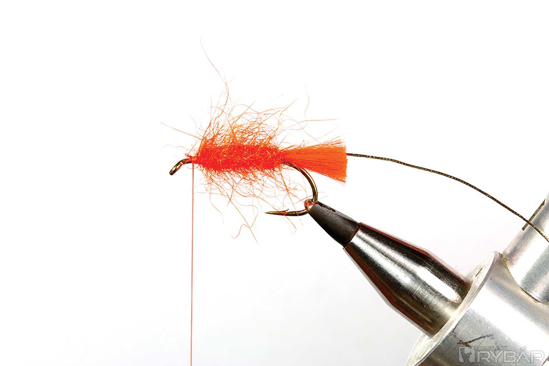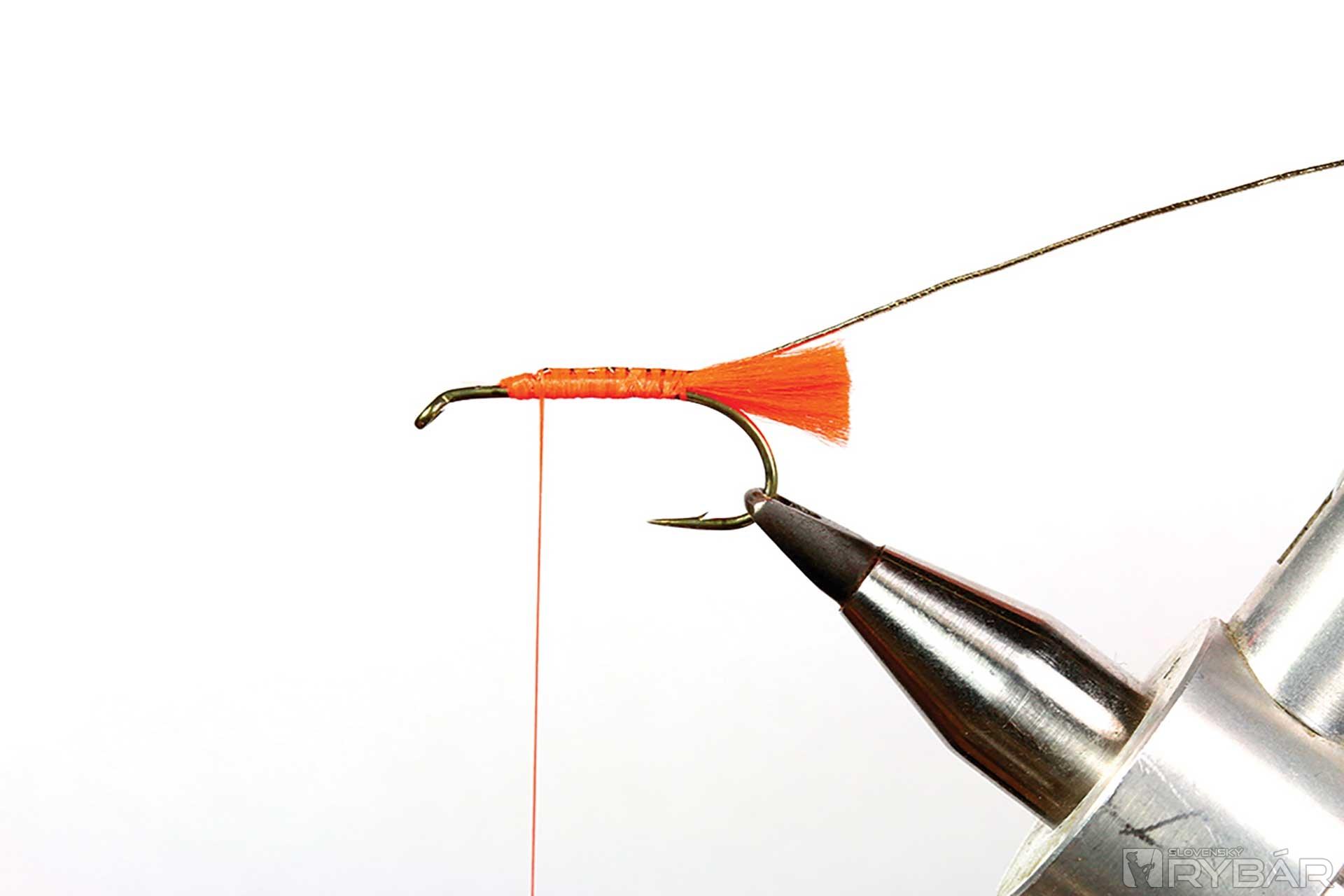 väčší mokrý háčik, oranžová viazacia niť, oranžová niť na zadoček, zlatistá lametka, mix oranžového tuleňa a spectra dabingu, hrdzavé pierko zo sliepky a kohúta.