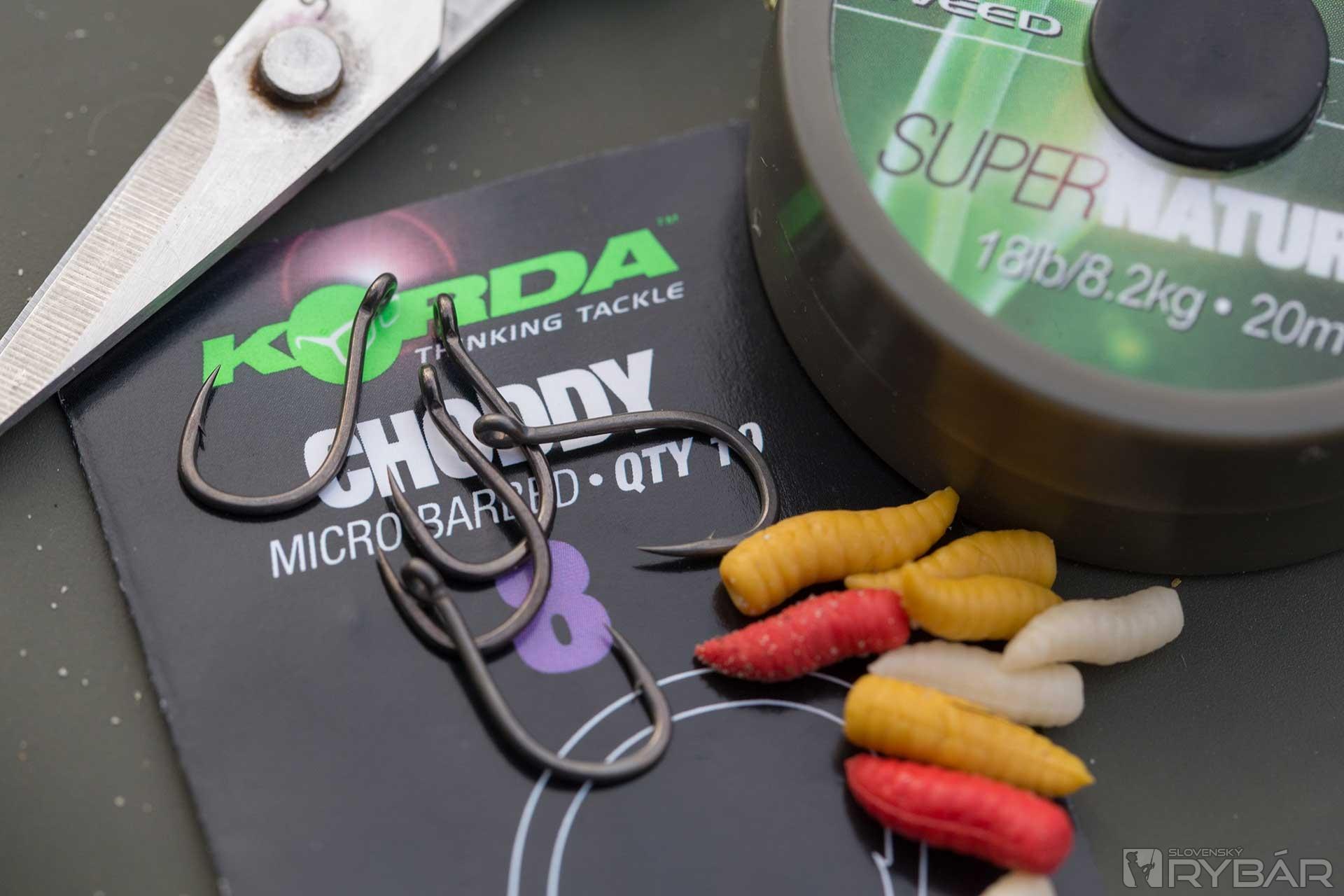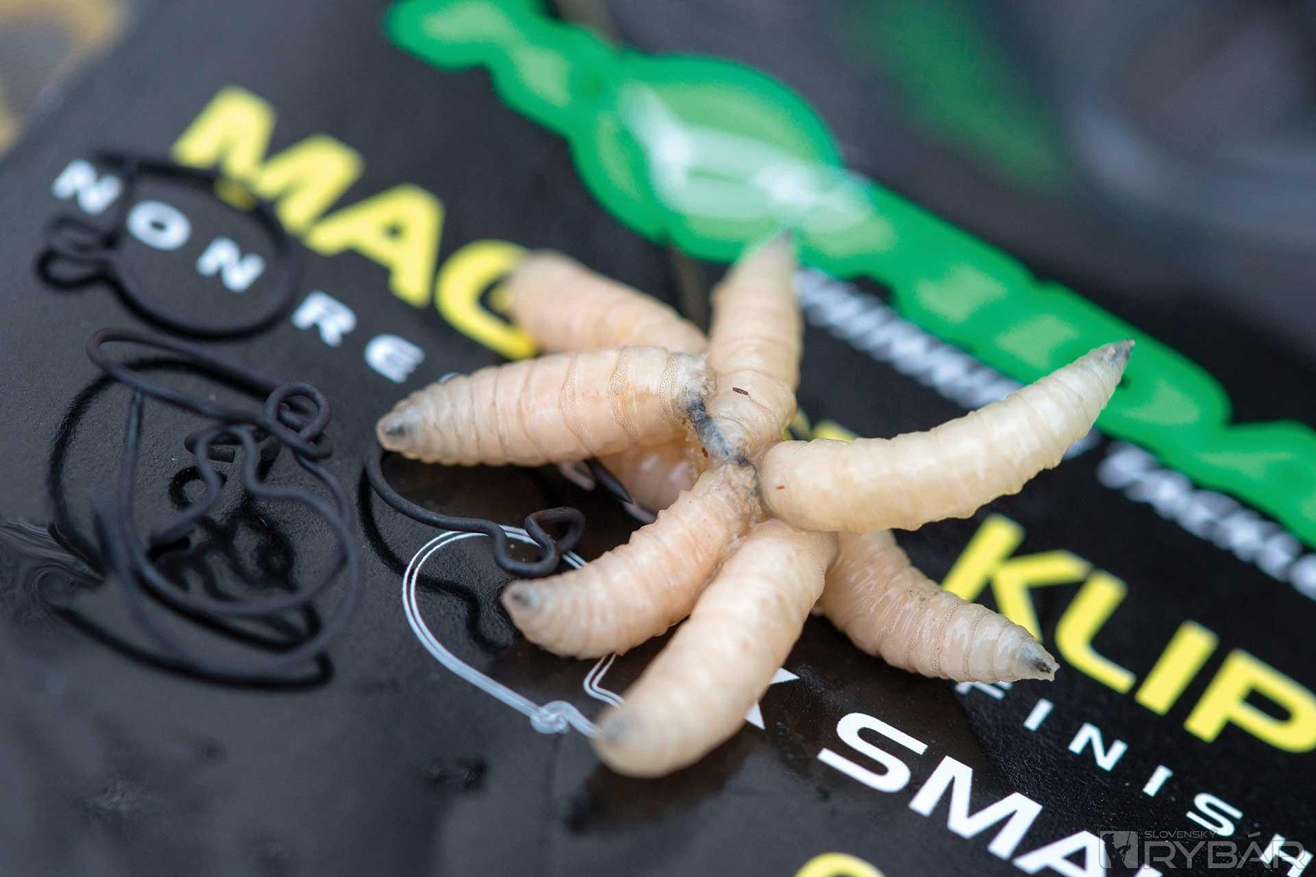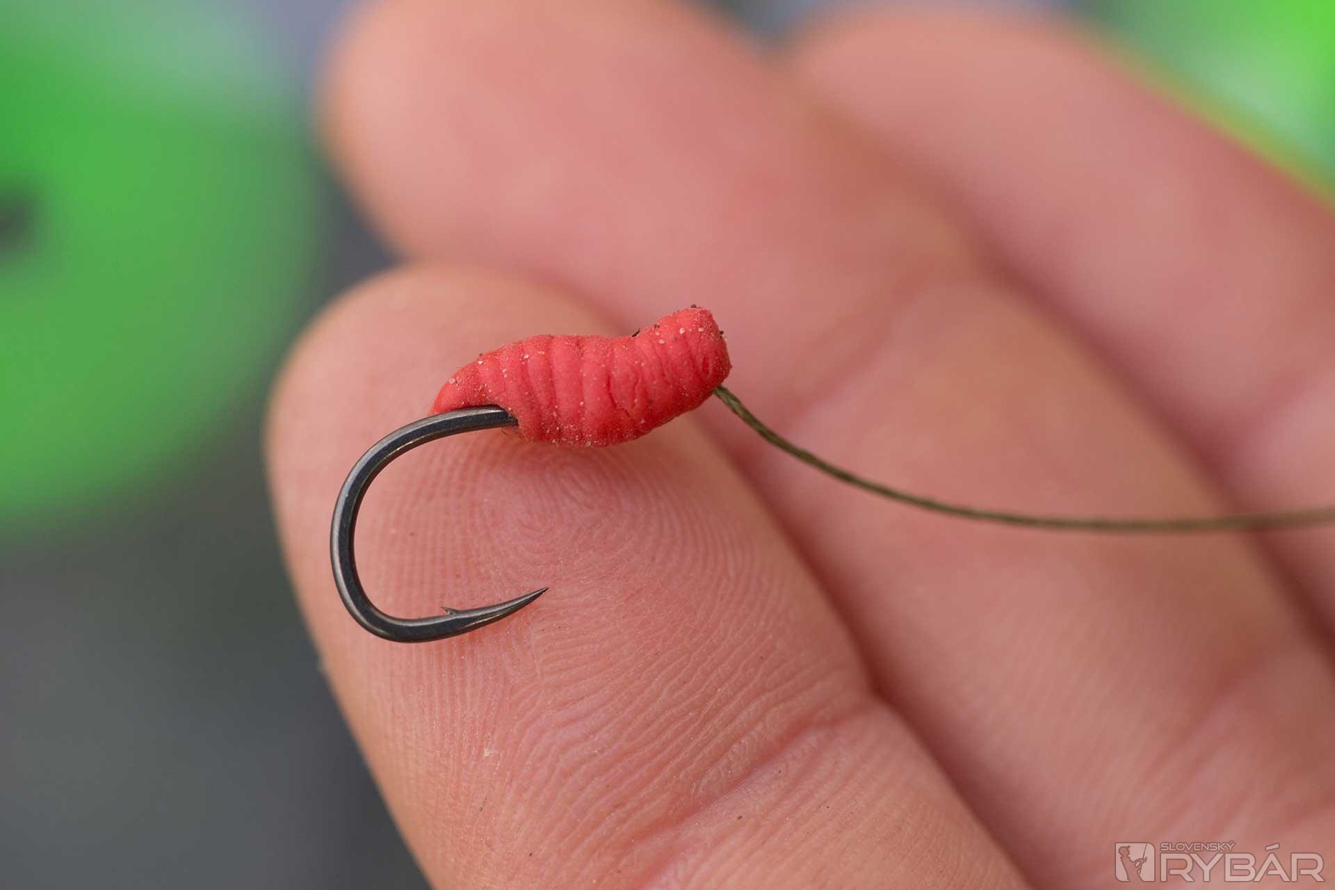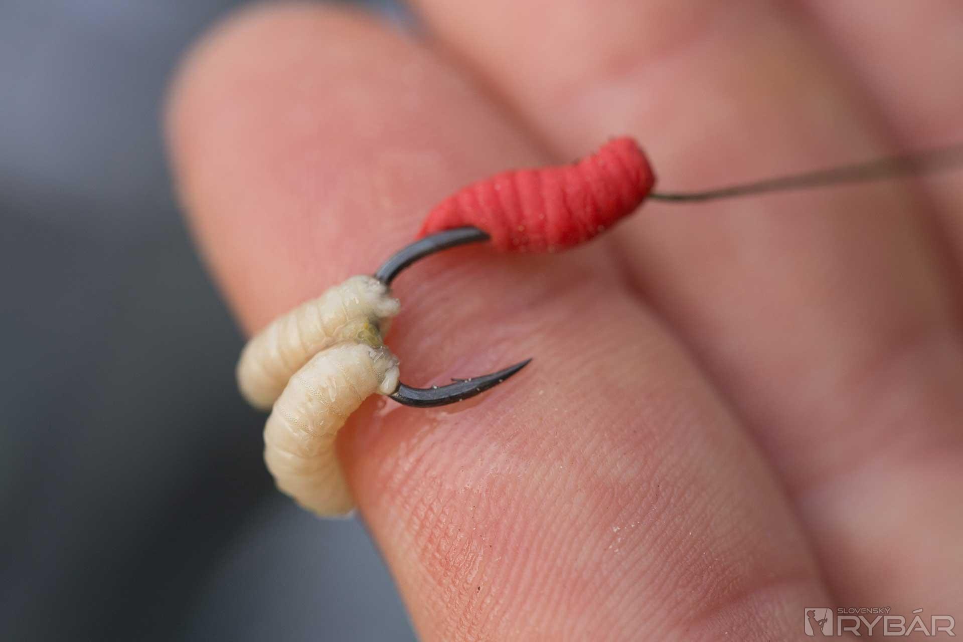 Pri používaní kostných červov ich môžeme nastražiť viacerými spôsobmi. Najjednoduchšia cesta je uviazanie vlasu s pomocou maggot clipu. S týmto malým klipom môžete nastražiť niekoľko červov. Ak však chcete menšiu, subtílnejšiu prezentáciu, použite starý trik s rovnátkom v tvare červa. Táto montáž nachytala množstvo pekných kaprov. Aj keď nerád príliš zjemňujem, v zime to jednoducho inak nejde a okrem malých háčikov siahnem aj po jemnej šnúrke Super Natural Braid. Viažem ju na háčik Choddy veľkosti 8. Je to silný háčik so širokým oblúčikom a dobre mi poslúži aj na pop‑up montáže, preto ho vždy mám vo svojej výbave.