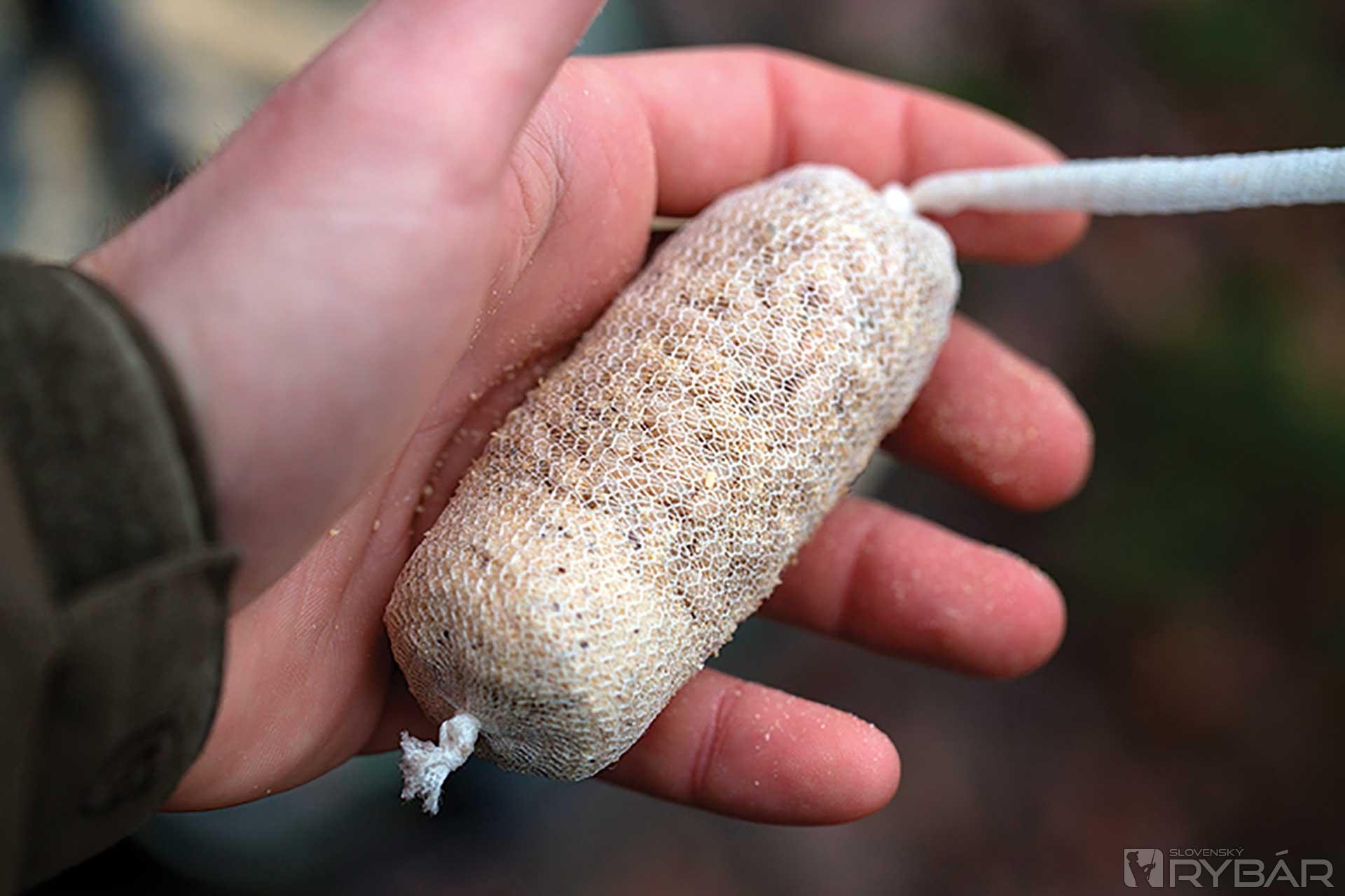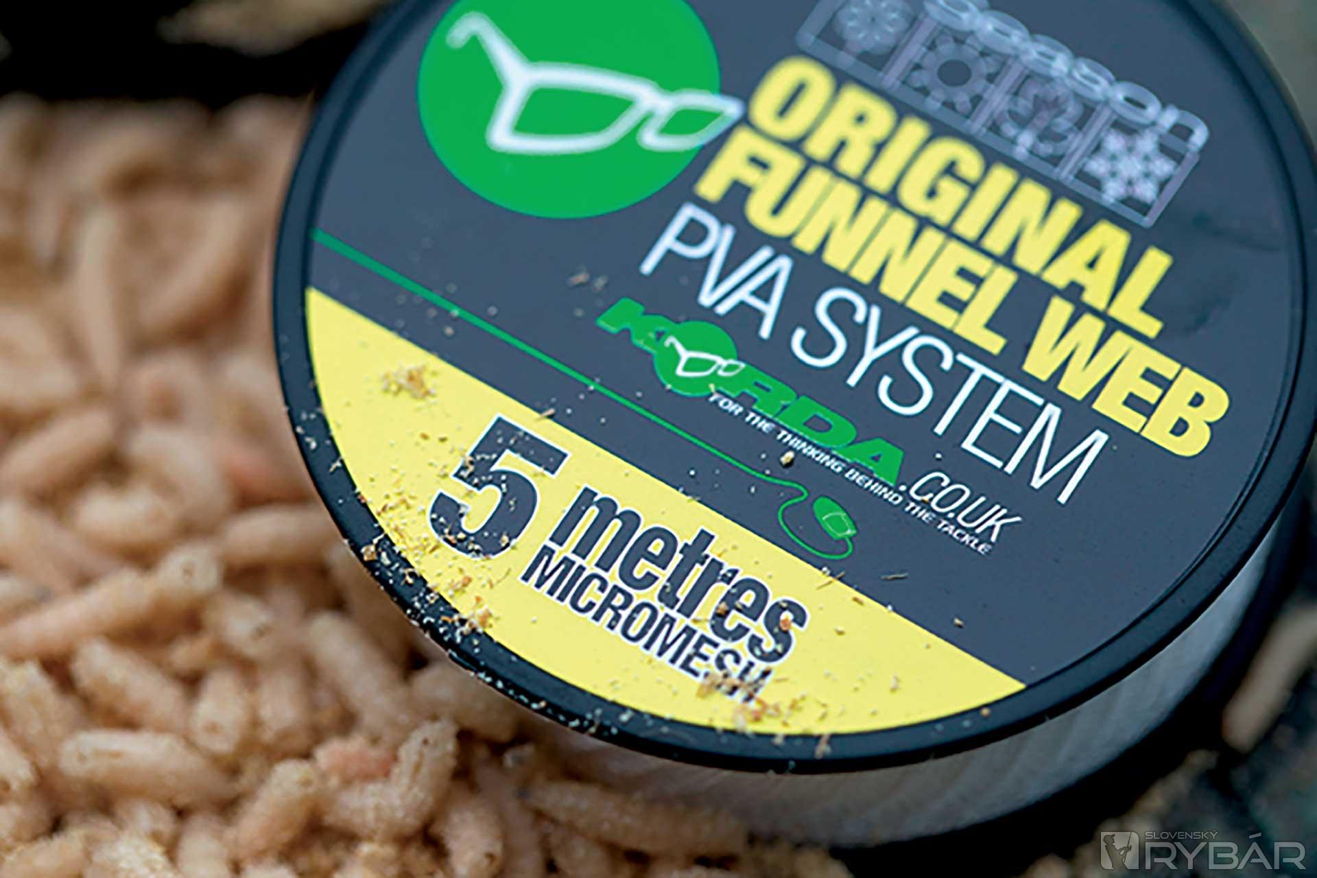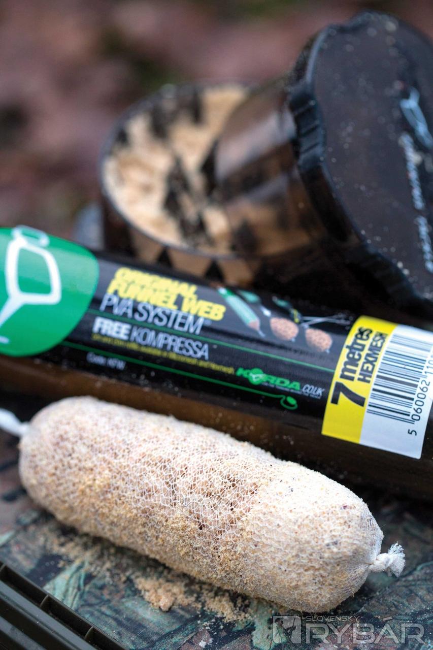 Preferujem dosť veľké pančuchy naplnené kostnými červami. Dôvodom je, že keď sa rozpustia, na dne zanechajú peknú kôpku malých tanečníkov. Tento „fľak“ ľahko stráviteľnej návnady upúta pozornosť a stimuluje kapry, aby sa napchali. Na zhotovenie používam veľké tuby s materiálom Micro Mesh PVA. Táto PVA pančucha má maličké dierky, ktoré zabezpečia, aby červy povypadávali, či už za letu, alebo keď si ich pripravím do zásoby. Okrem toho sa taká sieťka ľahko rozpúšťa aj v studenej vode a garantuje skvelú prezentáciu.