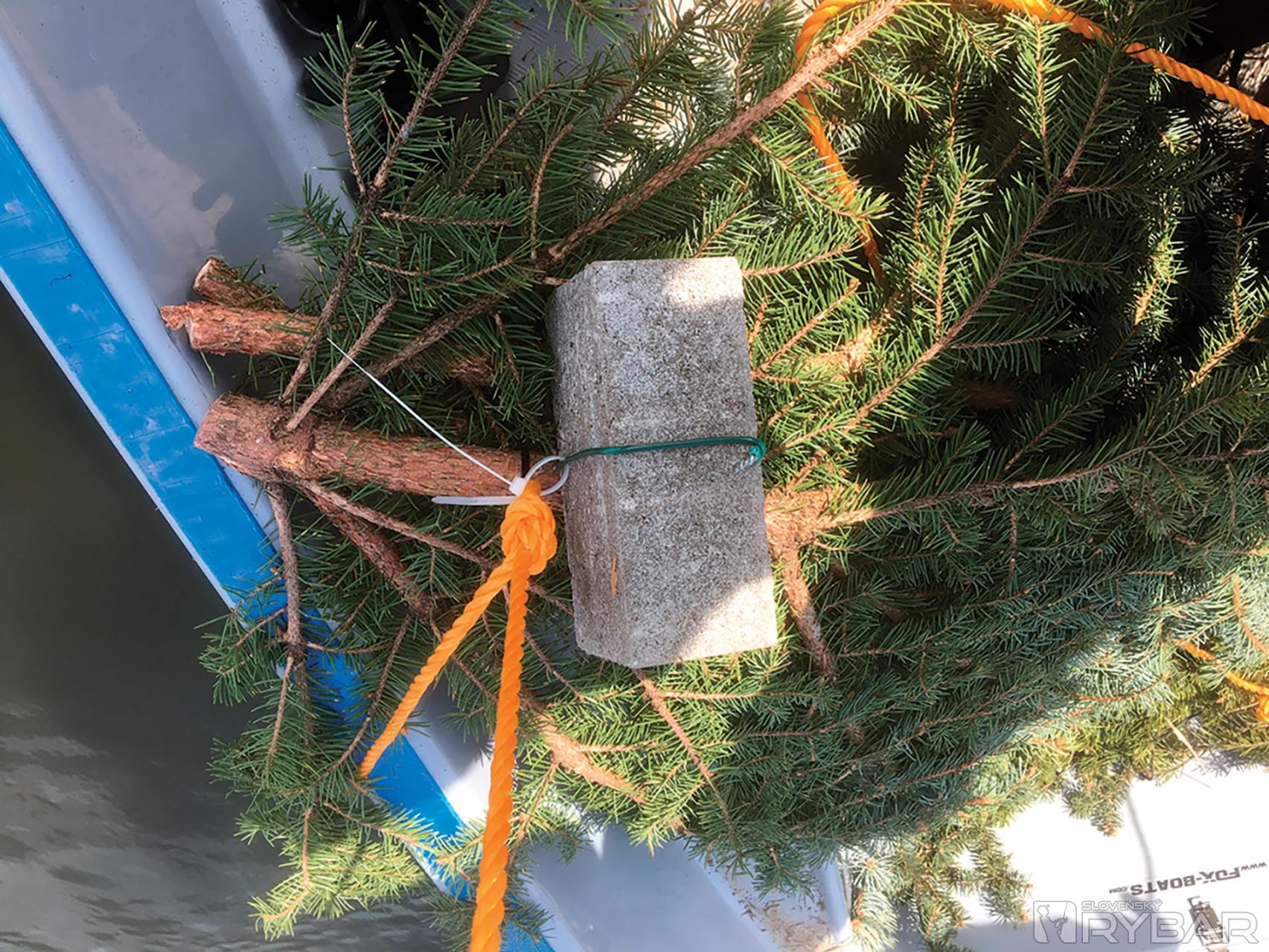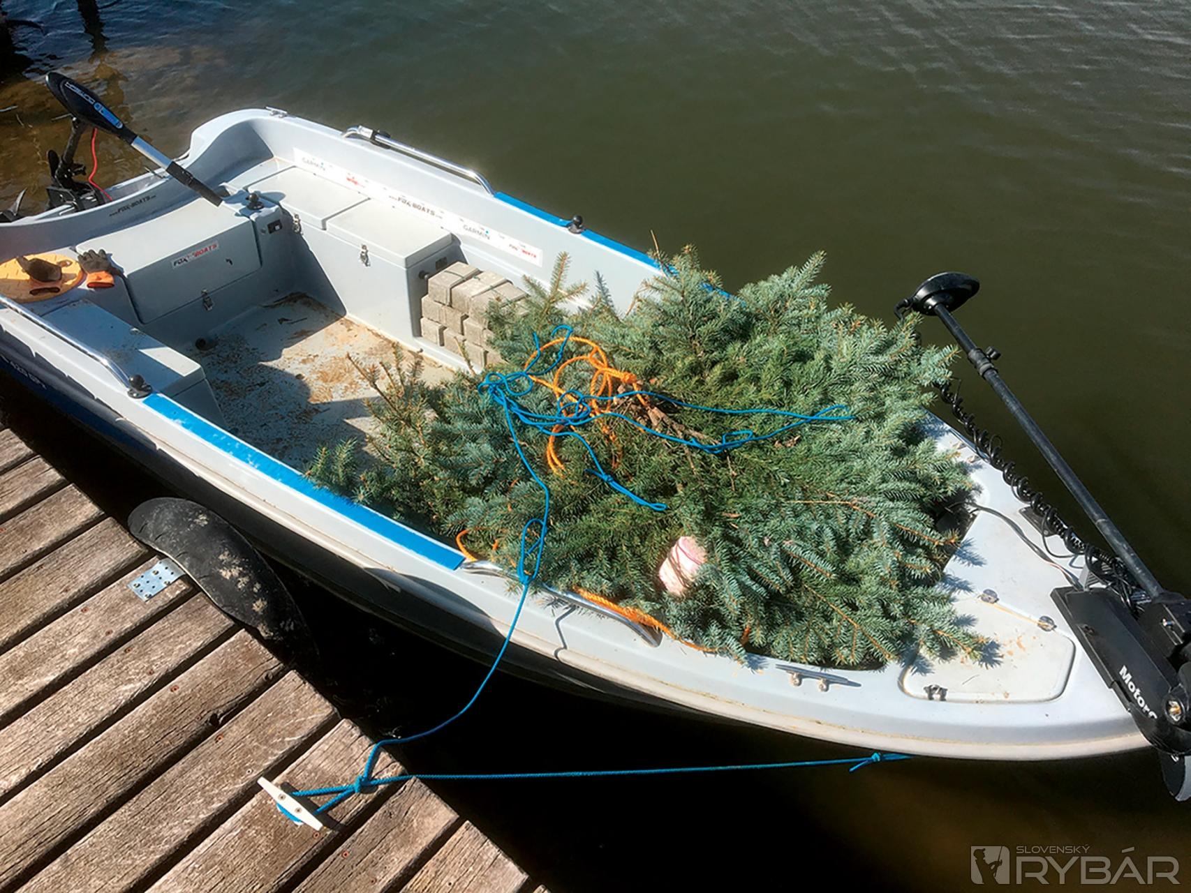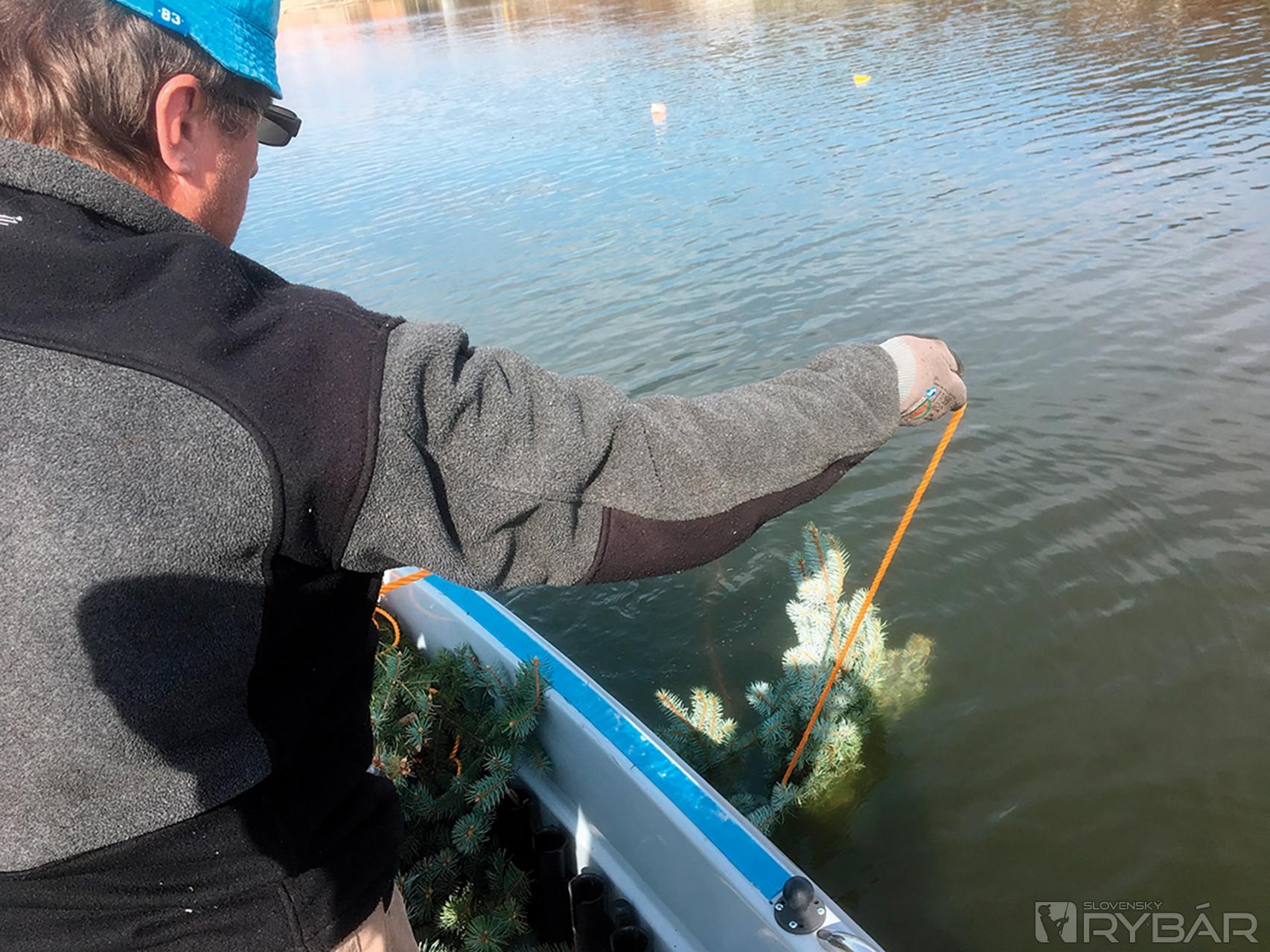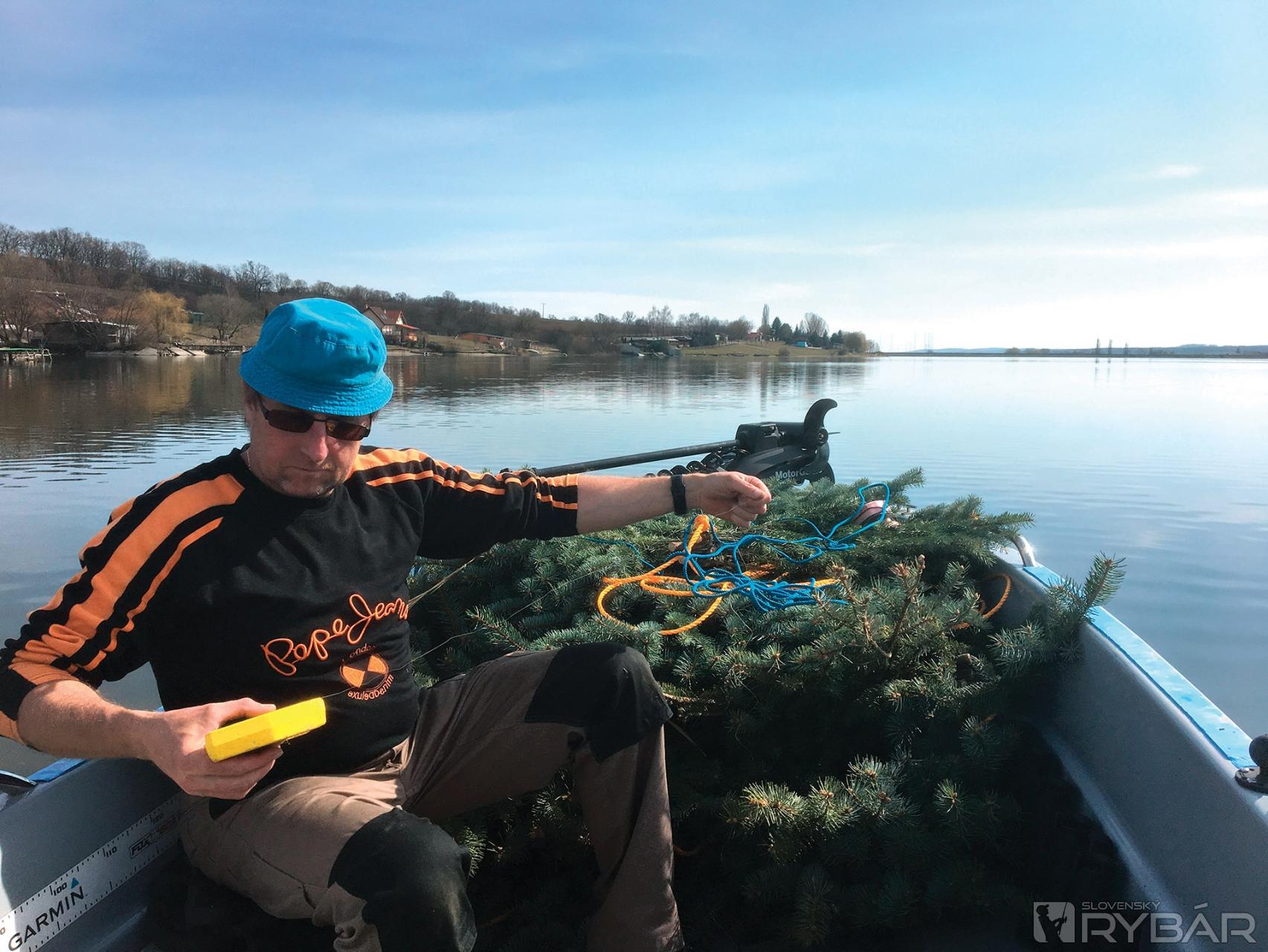 /kocka polystyrénu/, aby ste vedeli kde ich máte a po výtere ich vedeli odstrániť. Keď sme prišli člnom na požadovanú hĺbku, položili sme prvé hniezdo. Závažie padlo na dno a pomaly som cúval, aby sa lano začalo šponovať. Vyhodili sme druhé hniezdo. Týmto spôsobom to ide pomerne rýchlo. Je potrebné to robiť vo dvojici. Jeden vykladá hniezda a druhý manévruje elektromotorom. Ak by vám hniezda plávali, môžete závažie dať ku každému hniezdu, záleží od veľkosti vetví a hmotnosti závažia.