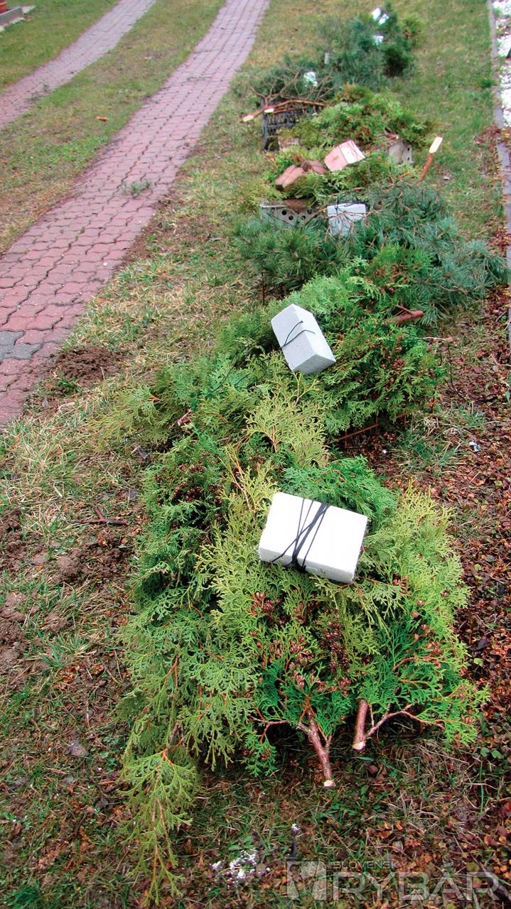 O čo vlastne ide? Pointa celého je jedno dlhé lano, hrubšie, nie mäkké. Lano sme roztiahli a každých 5 m urobili na lane jednoduchú slučku. Za túto slučku sme uložili 4-5 vetiev smreka, tuje, borovice, alebo aj ich kombinácie. Záleží čo máte. Vetvy sme stiahli rýchlopáskou. Každých 5 metrov sme mali kôpku čečiny. Ďalšou rýchlopáskou sme fixovali vetvy o slučku na lane. Keďže sme mali 50-metrové lano, mali sme na ňom 10 hniezd. Výroba 10 nových hniezd trvala tak max. 2 hodiny. Potom sme už len naukladali hniezda do člna na seba. Ku každému druhému sme ešte pripevnili závažie, v našom prípade zvyšky zámkovej dlažby.