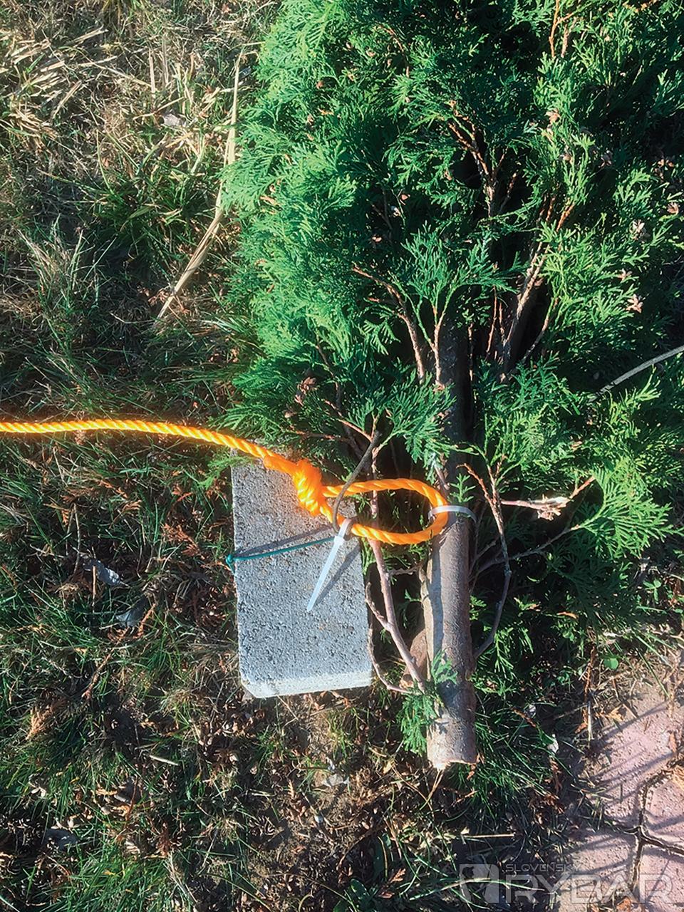 Detail prvého hniezda, spáskované vetvy - vrcholce tuje najprv medzi sebou, potom prichytené o slučku na lane. K slučke je uchytené aj závažie. Tu ešte chýba 3-metrová šnúra s plavákom.
