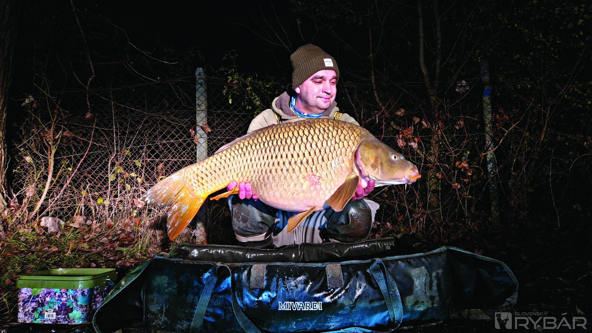 Na miesto som dorazil okolo 11. hodiny s malou dušičkou, či bude voľné. Keď som zbadal, že 10. aj 9. sú voľné, nechcel som veriť vlastným očiam. Super! Zhruba za trištvrtehodinku som mal všetko nachystané a udice vyvezené. Našiel som si sonarom pekný zlom, kde som položil ľavý prút. Pravý prút som dával trocha bližšie. Bol tam dlhší úsek medzi hranami, tak som to skúsil položiť tam. Trocha som to pocukroval pri oboch prútoch a na obidva išla jedna 24-ka korenistej príchute, ale rôzneho druhu. O necelú hodinku od vyvezenia prišla na ľavý prút jazda. Neveril som vlastným očiam. Keď som vyrážal ráno na ryby, v aute som si v duchu hovoril – ak by som spravil aspoň jeden záber počas týchto krátkych rybačiek, bolo by to super – a on prišiel za taký krátky čas! Moja radosť bola o to väčšia, že mi po zdolávaní skončil v podberáku nádherný šupináč. Po zvážení 14 kg plus – krásny začiatok! Naplnený pocitom spokojnosti som spravil pár fotiek, niečo natočil a šupinatý krásavec putoval naspäť do vody. Sadol som do auta. Pocity boli neskutočné, super začiatok. V hlave mi prebiehali myšlienky, či to bol nejaký zblúdilec alebo sú ryby ešte pri chuti a ja som možno našiel dobré miesto, na ktorom sa zdržujú. Okolo pol tretej poobede prišiel ďalší záber, jemný padáčik. Po pár minútach som z vody vylovil krásneho asi 7 kg vážiaceho lysca, sfarbeného v krásnom jesennom šate. Večer prituhlo, začalo mrznúť, niečo pred siedmou som to išiel stiahnuť. Domov som odchádzal spokojný a nemohol som sa dočkať, kedy sa sem opäť vrátim.