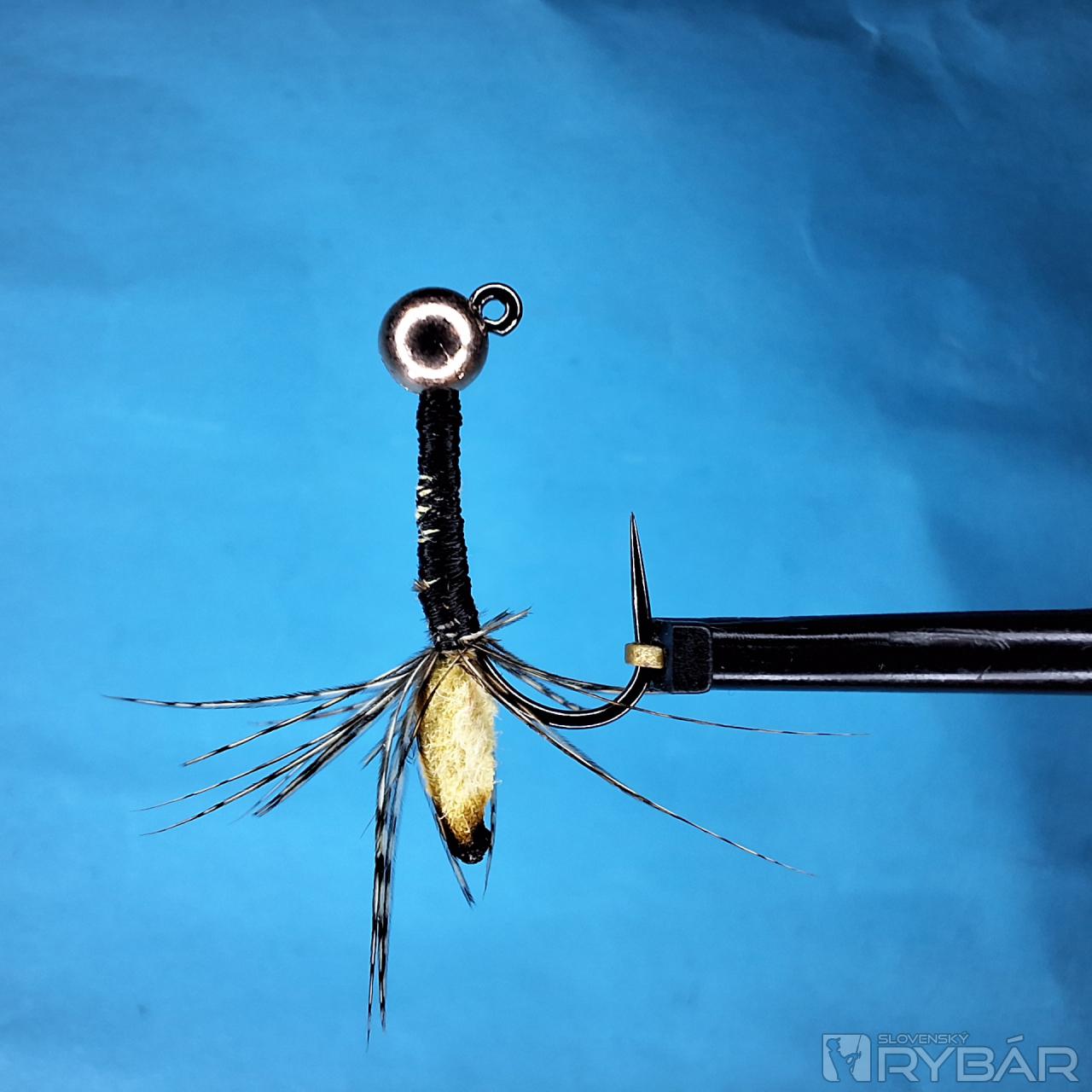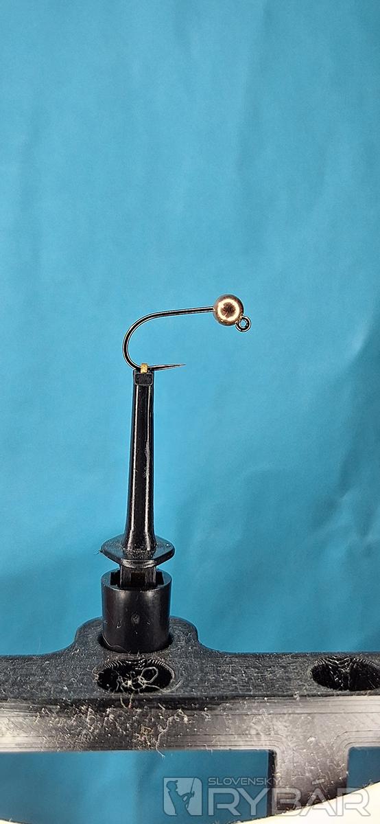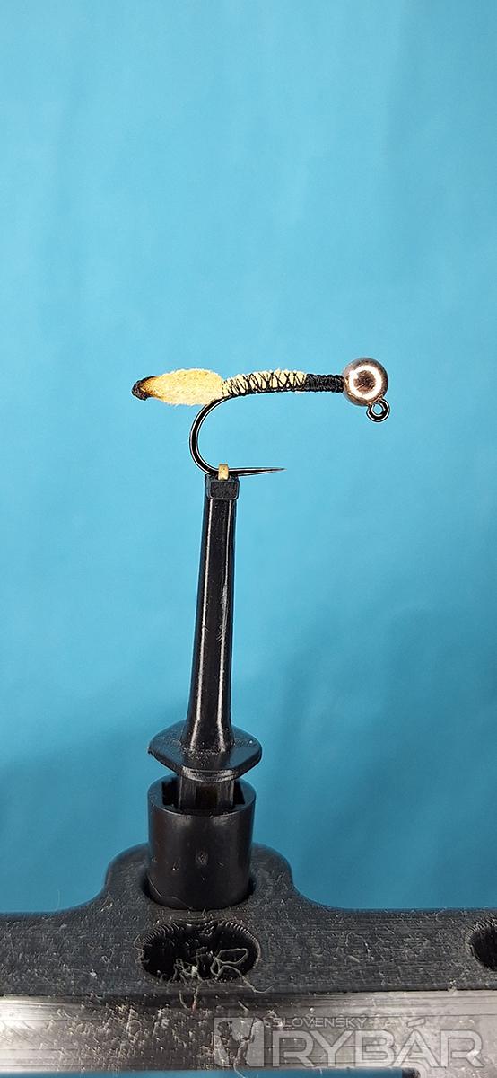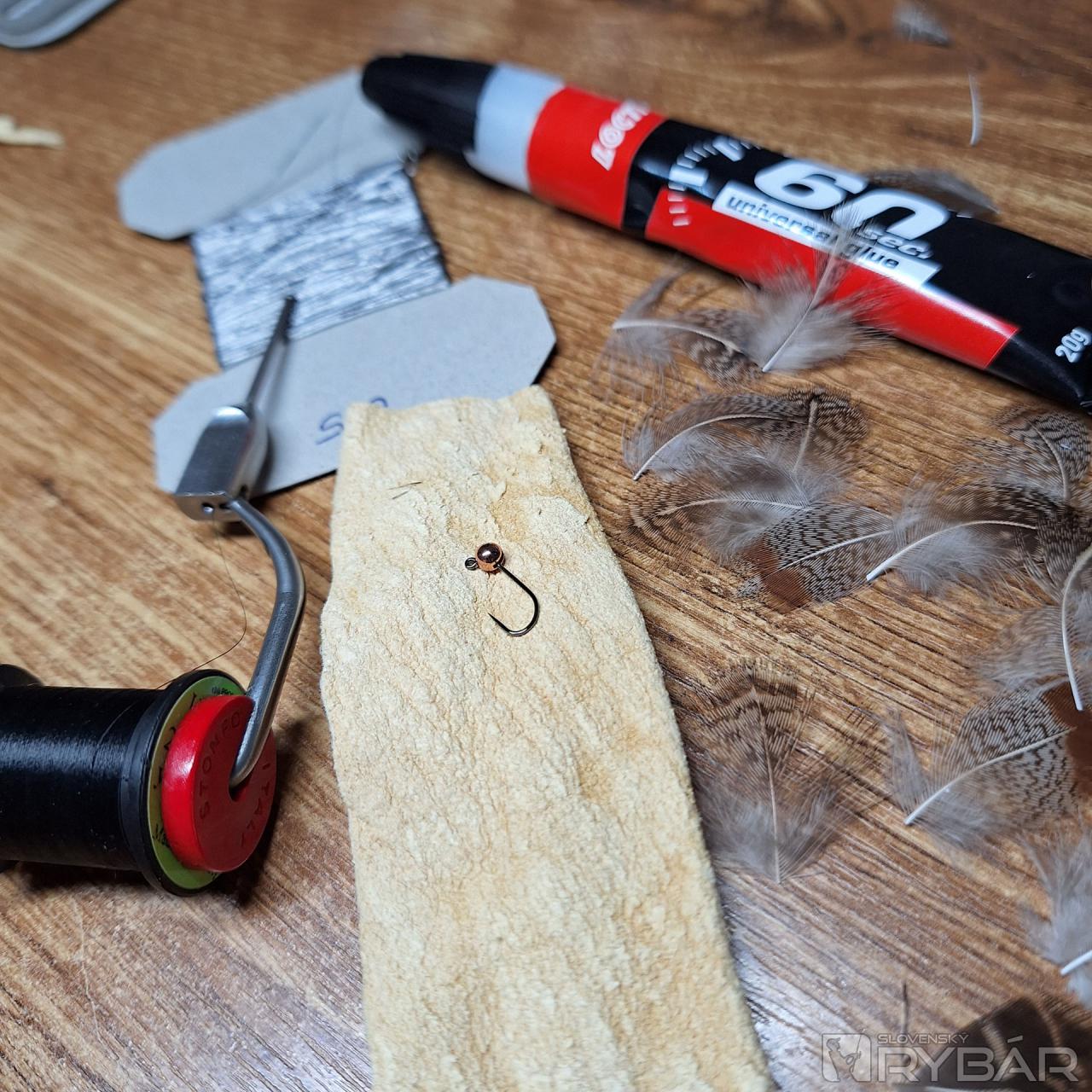 Použitý materiál: háčik jig veľkosti 12, medená hlavička 3,5 mm, olovený drôtik, čierna viazacia nitka, gélové sekundové lepidlo, pierko z hrude divého káčera, svetlohnedá jelenia koža.