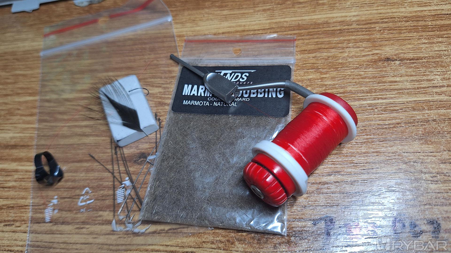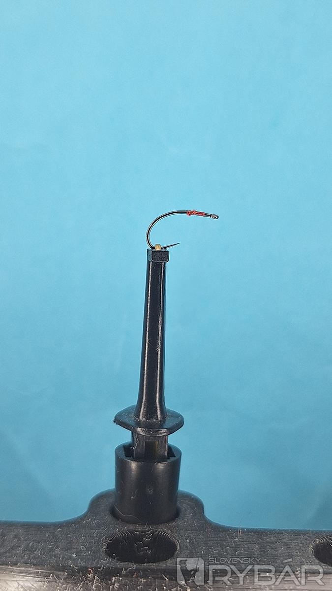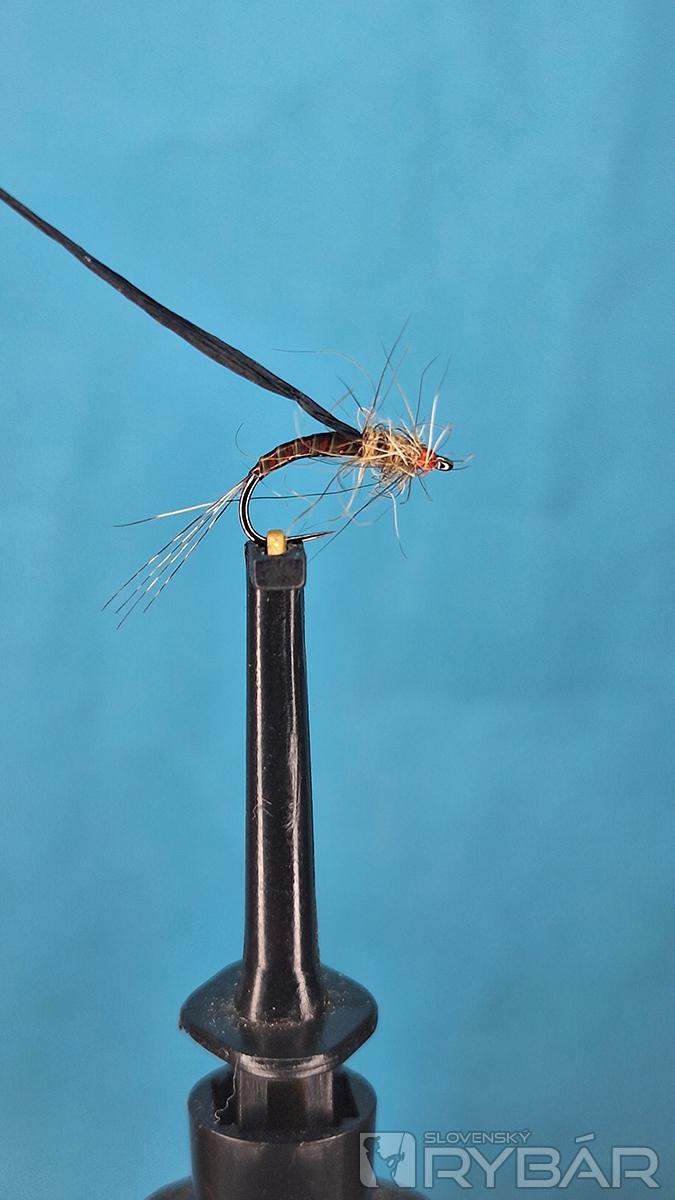 Použitý materiál: háčik jig veľkosti 12, medená hlavička 3,5 mm, olovený drôtik, čierna viazacia nitka, gélové sekundové lepidlo, pierko z hrude divého káčera, svetlohnedá jelenia koža.