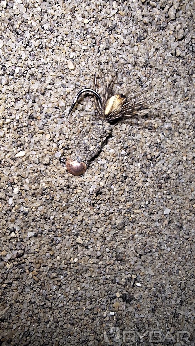 Túto schránku s vyčnievajúcou larvou potočníka používam na francúzsky typ lovenia. Väčšinou ju viažem s ťažšími hlavičkami, aby sa schránka pomaličky prevaľovala medzi kameňmi na dne, pričom mi hneď pomáha trošku spomaliť splavovanie druhej malej mušky na montáži. Farby telíčka môžeme meniť podľa toho, z čoho si v danej lokalite veľmi rady vytvárajú tieto larvy svoje schránky.