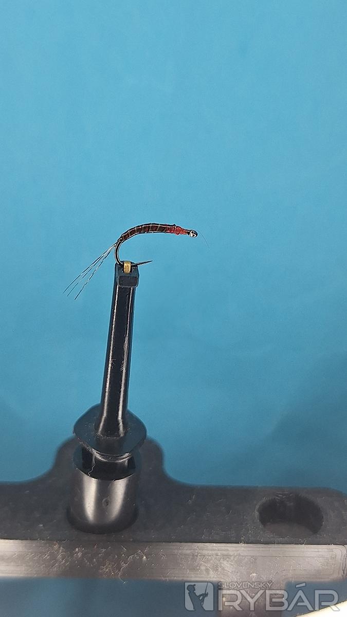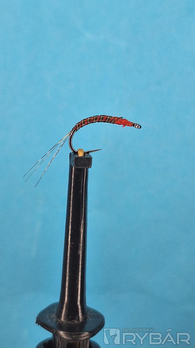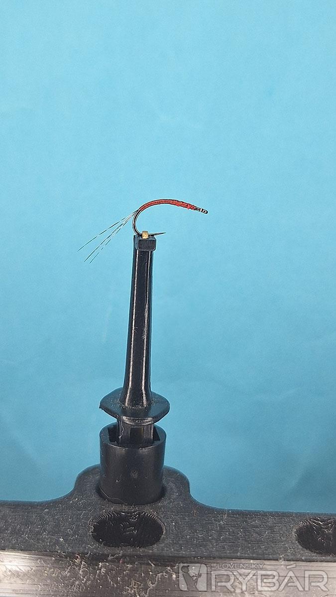 Materiál: odriapané pávie pierko, háčik veľkosti 16, červená viazacia nitka,