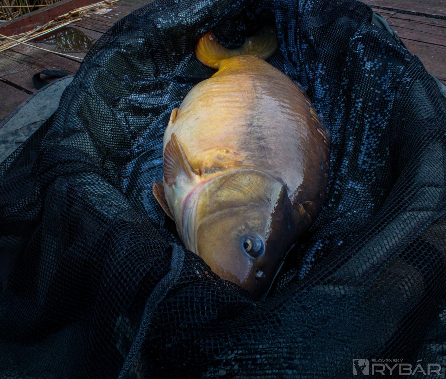 Pred zotmením som si miesta ešte dokŕmil a čakal, čo sa bude diať. Padla 22. hodina a na ľavý prút dostávam razantnú jazdu, po ktorej nasledoval neskutočný súboj. Prešlo asi 30 minút, keď sa mi ukázal mohutný šupináč... Po pár výpadoch sa mi ho podarilo dostať do podberáka a výsledok bol super. Budím priateľku, aby sme si rybku zdokumentovali a nafotili. Váha sa zastavila na 15,9 kg, čo si myslím, že je super na to, že som chytal v cca 80 cm vode. Po tejto vydarenej rybačke som sa rozhodol, že sa sem ešte vrátim a skúsim iné miesto.