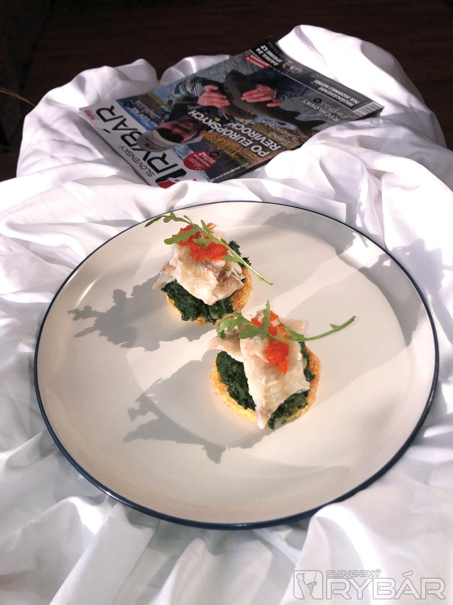2. Servírujeme takto: na chlieb vo vajci naložíme opražený špenát, na ktorý navrstvíme kúsky tresky a dozdobíme kaviárom.