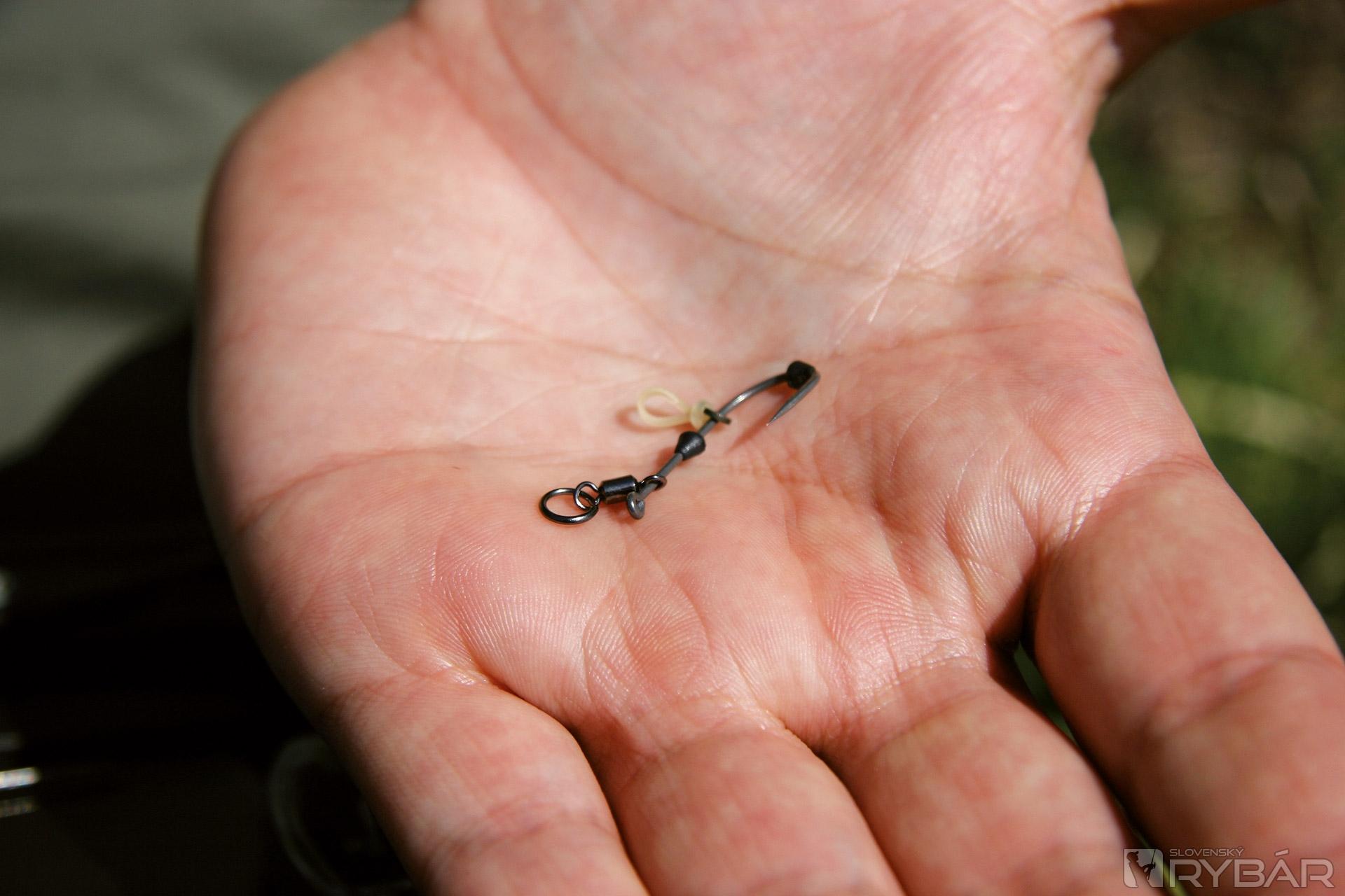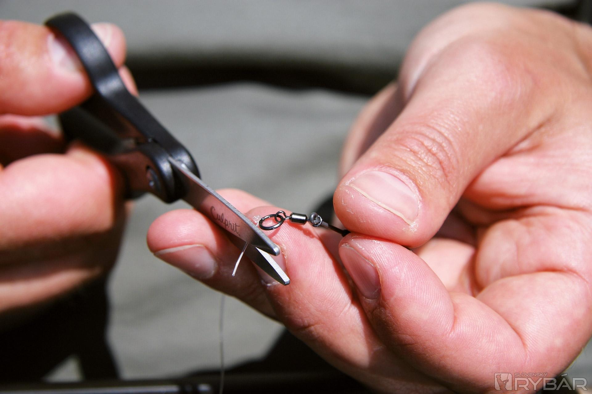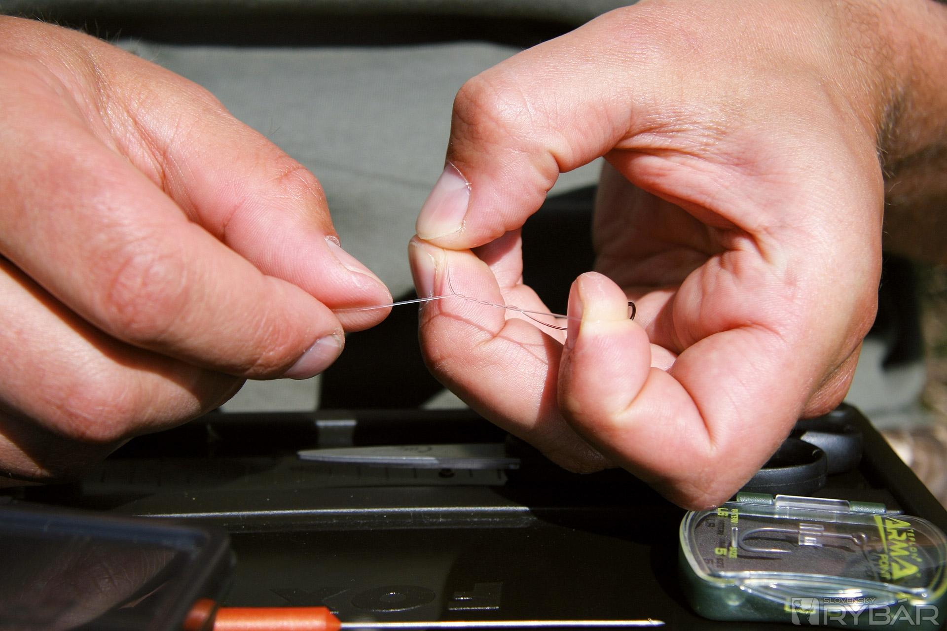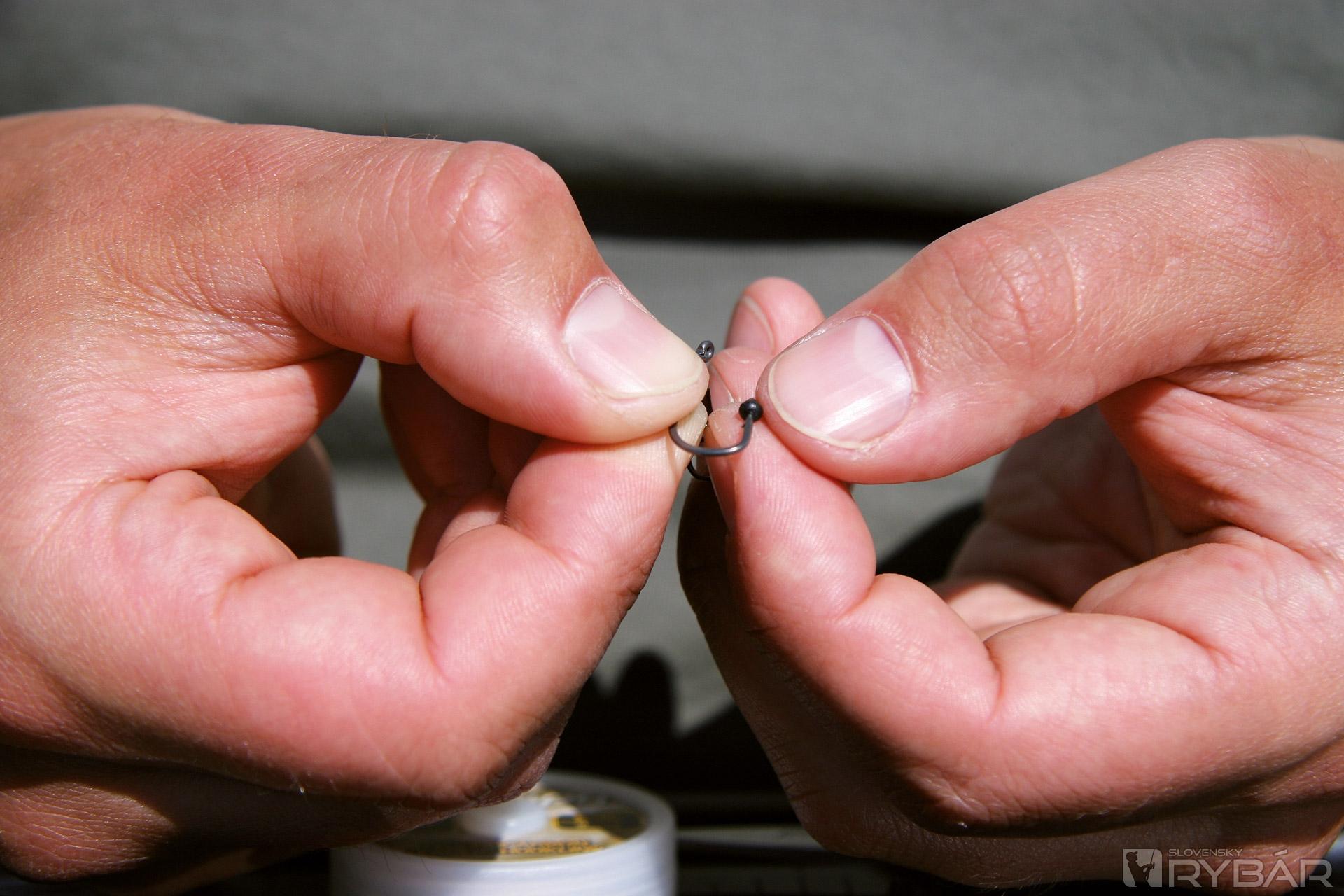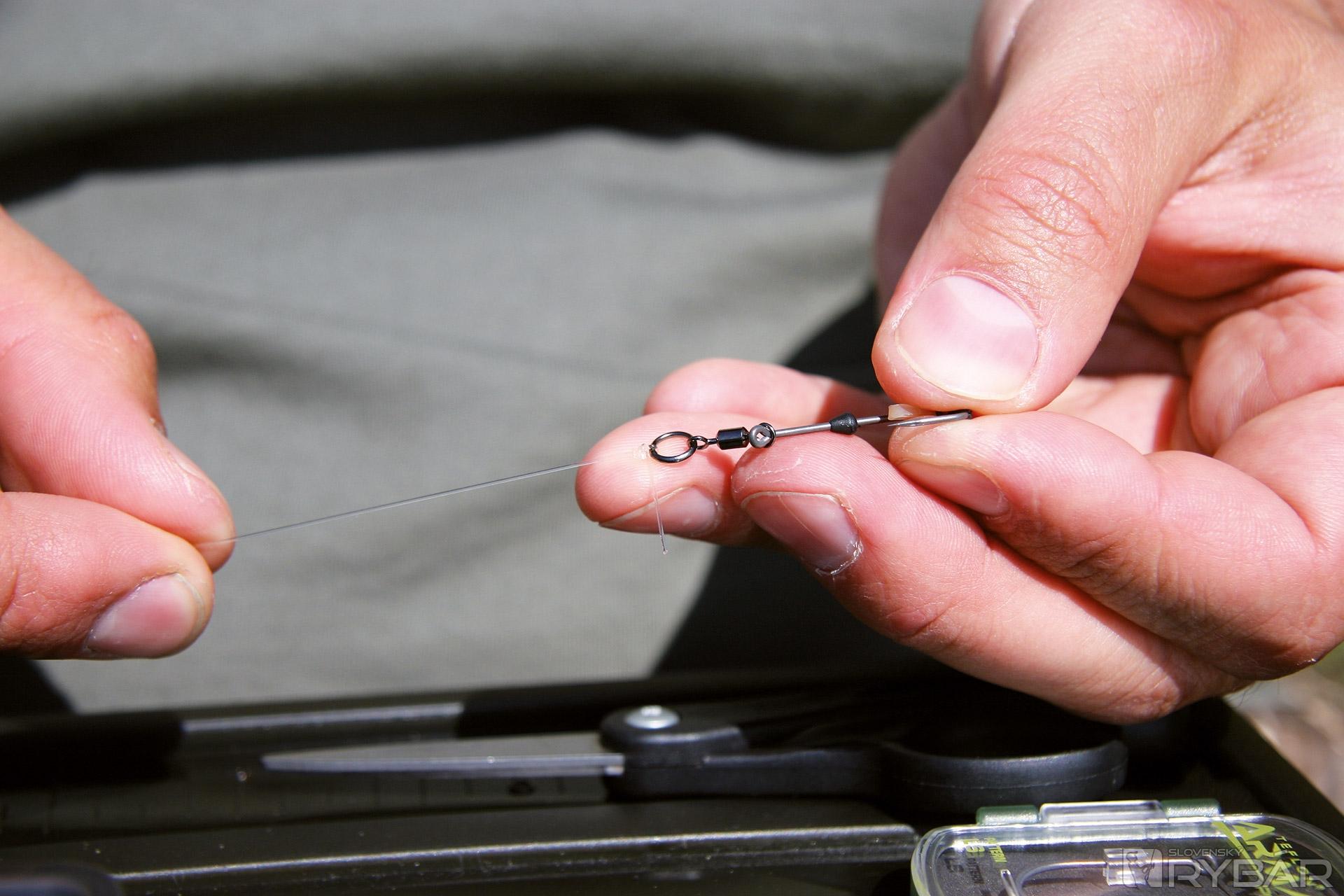 Na opačný koniec vlasca uviažte obratlík s krúžkom vo veľkosti 7. Vlasec sa na krúžku pritom uviaže na uzol.