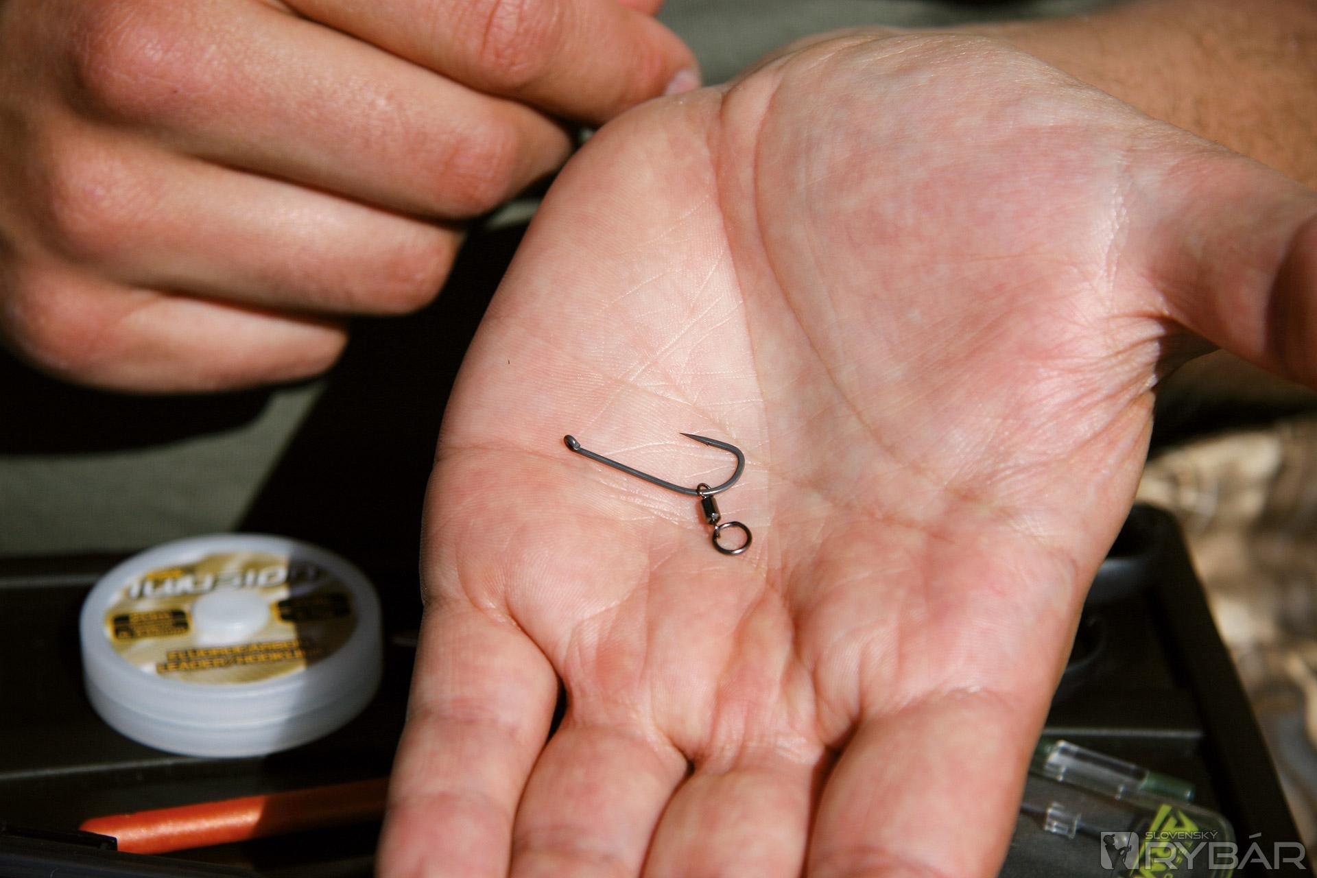 Koniec 25 cm fluorcarbonového vlasca uviažte na krúžok obratlíka na háčiku. Navlhčite uzol pred stiahnutím slinou.