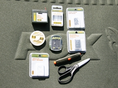 Tu vidíte potrebné jednotlivé časti montáže, ako napr. Illusions - fluorcarbonátový vlasec, háčik Fox Armapoint LS veľ. 5, obratlík s krúžkom, gumené stopery, sekundové lepidlo a pod.