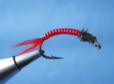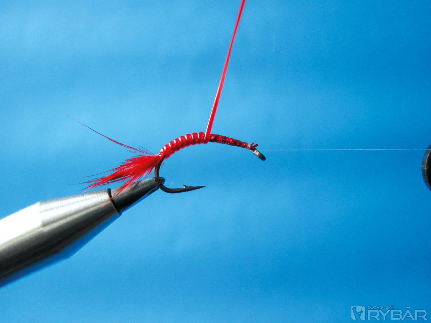 Viazacou niťou naviažeme snopček červeného peria marabou a červený bodyglass.