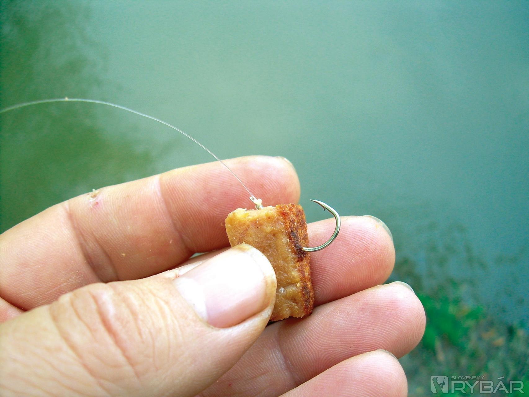 Takto síce budú dva vpichy do nástrahy, ale nebude natoľko poškodená, ako keby sme háčik vtiahli celý do nástrahy. Tým by sme nástrahu len narezali a stala by sa krehkejšou. Spomenuté dva vpichy, ak budú jemné, čiastočne zafixujú nástrahu na háčiku a tá tam potom lepšie drží, ale len do chvíle, pokým ju nezačnú ochutnávať ryby.