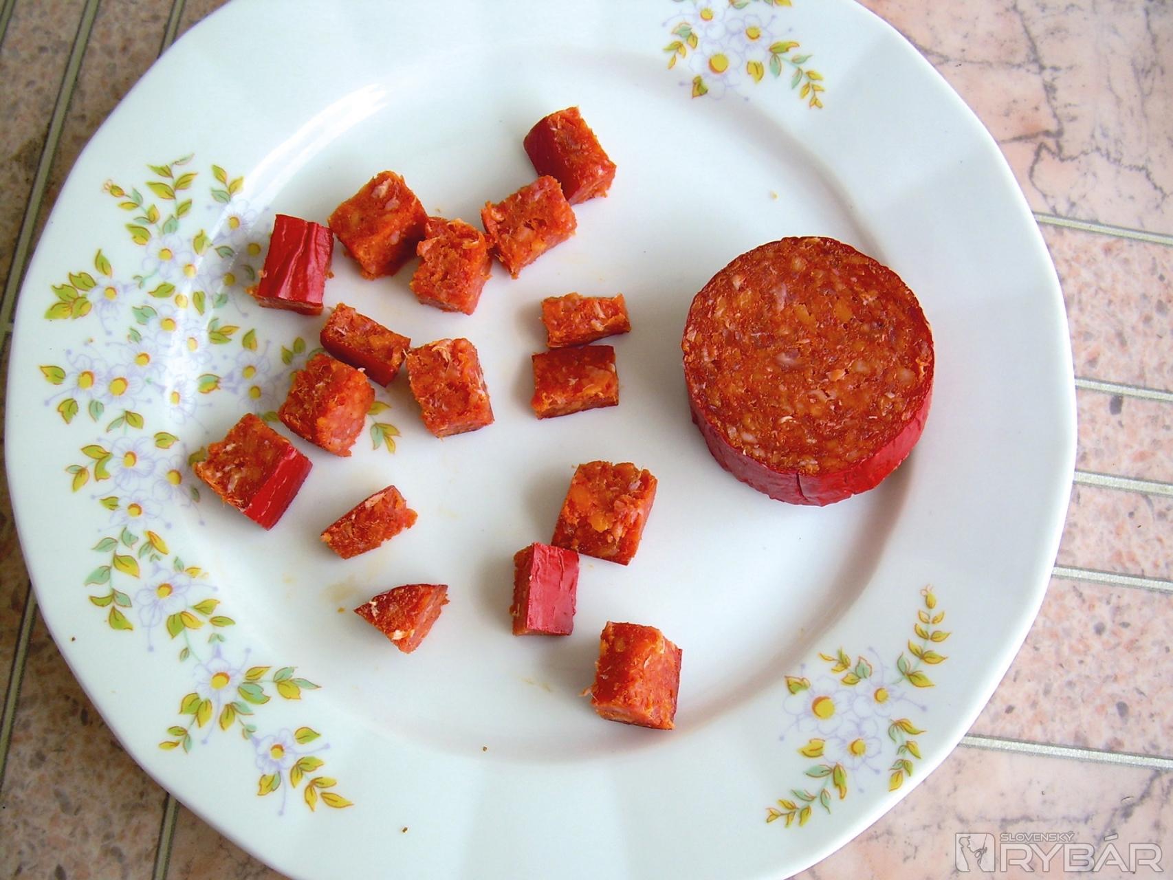 O niečo lepšie na háčiku držia rôzne suché salámy, ktoré sú predsa len o niečo kompaktnejšie a vydržia nastražené podstatne dlhšie. Nemusíme rybám hneď predkladať drahé salámy, stačia aj tie lacné. Veľmi dobré sú aj rôzne paprikové salámy. Červená paprika je pre ryby veľmi zaujímavá svojou vôňou, ale aj farbou.