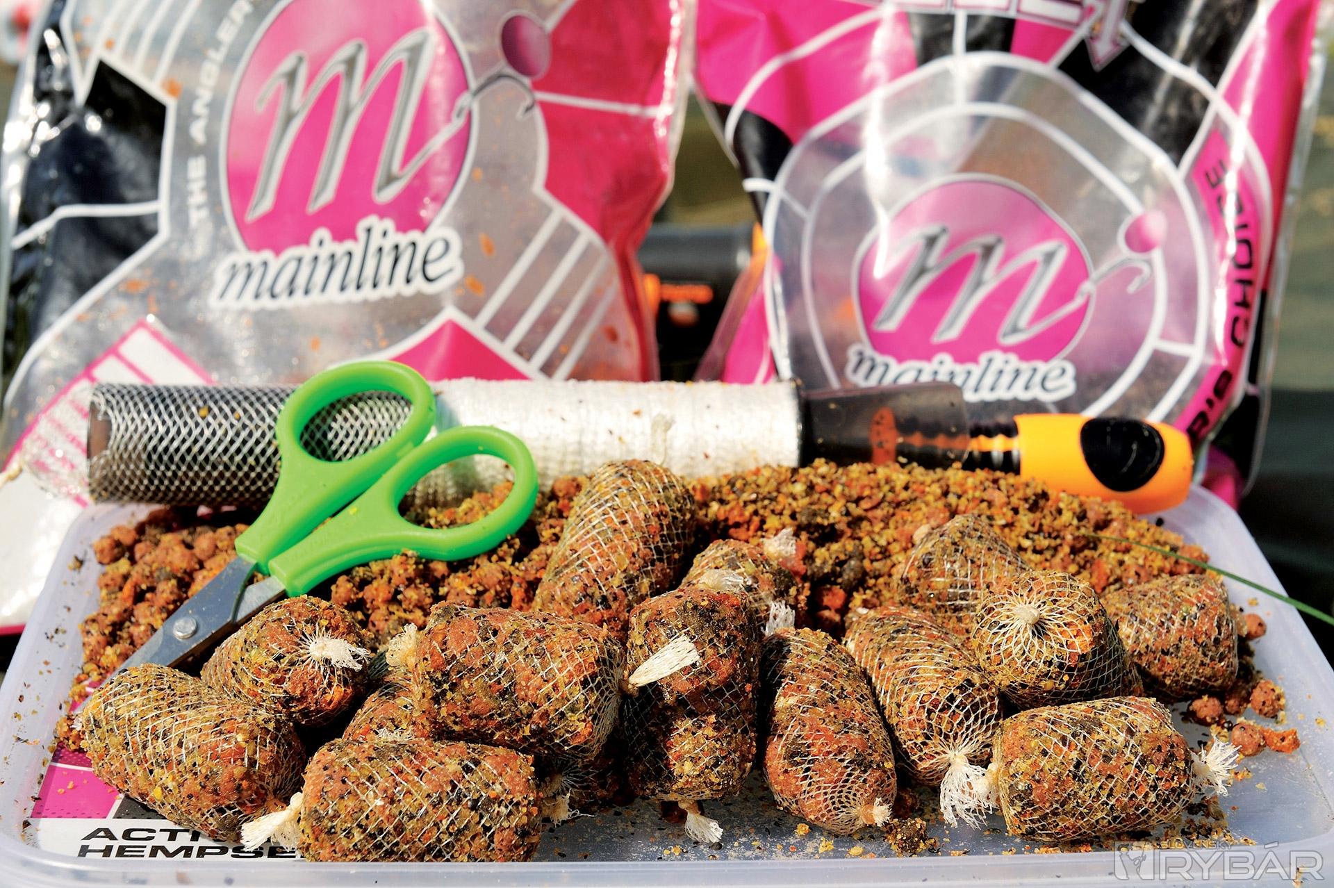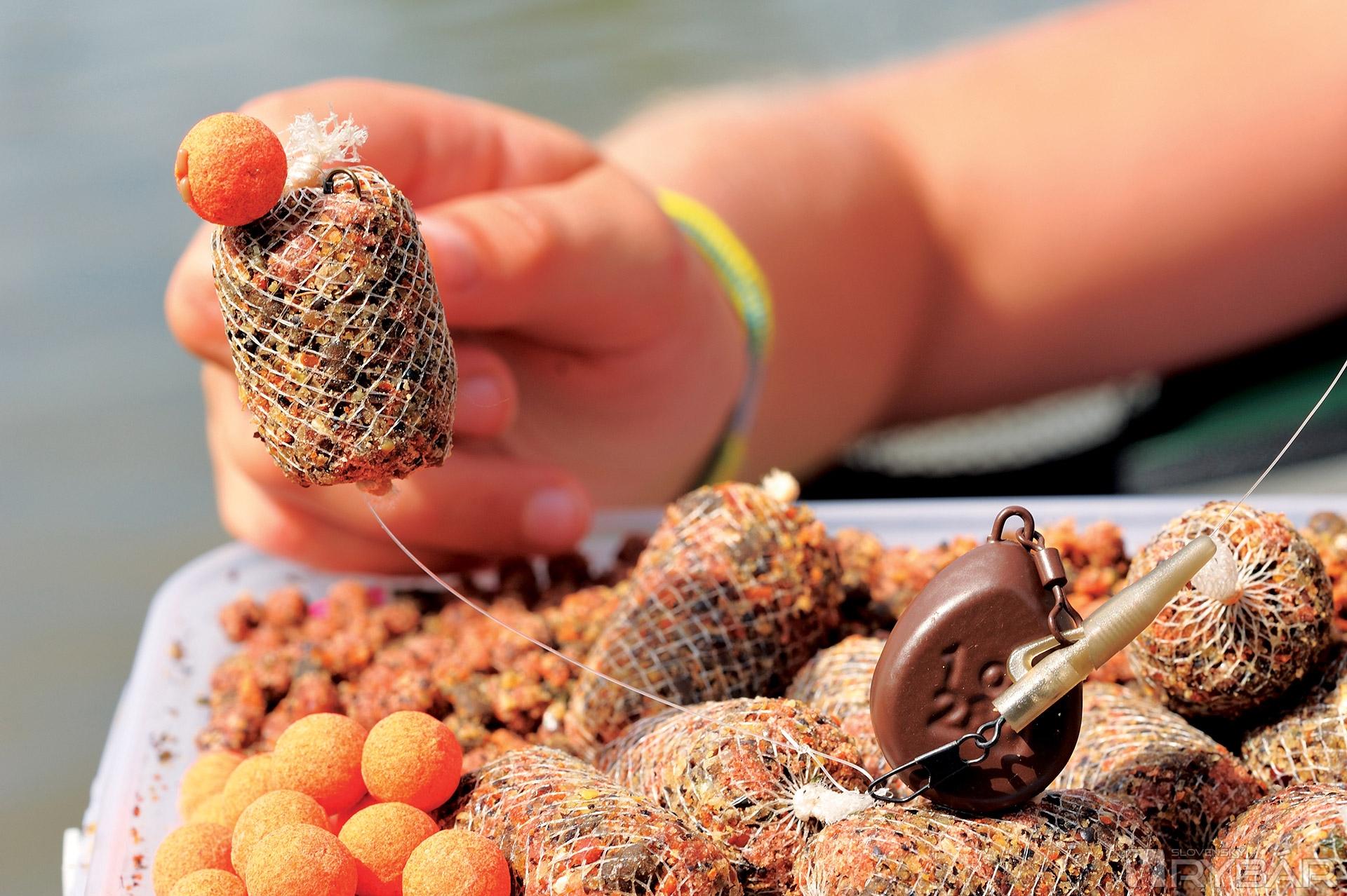 Ako prvé použijem veľké kŕmne gule na zatraktívnenie lovného miesta. Toto krmivo pozostáva z kombinácie peliet a základného krmiva zhotoveného väčšinou z konope. Kvôli silnému prúdu a mnohým lodiam si musím byť istá, že krmivo je poriadne ťažké. Ak použijete ľahké krmivo, oblak bude o chvíľu odplavený a pre nalákanie rýb nezostane nič. Posledná zložka je podrvené boilies a hrsť miniboilies. Nástrahy si rolujeme sami a pre tento lov sme si zhotovili oranžové guľôčky. Riečne ryby používajú svoj zrak veľmi často a reagujú na žiarivé farby. Ak sa príliš nekŕmia, sú lepšie „kamuflážne“ farby nástrah.