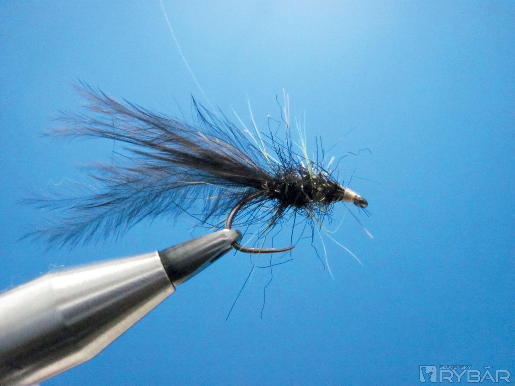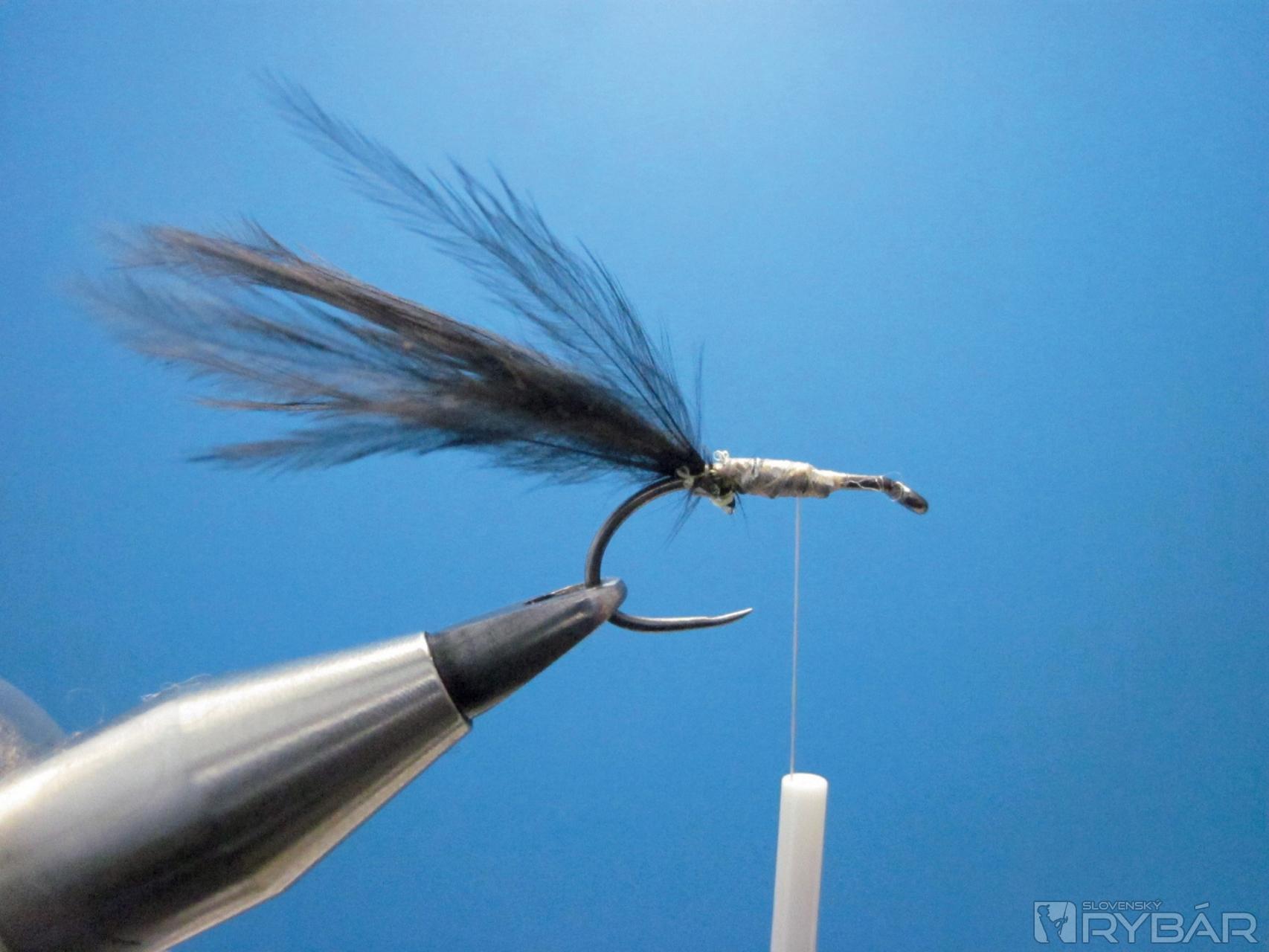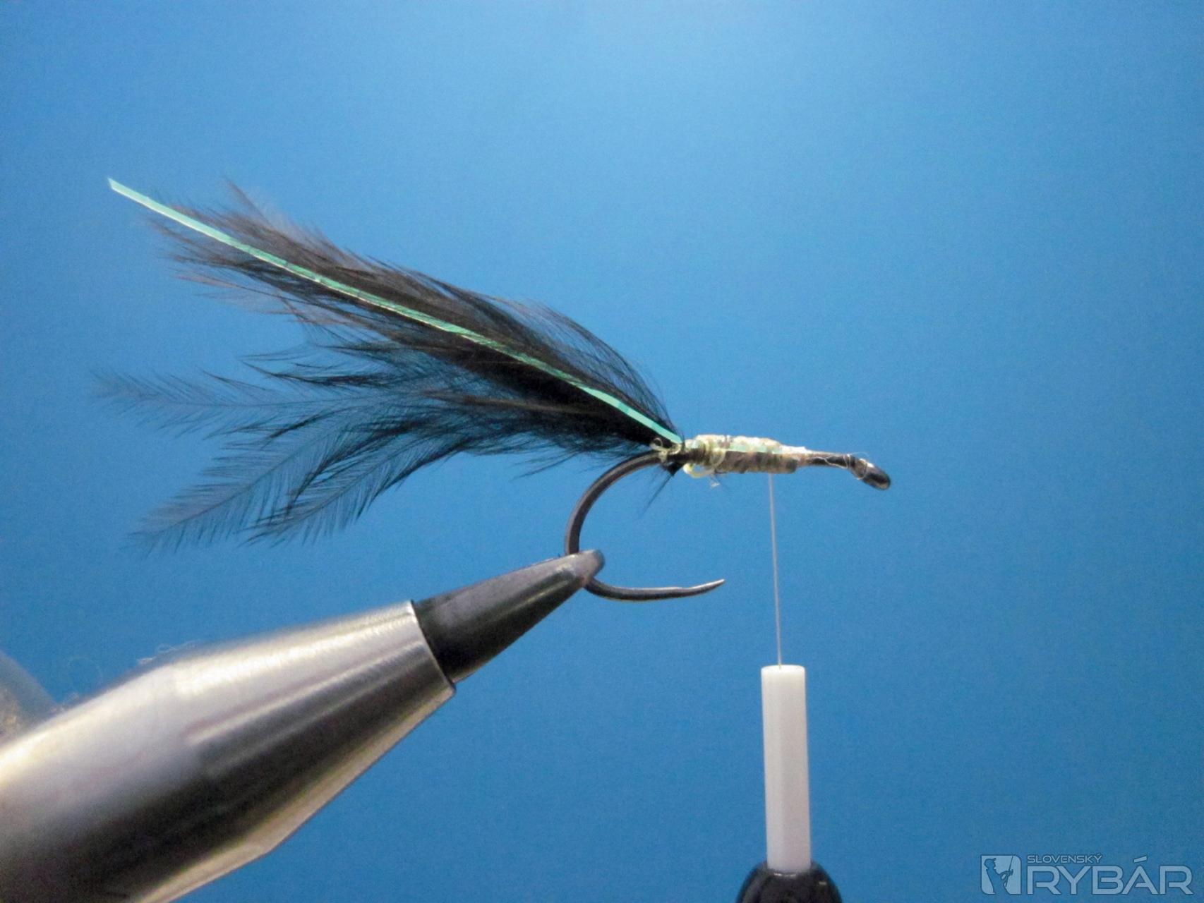 Háčik s krátkym ramienkom, čierne marabou, perleťová lametka, čierny dabing, chvost z veveričky, olovený pásik.