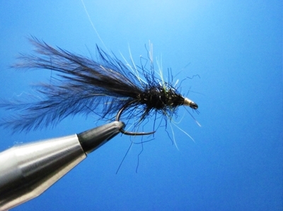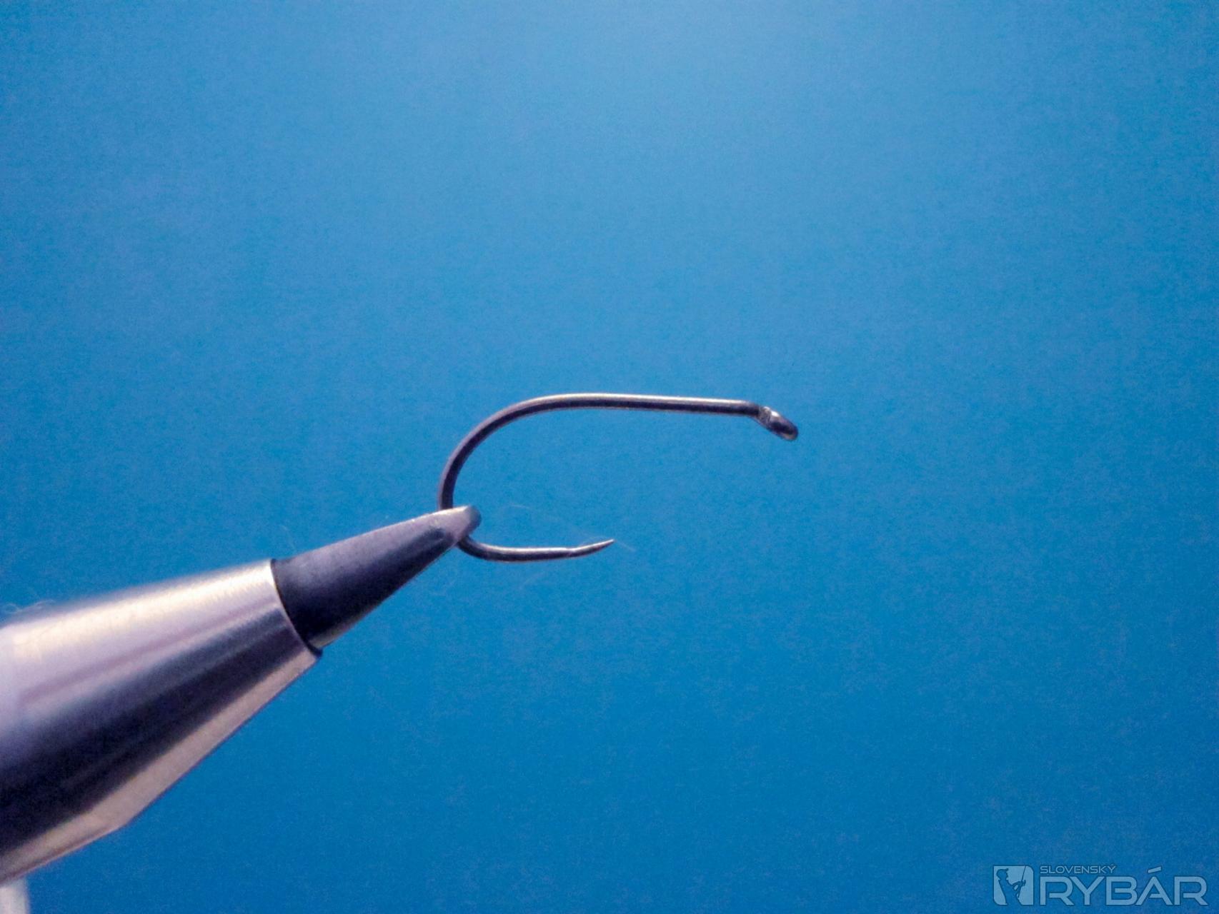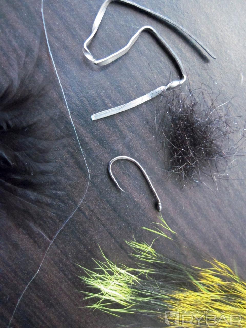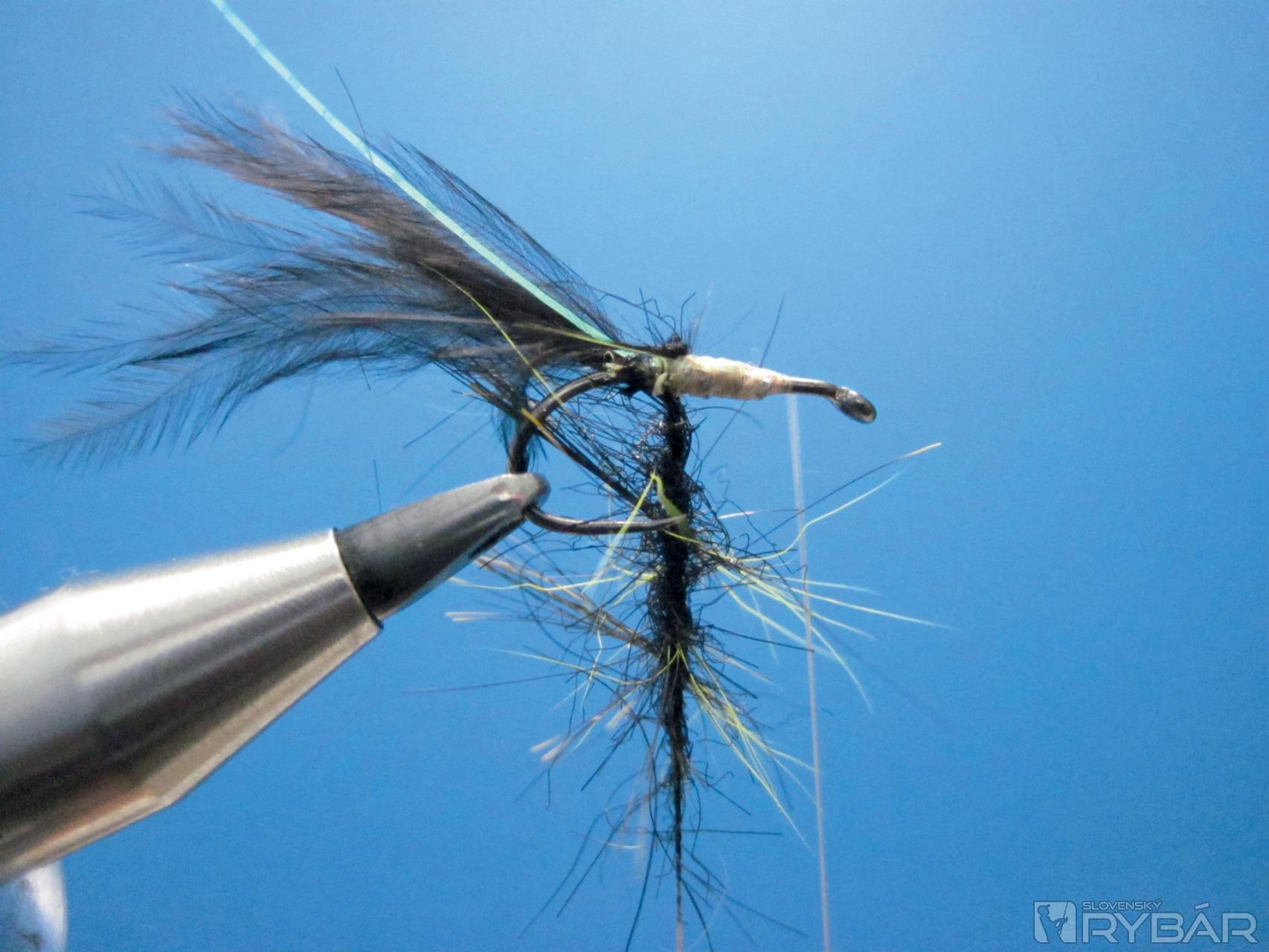 Háčik s krátkym ramienkom, čierne marabou, perleťová lametka, čierny dabing, chvost z veveričky, olovený pásik.