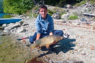 Jasné, že ja som sa zameral hneď na najväčšieho z nich, krásneho tmavého šupináča. Tipoval som mu niečo okolo 10 kilogramov. Ten sa ukrýval pod previsnutým konárom. Od začiatku mi bolo jasné, že bude opatrný. Montáž som mal úplne jednoduchú, ktorú som si sám vymyslel na tento lov. Fluorokarbón, ostrý háčik, brok a plávajúca nástraha. Takto som inde lovil na hladine karasy a kapríky. Pod háčik som teda na vlas našil 18 mm pop-up boilies príchuť Sladká mandľa.