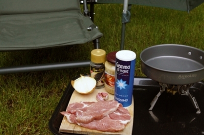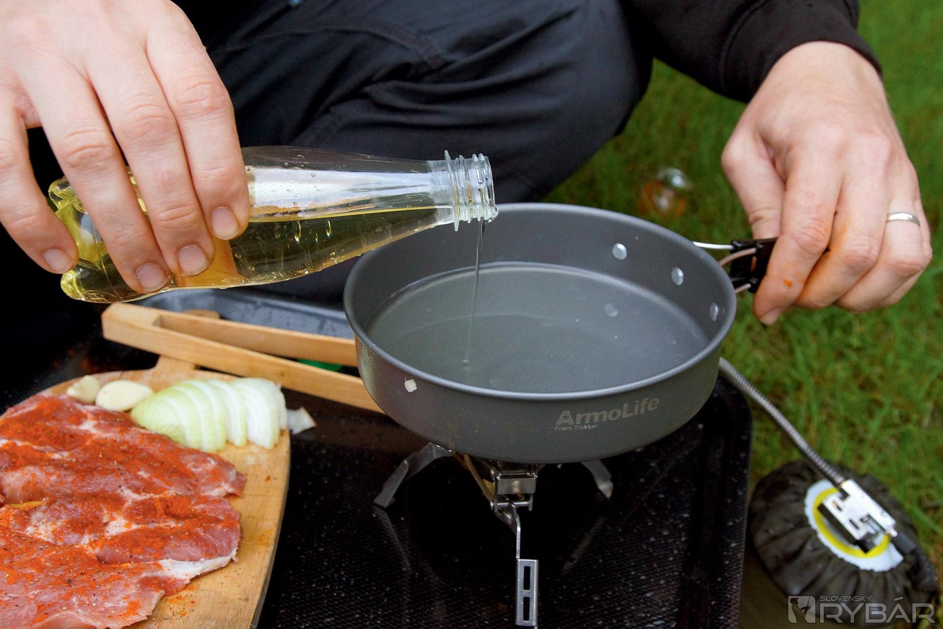 Na druhý deň vyberieme, preložíme do umelohmotnej misky a vezmeme so sebou k vode. Po nahodení udíc nastáva konečne čas na zahnanie hladu, a tak poriadne rozohrejeme na panvici olej a prudko osmažíme jednotlivé kusy marinovaného mäsa z každej strany 2-3 minúty. Na konci do výpeku opatrne vlejeme trochu vody (pozor na prskanie) a v ňom podusíme do mäkka nakrájanú cibuľu.