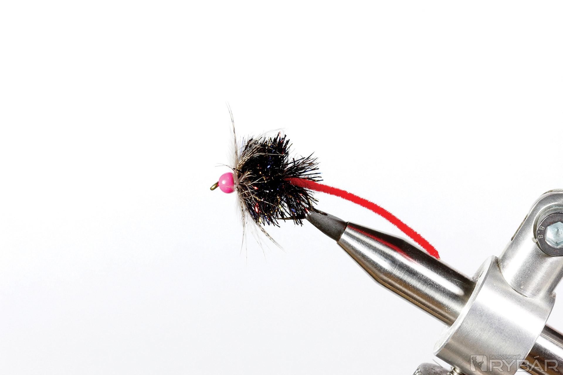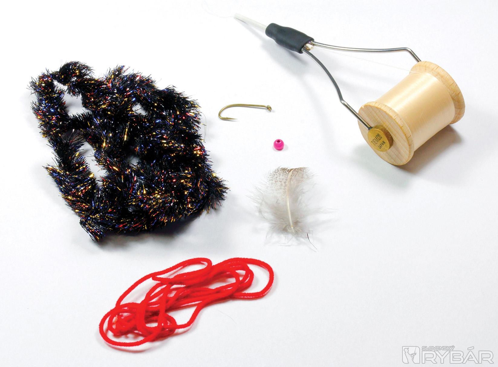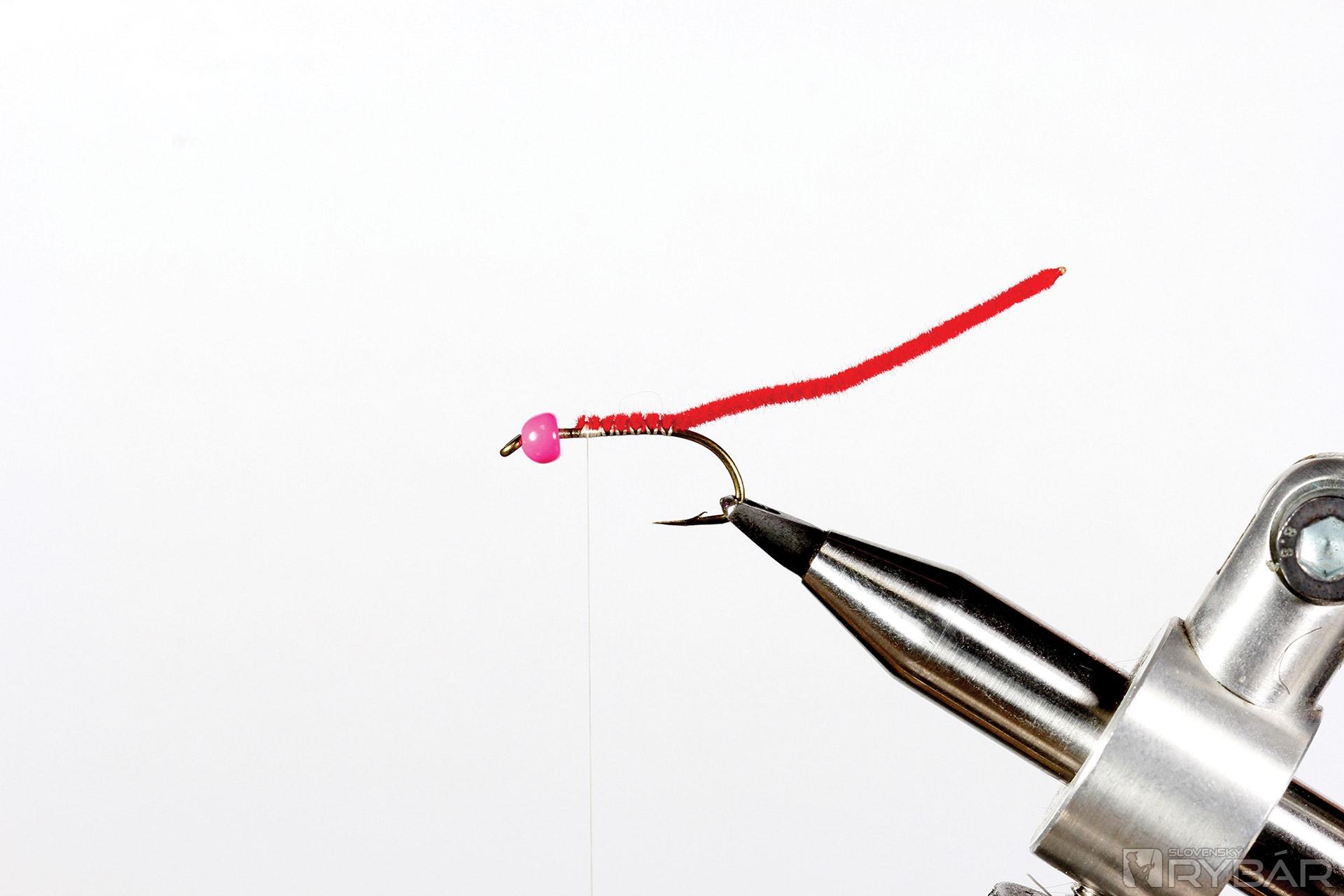 mokrý pevnejší háčik, ružová volfrámová guľôčka, červená šenilka, objemná blobová šenilka, pierko z jarabice.