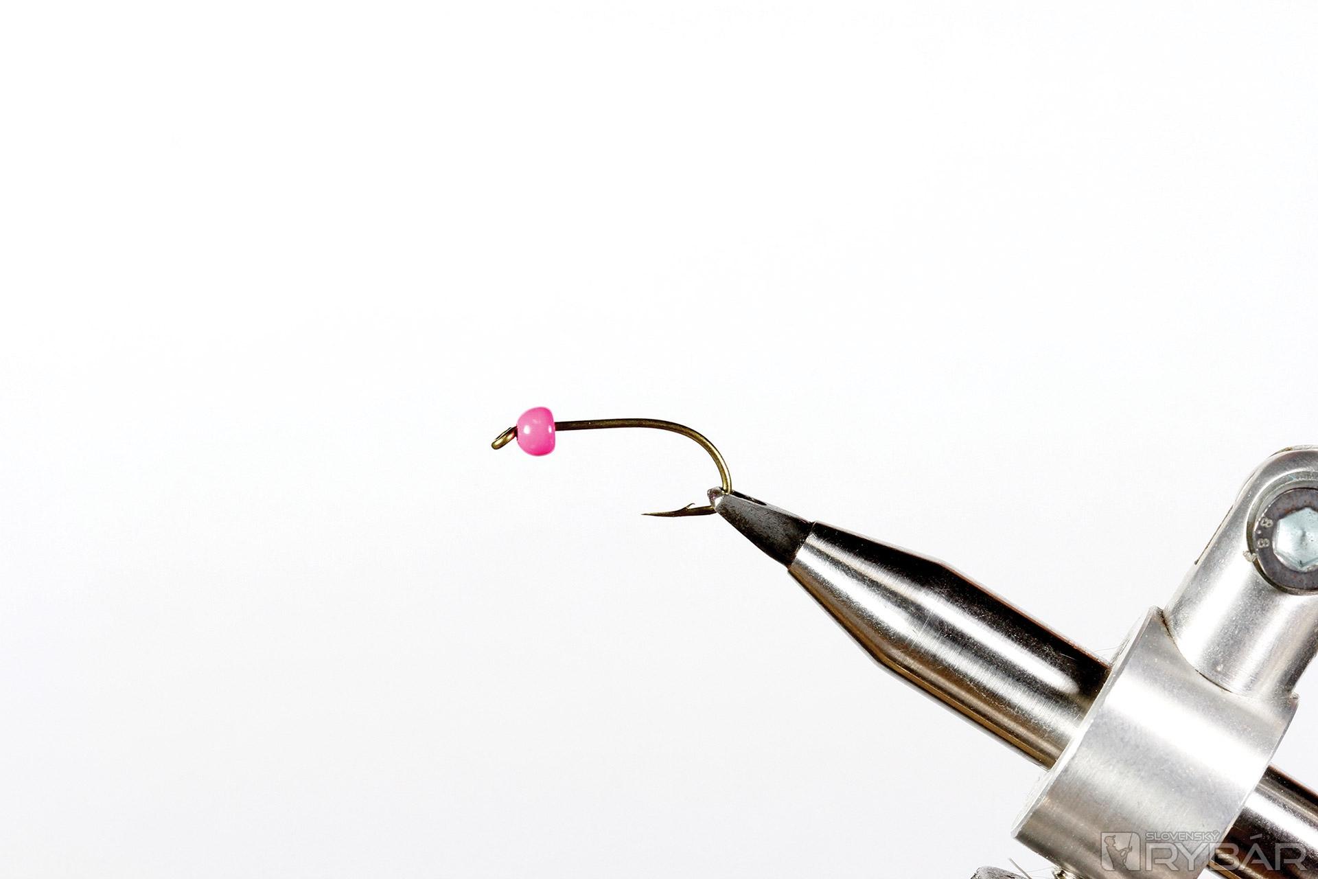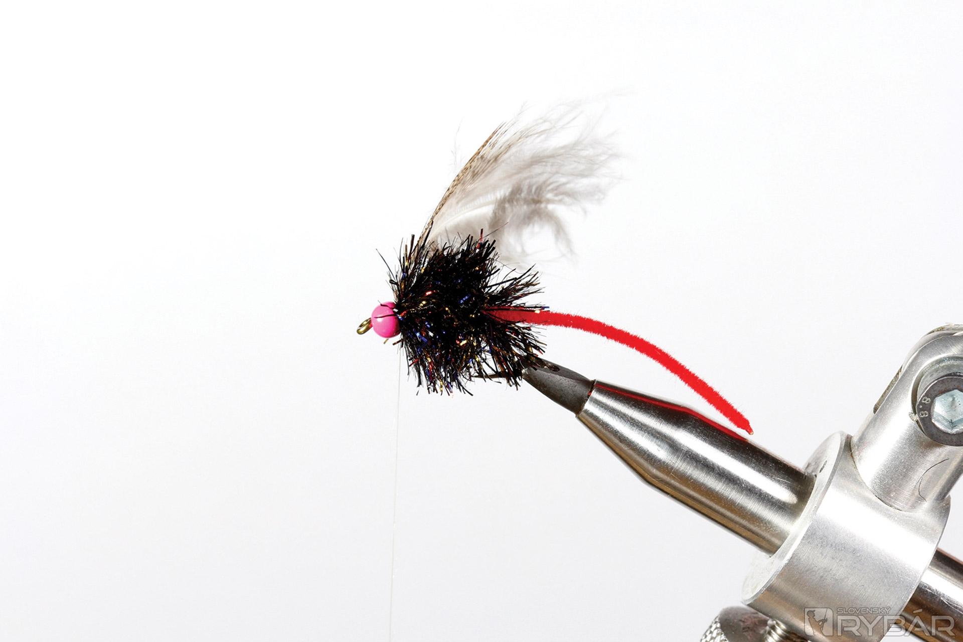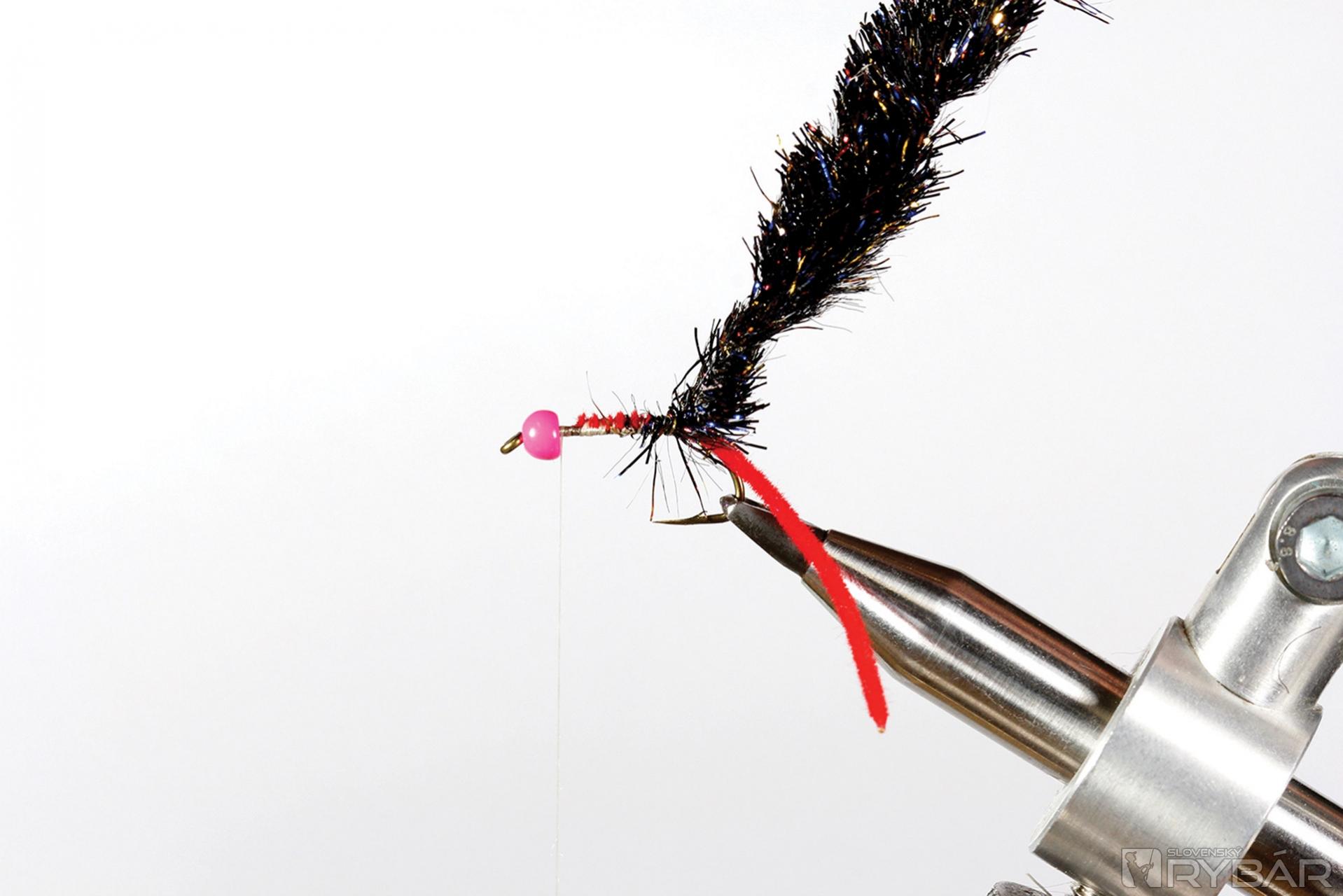 mokrý pevnejší háčik, ružová volfrámová guľôčka, červená šenilka, objemná blobová šenilka, pierko z jarabice.