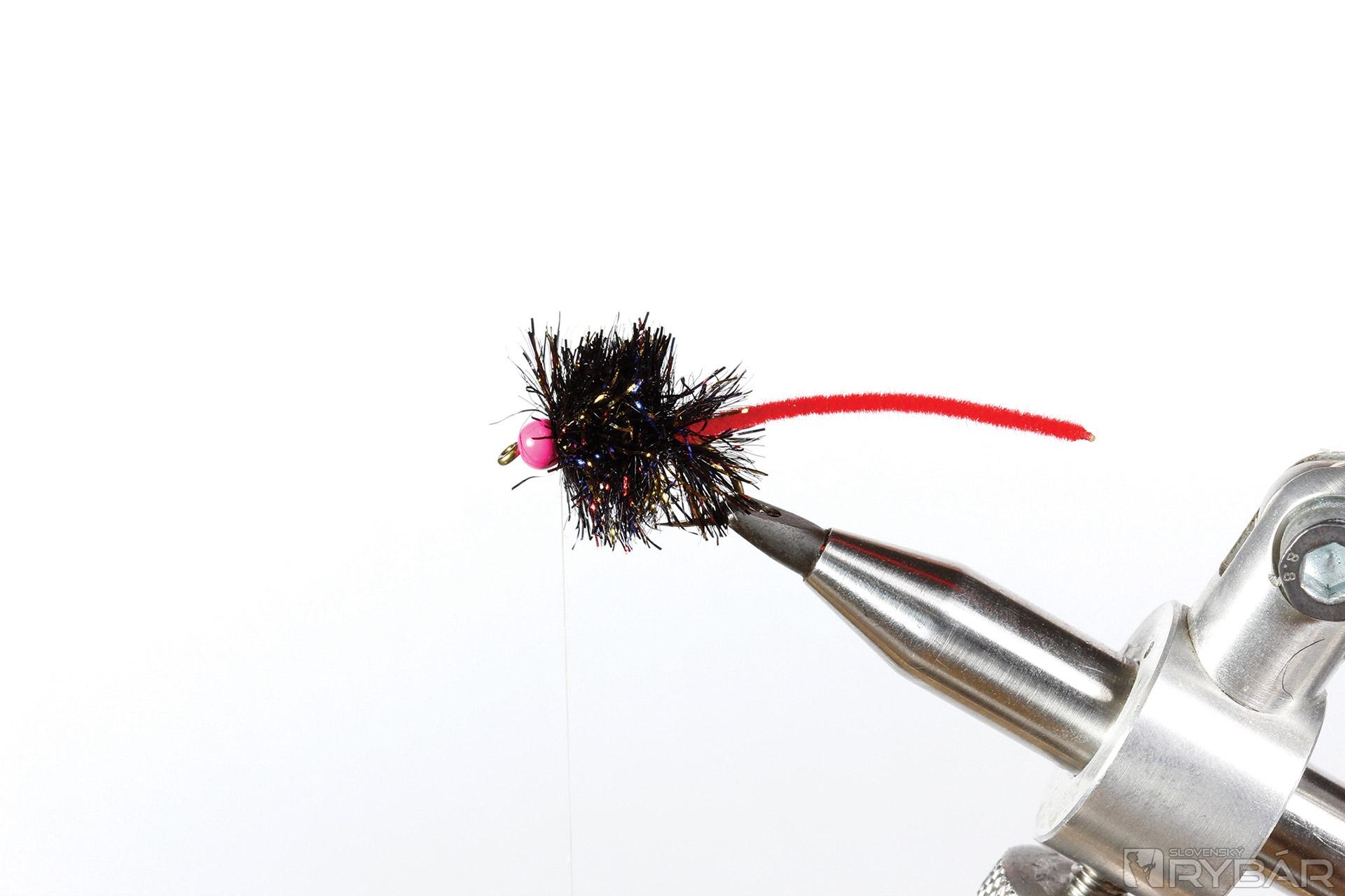 Materiály: mokrý pevnejší háčik, ružová volfrámová guľôčka, červená šenilka, objemná blobová šenilka, pierko z jarabice.