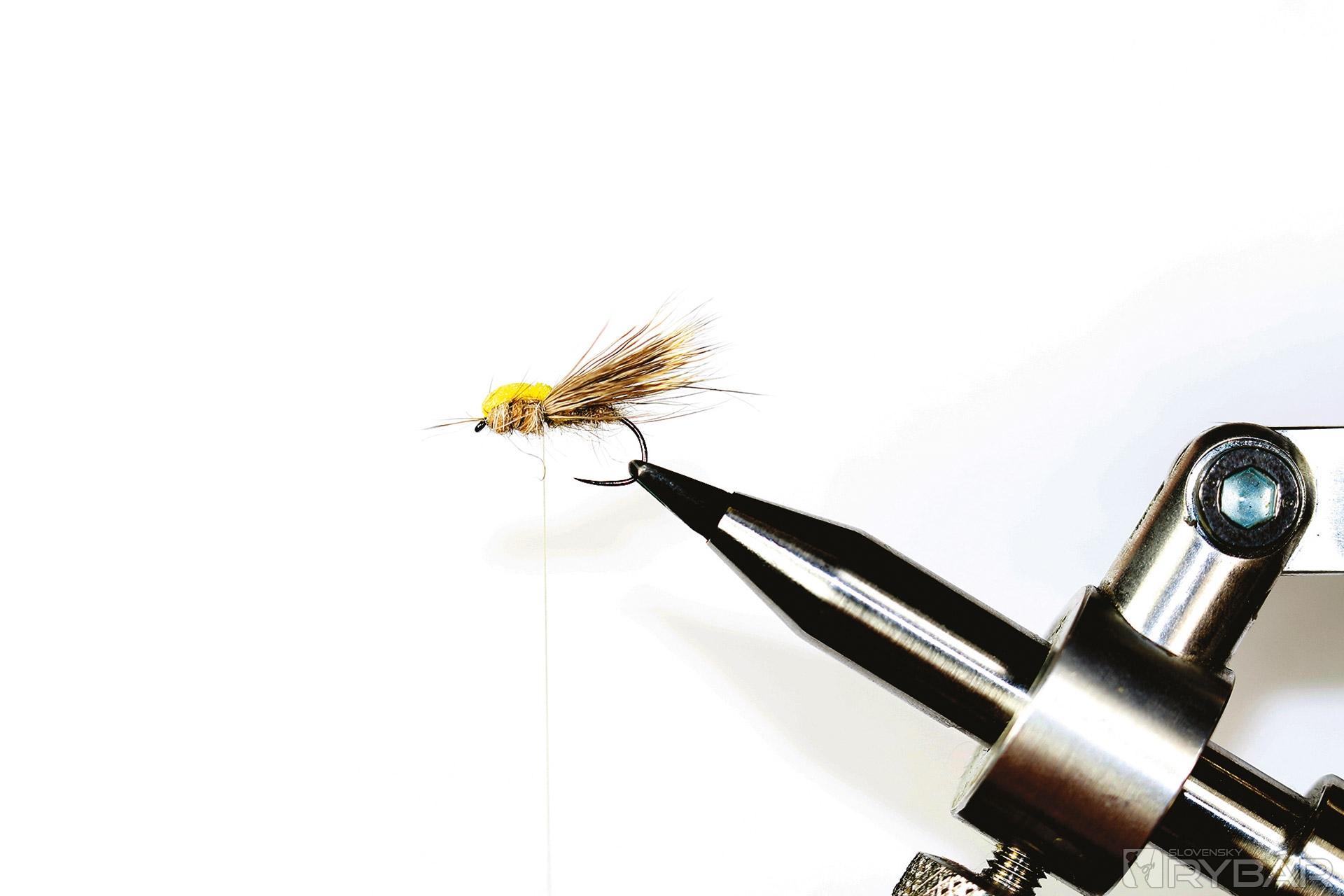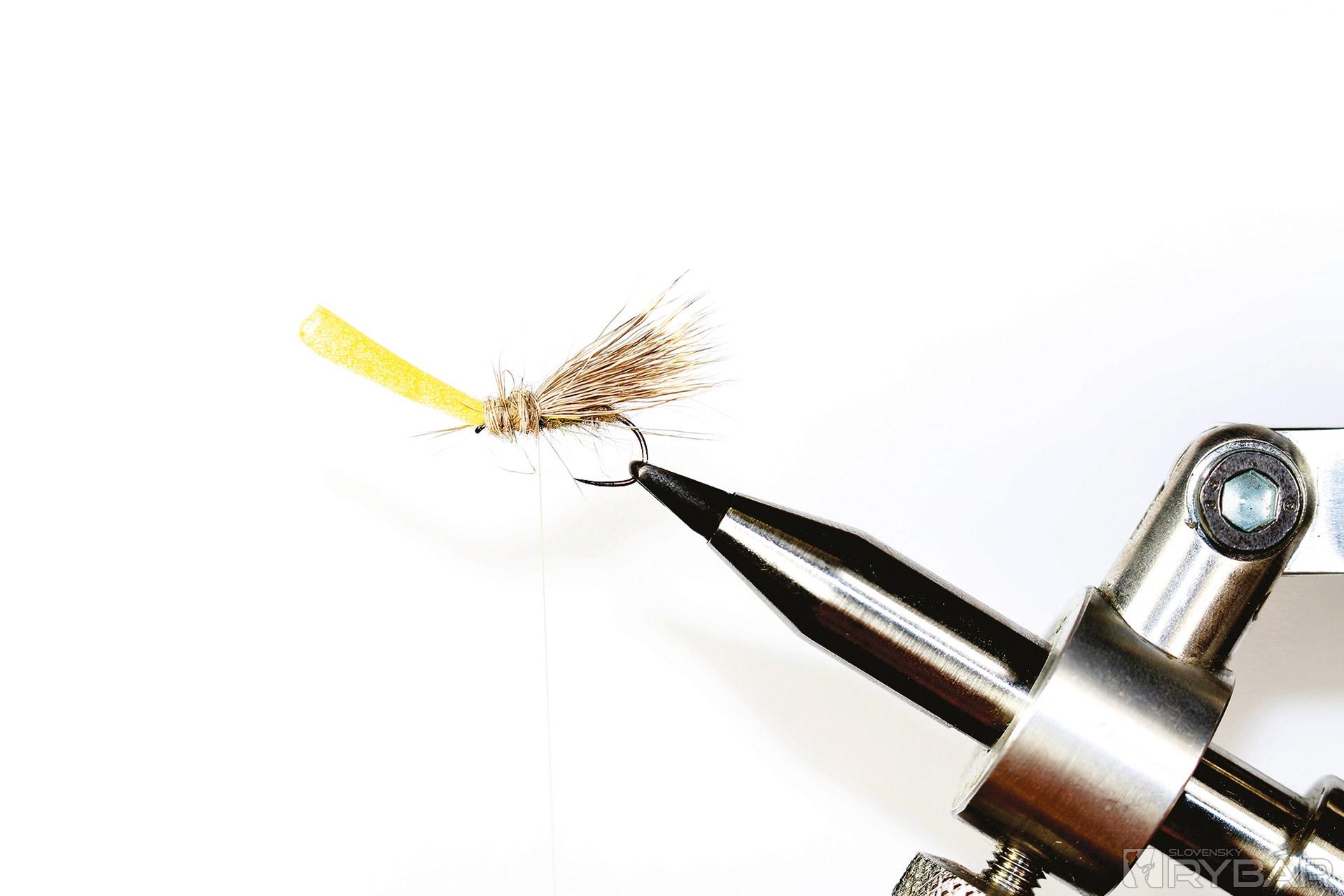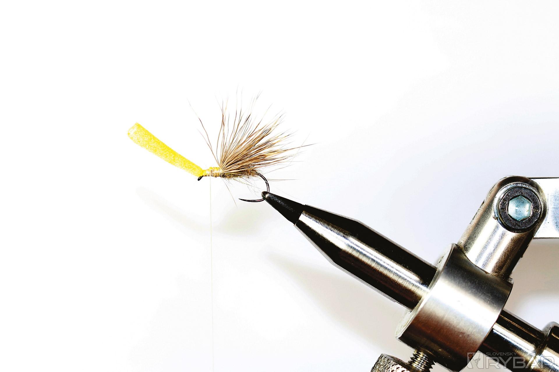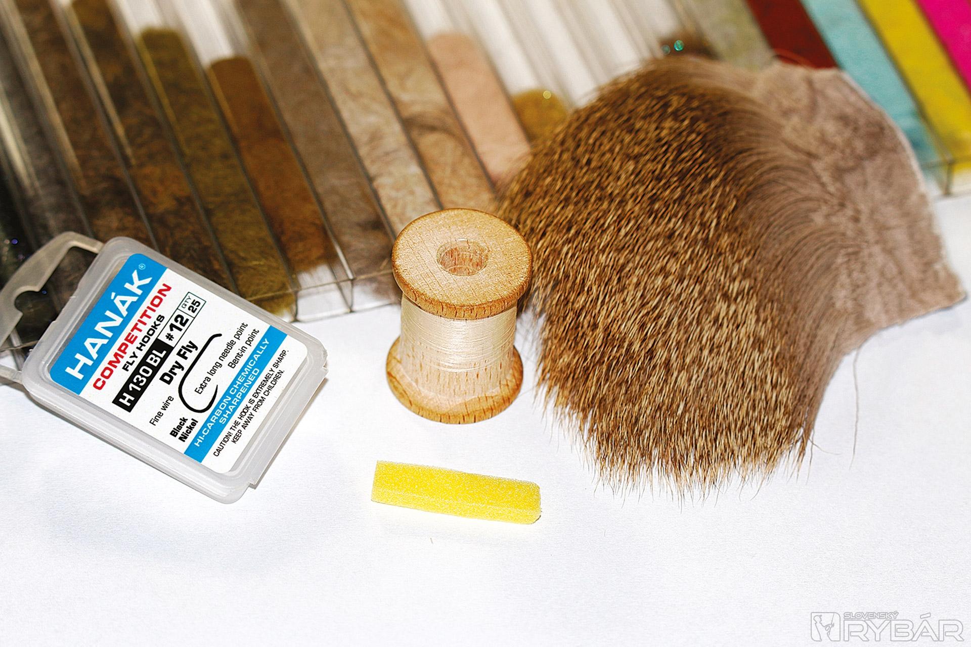 suchý háčik, svetlá viazacia niť, svetlejší prírodný dabing, žltý polycelon, srsť z jeleňa alebo srnca.