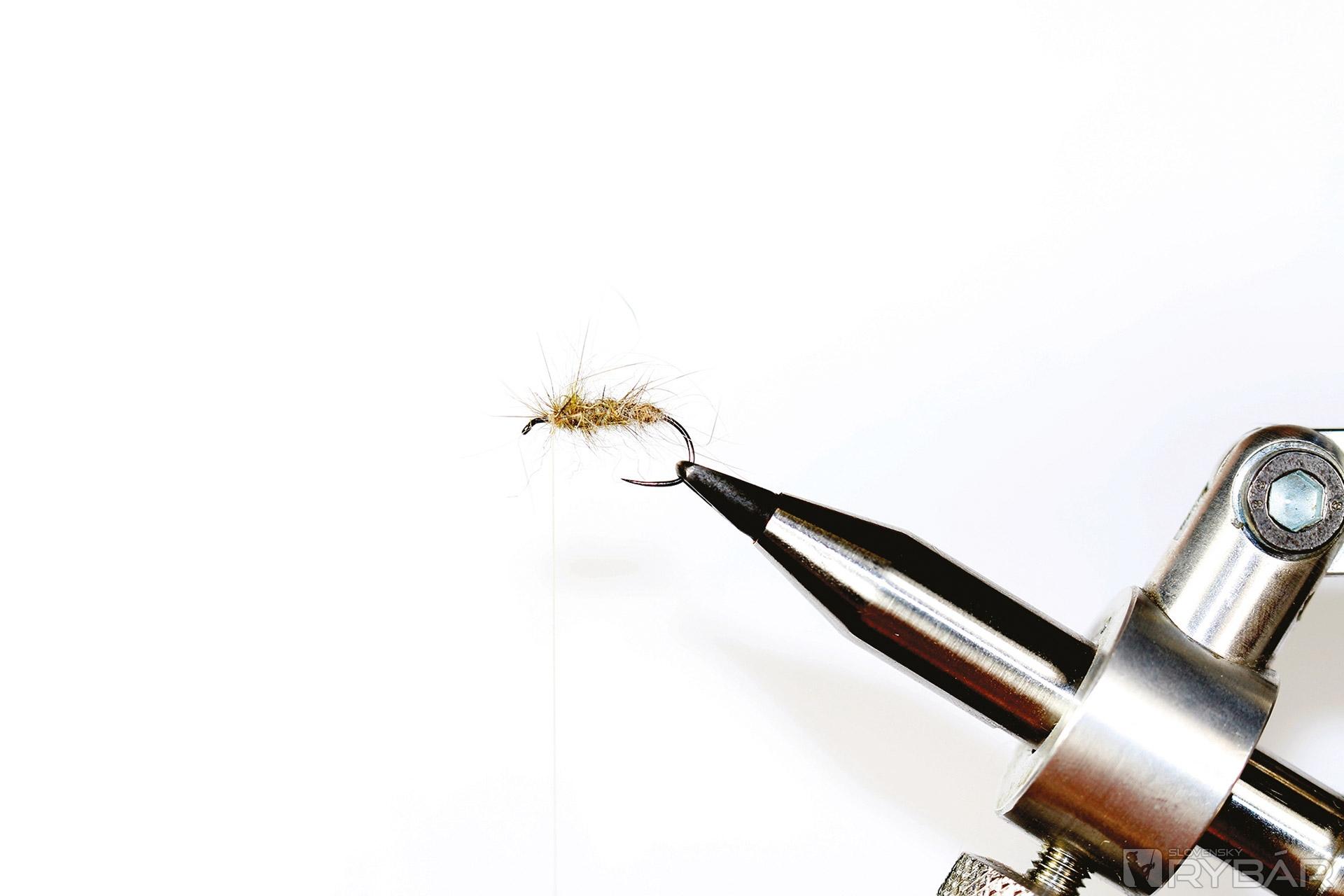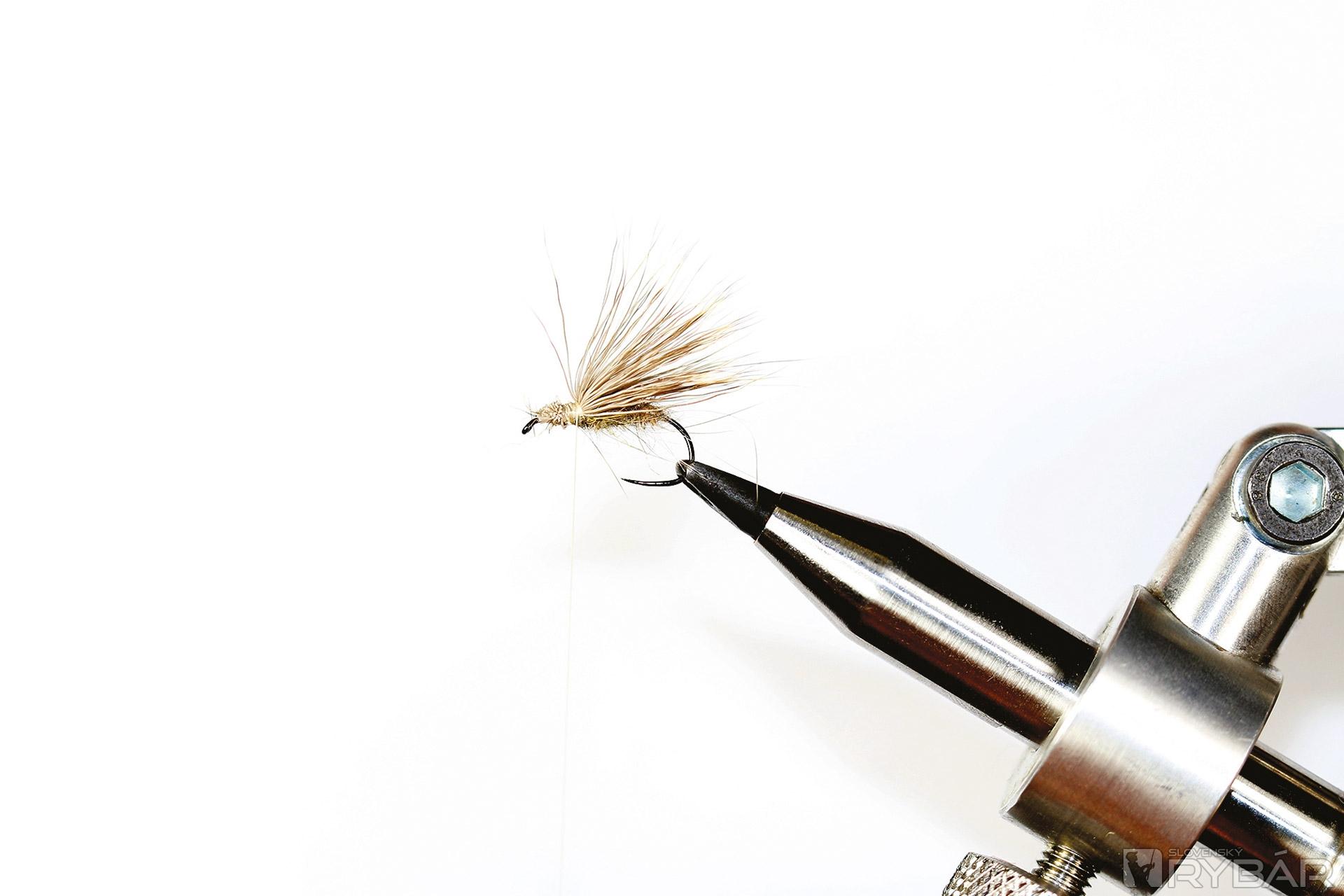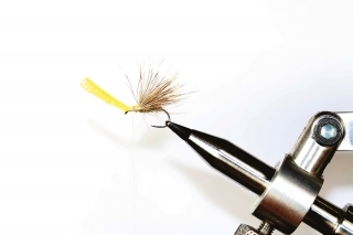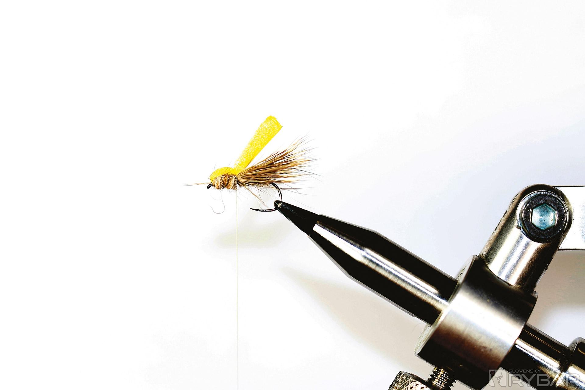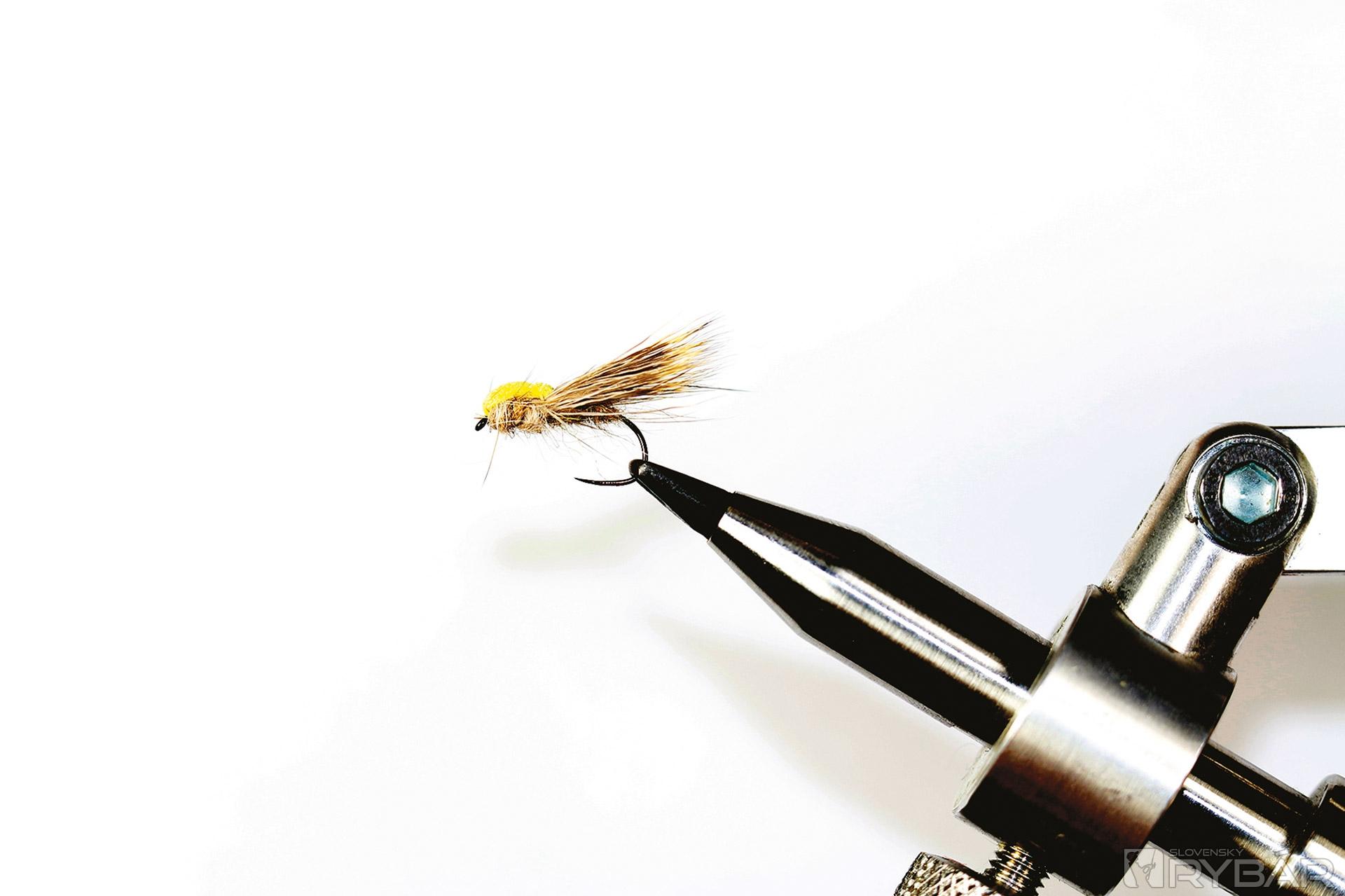 suchý háčik, svetlá viazacia niť, svetlejší prírodný dabing, žltý polycelon, srsť z jeleňa alebo srnca.