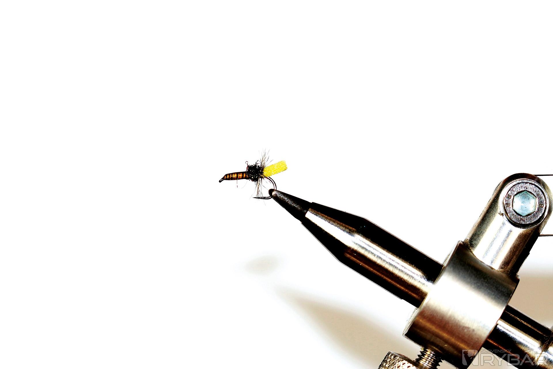 Opačne viazaný rodenec (emerger) napodobňuje larvu pakomára visiacu vo vodnej blanke. Tento vzor je viazaný opačne ako je zvykom, preto môže byť pre ryby zaujímavým, ale možno skôr pre viazača. Je potrebné si zvyknúť na trochu iný štýl viazania, potom to už ide samo. Lovíme väčšinou na jazerách, ale muška môže byť úspešná aj na tečúcej vode. Môžeme sa pohrať s dĺžkou polycelonu, dlhší kus lepšie pláva a môže slúžiť aj ako indikátor záberu.