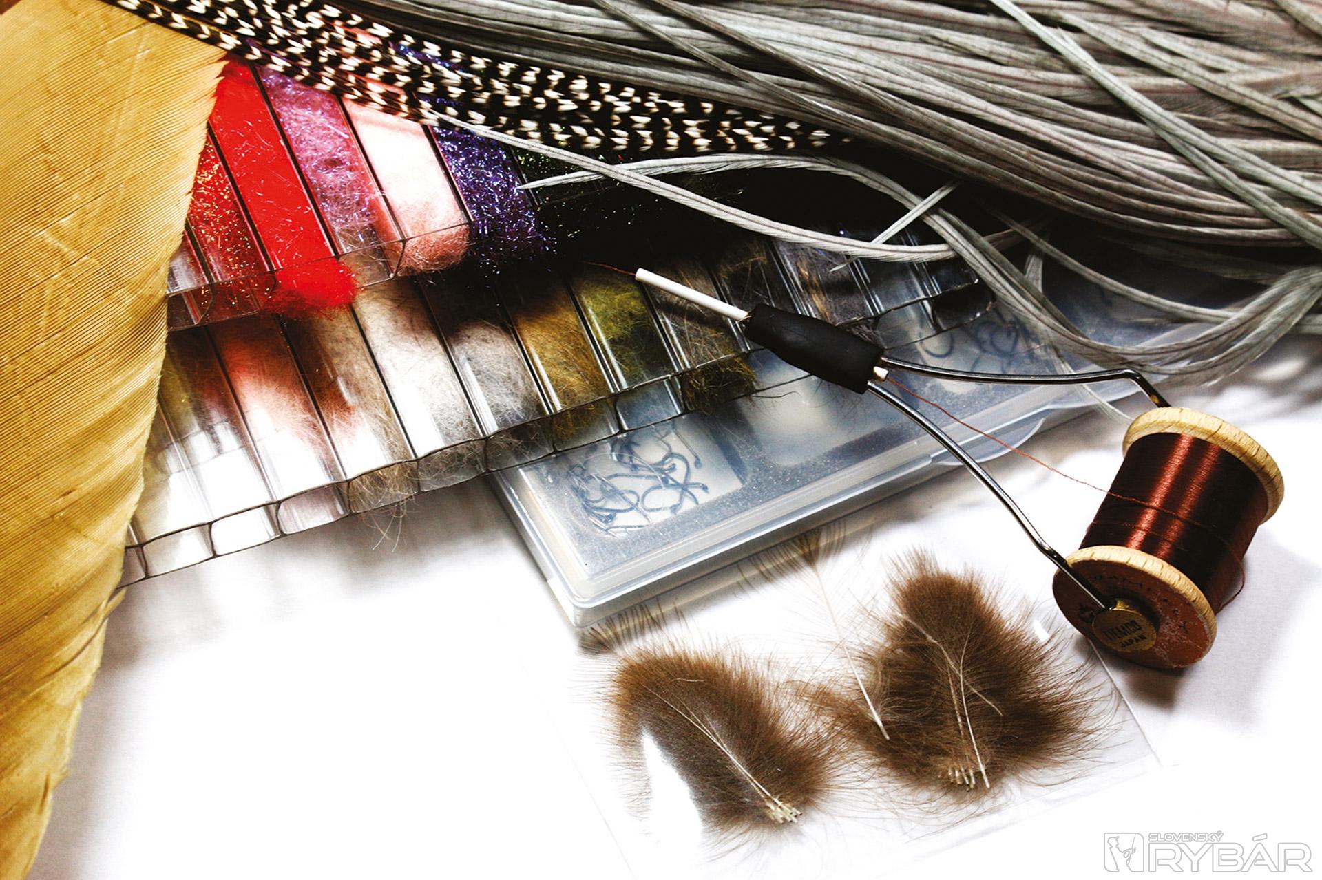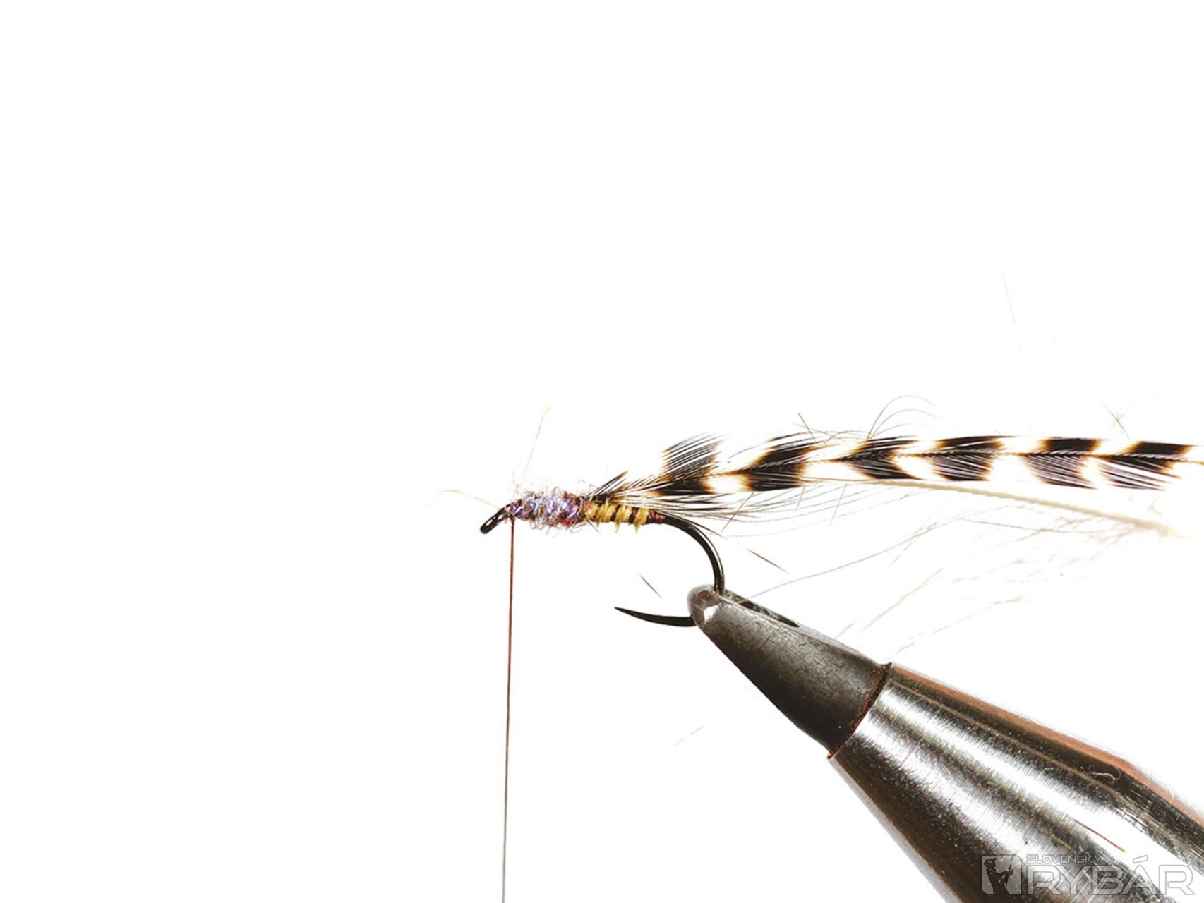 1. Háčik upneme do zveráčika a naviažeme štety z grizzly pierka.