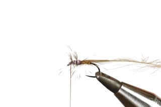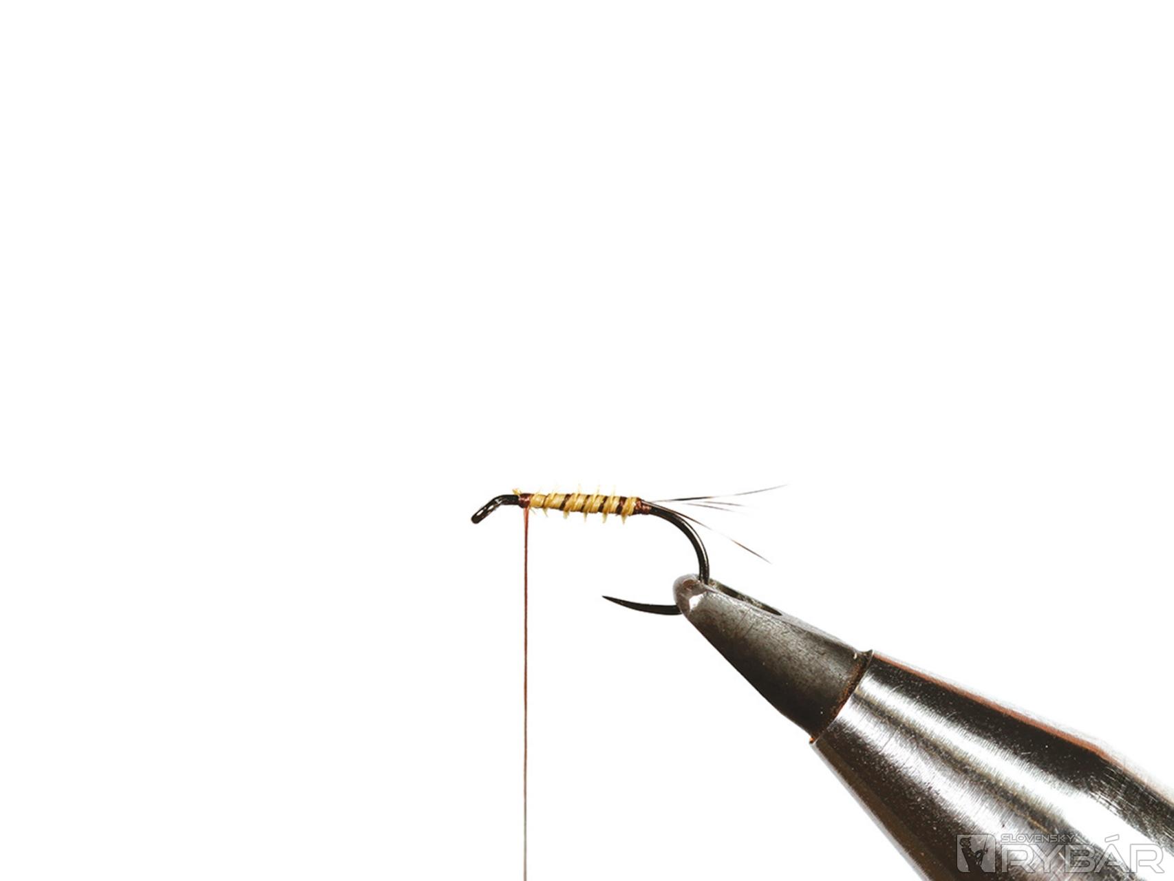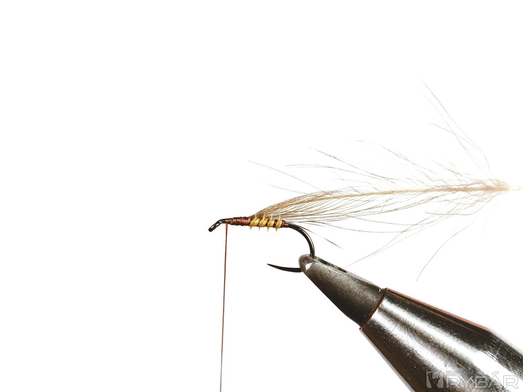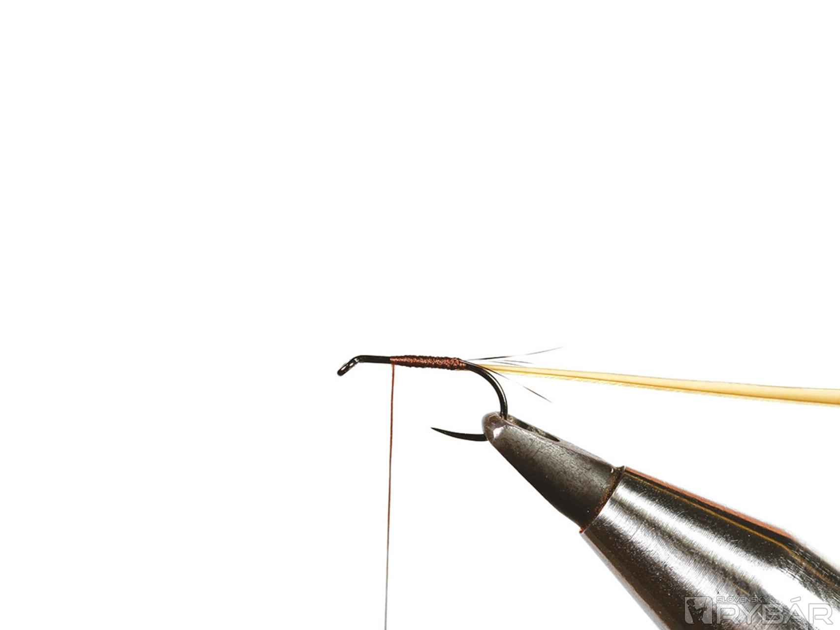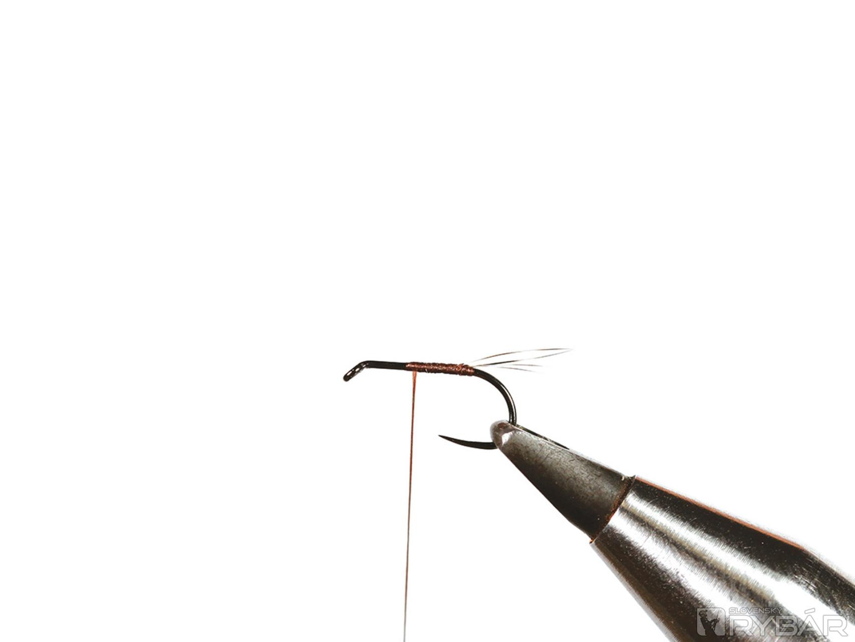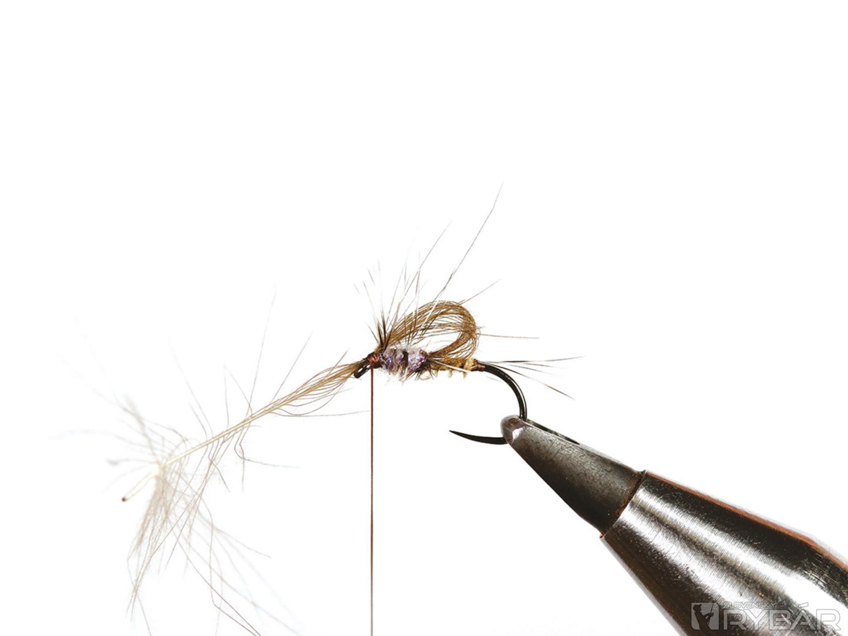 Tento vzor reprezentuje štádium, keď sa podenky dostanú ku hladine, tesne pred vyvlečením. Je dobré ho mať, keď ryby „mľaskajú“ v povrchovom filme. Použil som iba jedno CDC pierko, pretože aj nožičky zhotovené z grizzly pierka trochu pomôžu pri udržaní mušky pod hladinou. Lovíme s jednou muškou na nadväzci.