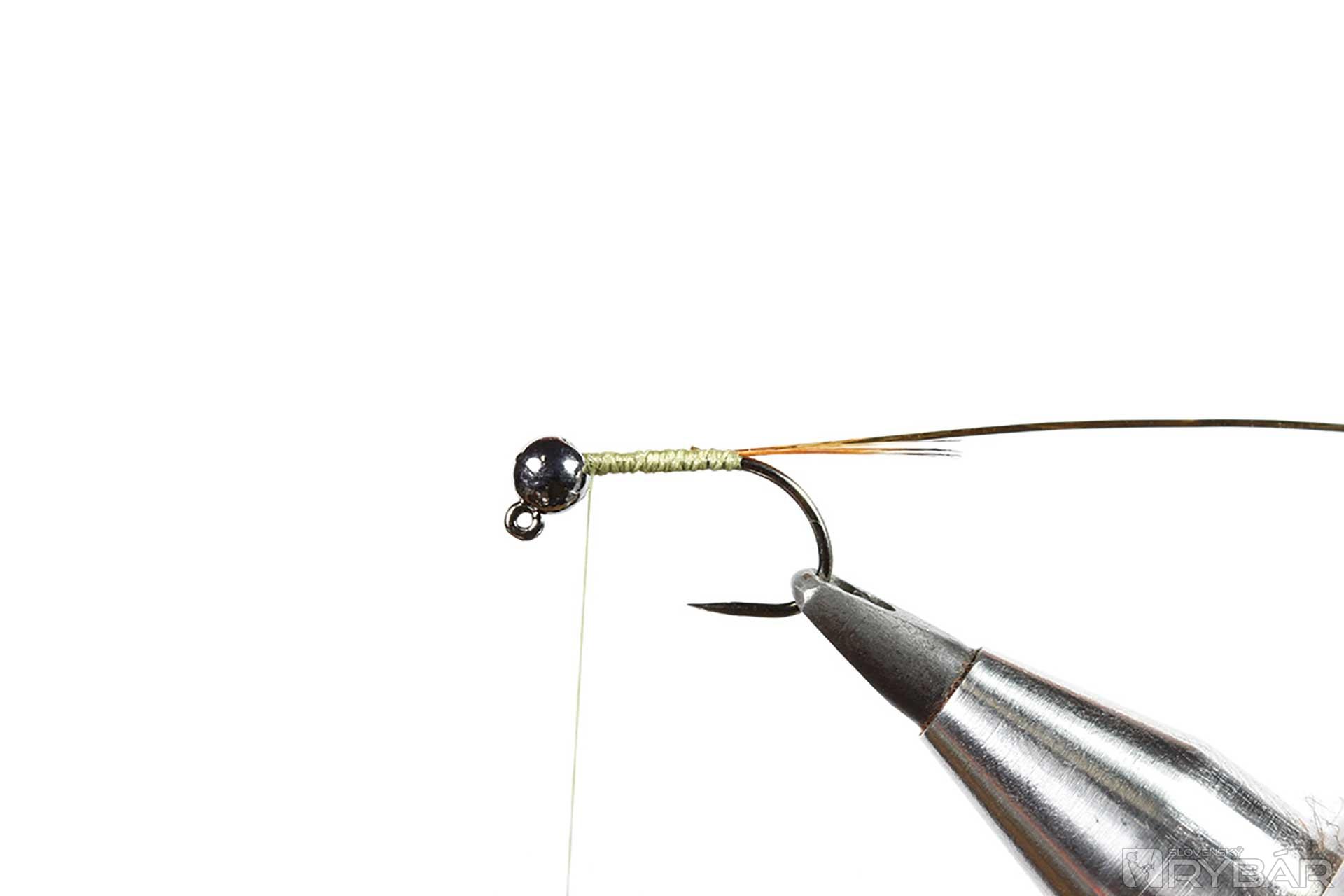 Jigový háčik, volfrámová guľôčka, olivová viazacia niť, zlatá lametka, hrdzavé perie zo sliepky, zelený dabing, CDC pierko, oranžovo-zelený spectra dabing.